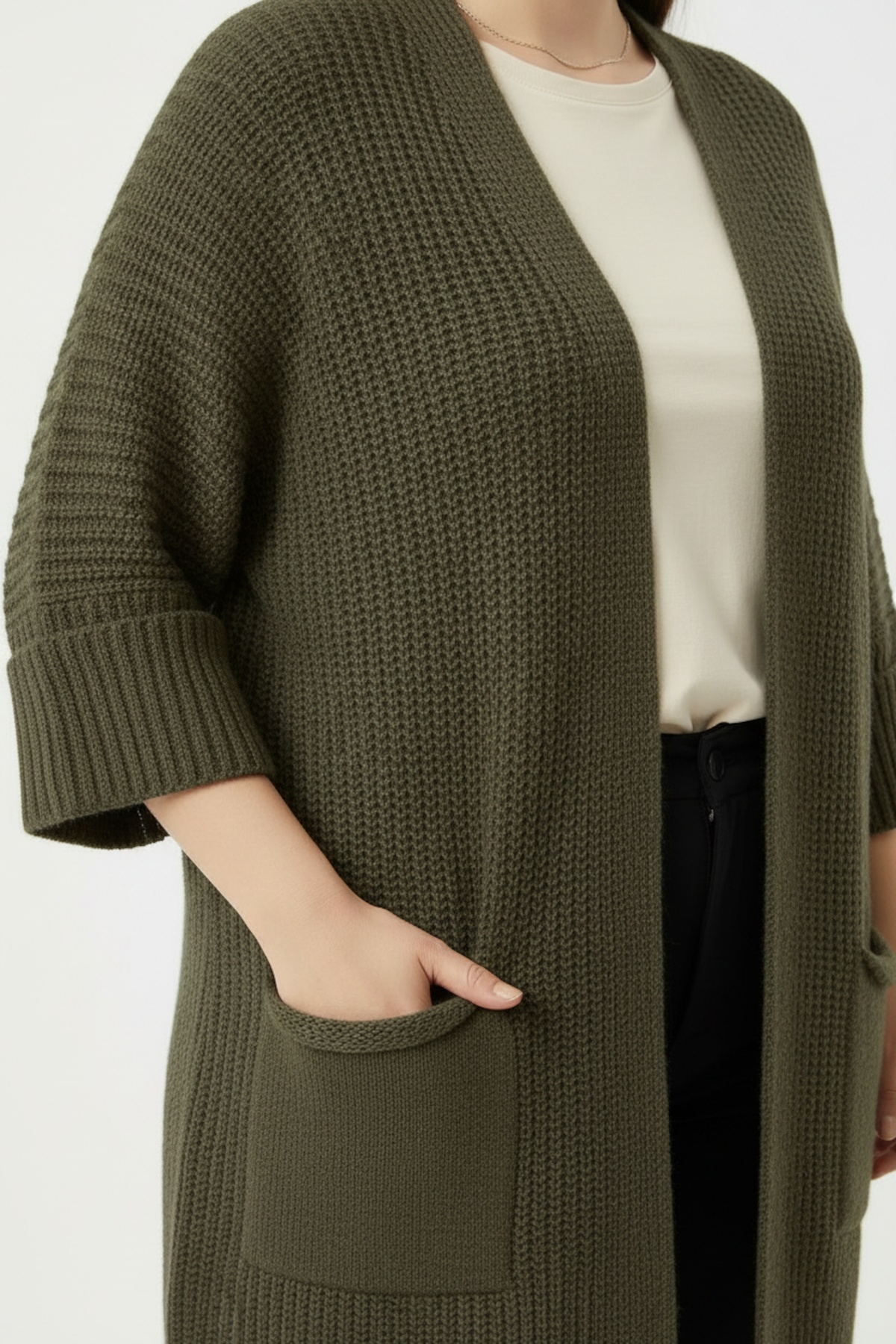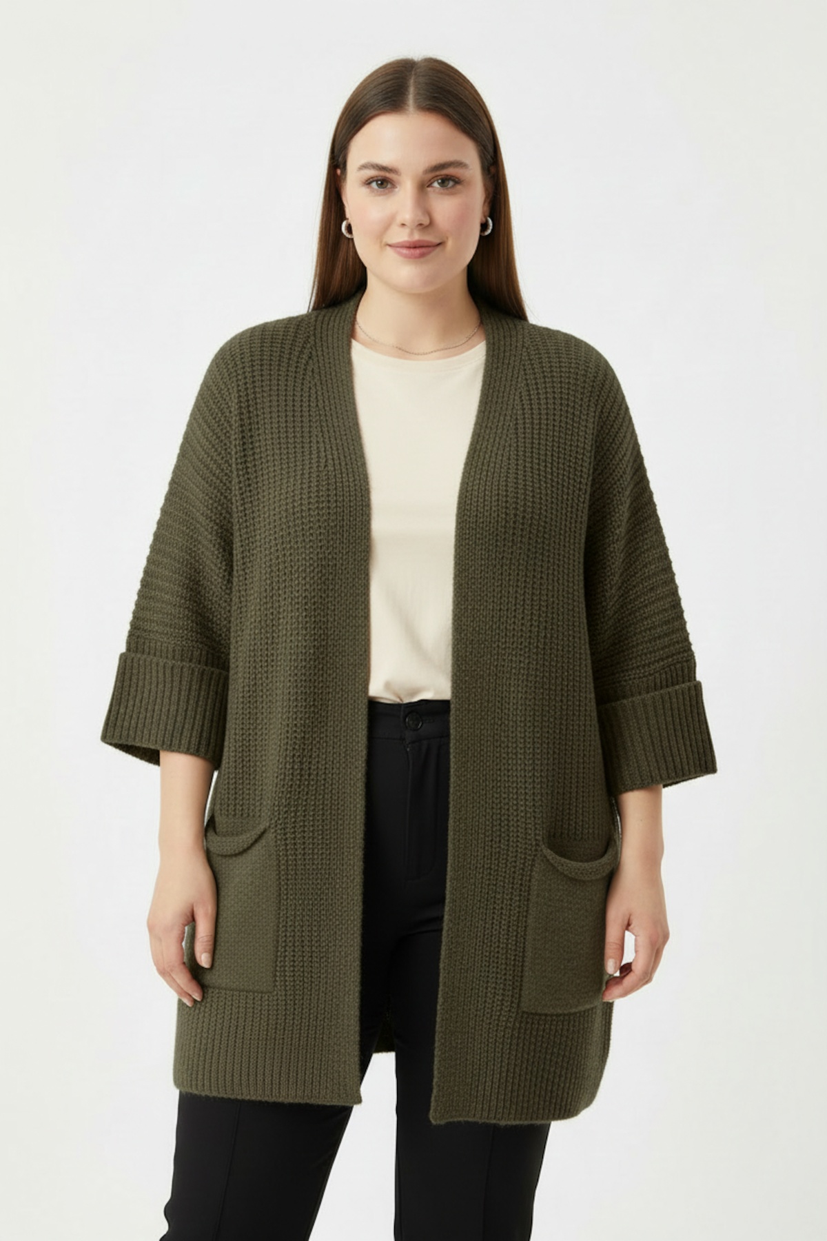 Büyük beden kesimi sayesinde rahat oturan bu hırka, triko dokusuyla sıcak tutar ve şık bir görünüm sunar. Krem tişört ve koyu kot ile günlük kombinler yapabilir, cep detayları ile hem pratik hem de zarif bir görünüm elde edebilirsiniz. Hem evde hem de dışarıda rahatlıkla tercih edebileceğiniz zamansız bir parça.