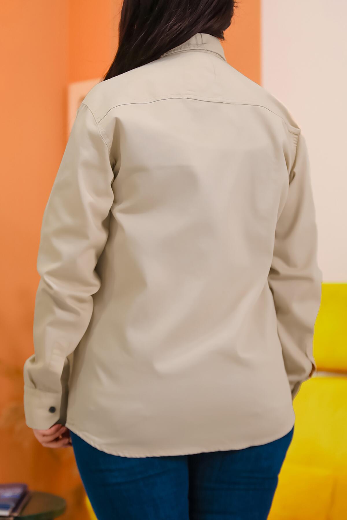 Büyük Beden Çıt Çıt Düğmeli Önden Cepli Gömlek Bej