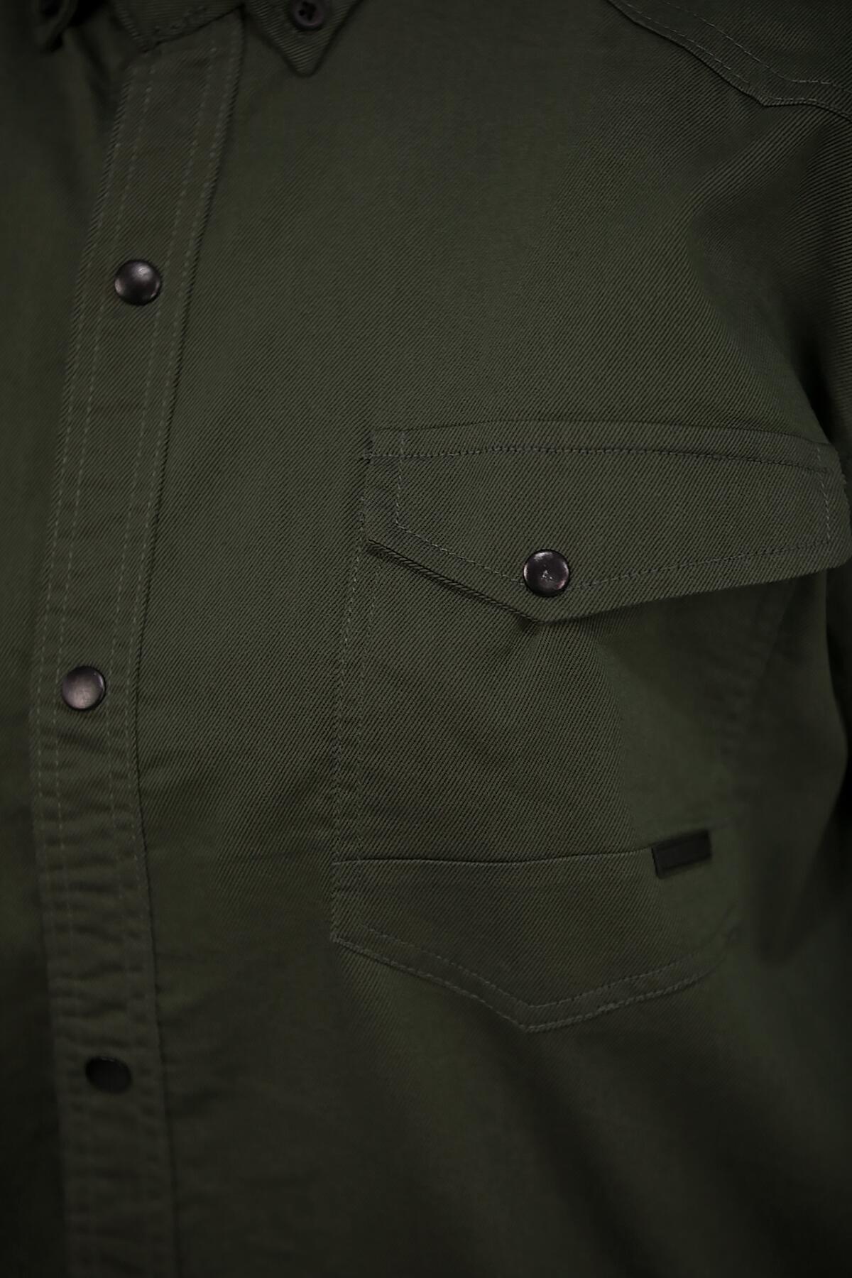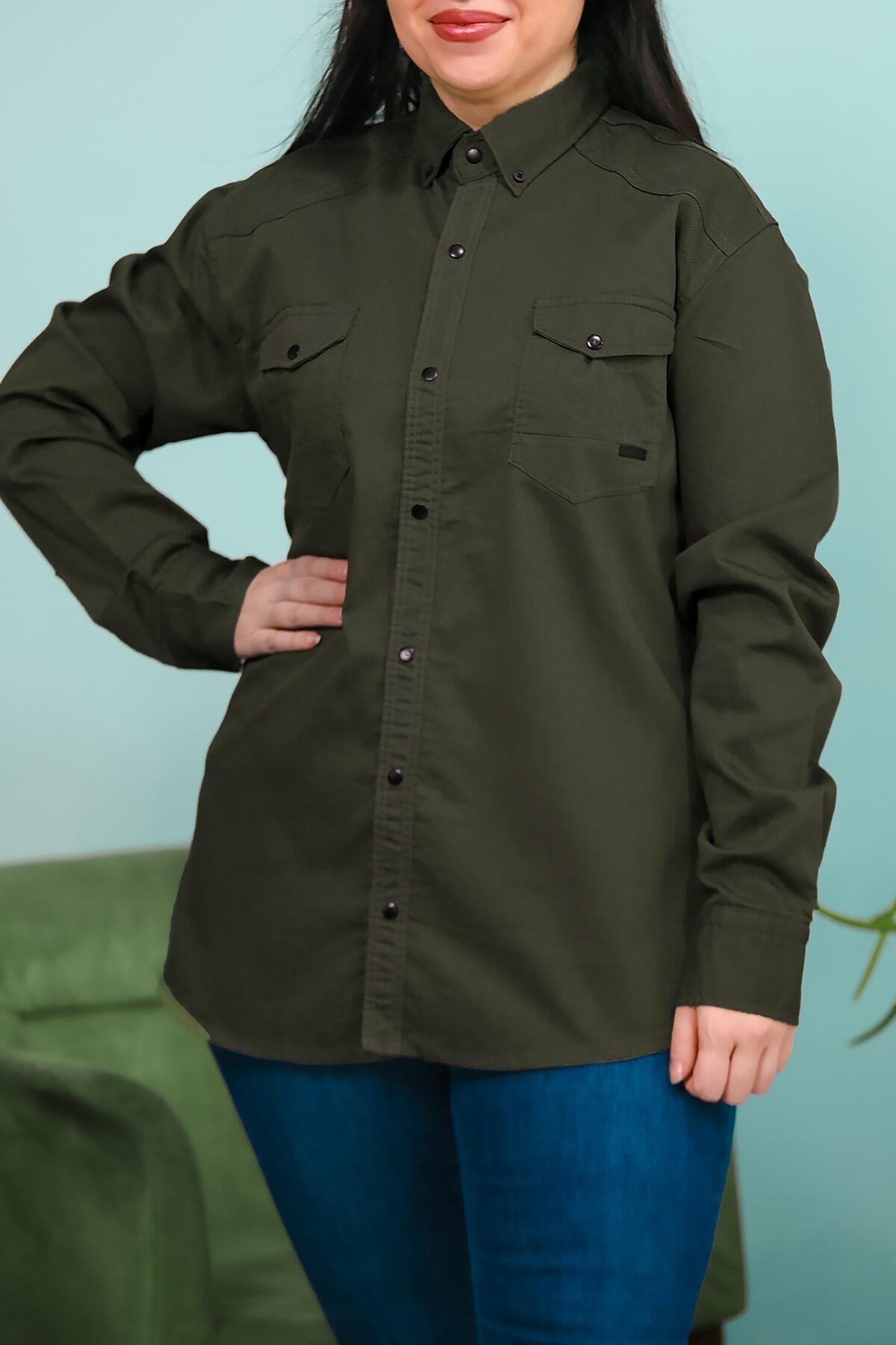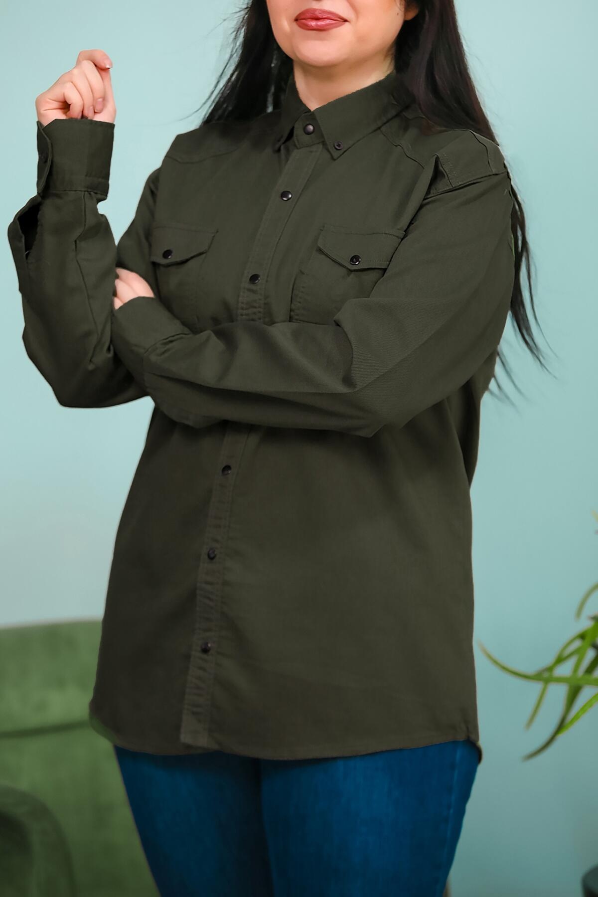 Büyük Beden Çıt Çıt Düğmeli Önden Cepli Gömlek Haki Haki