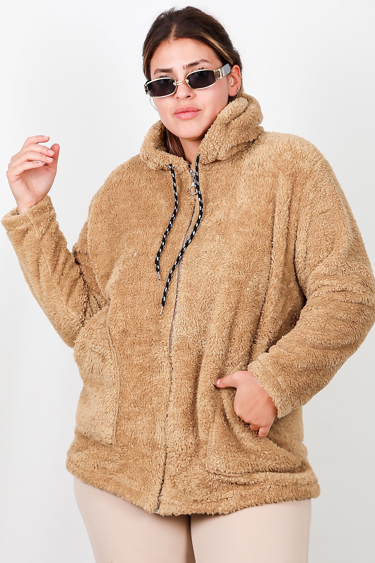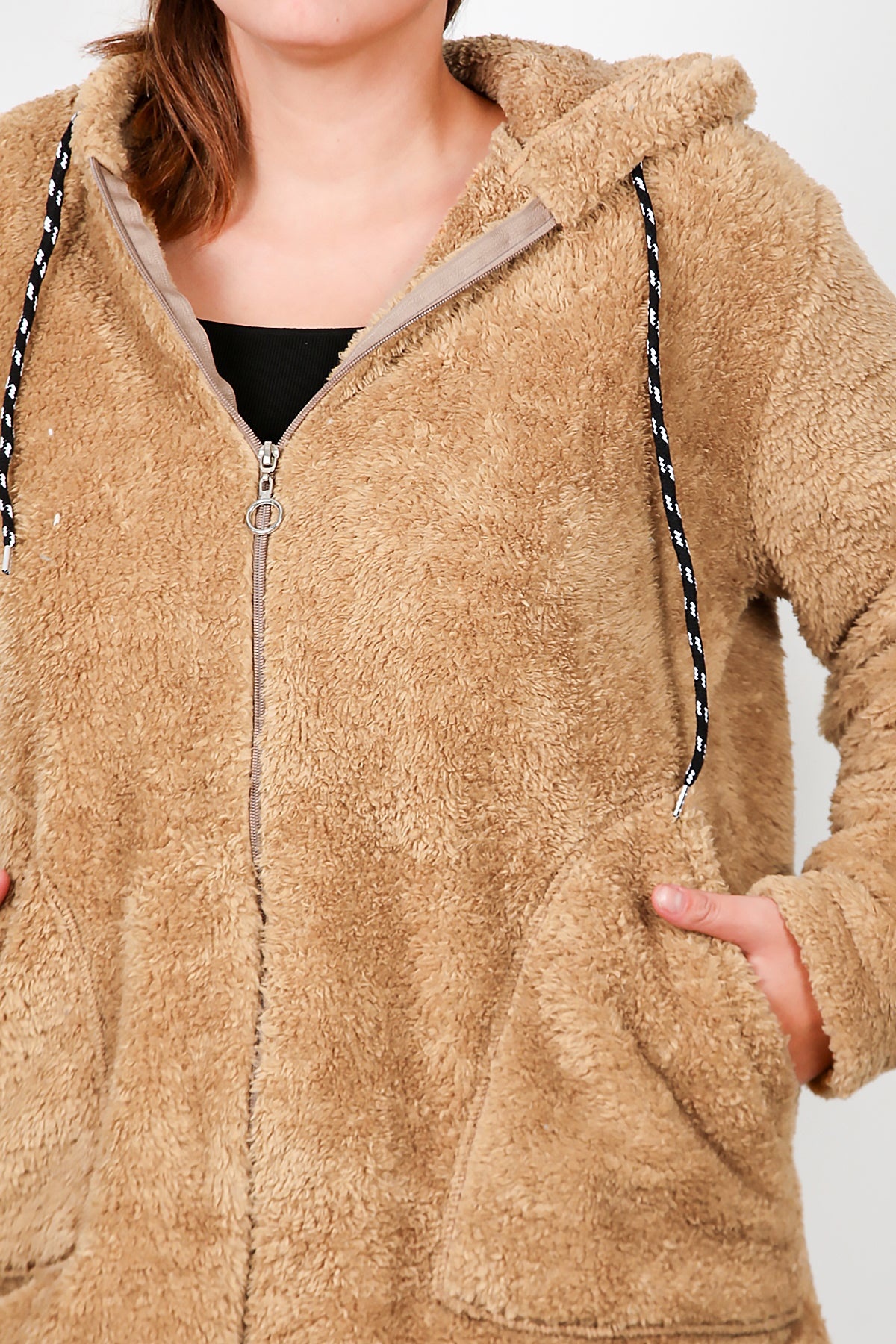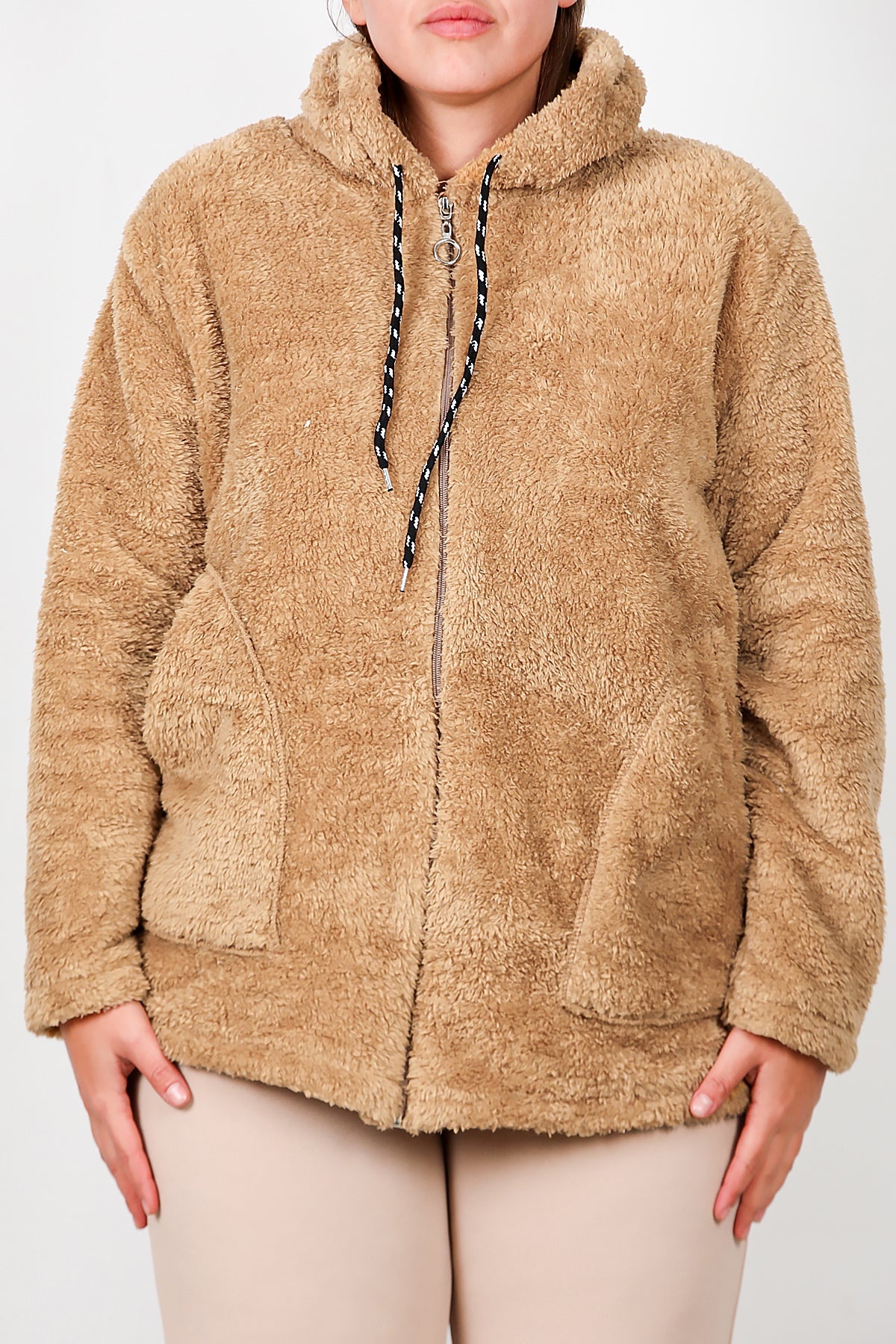 Büyük Beden Kapşonlu Fermuarlı Peluş Ceket Bej