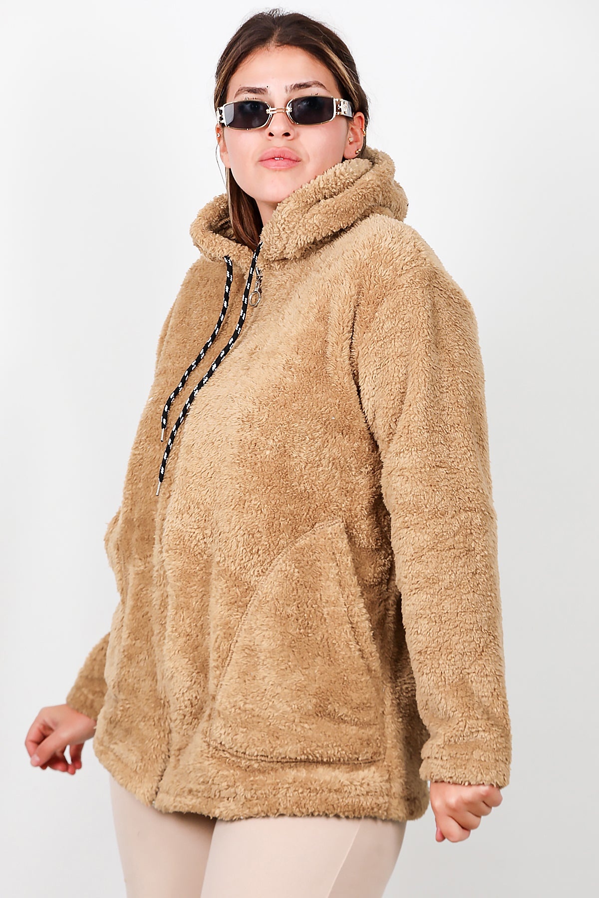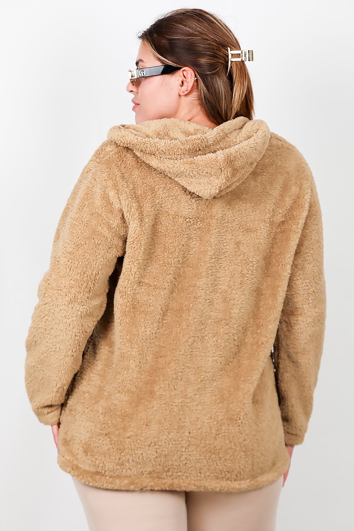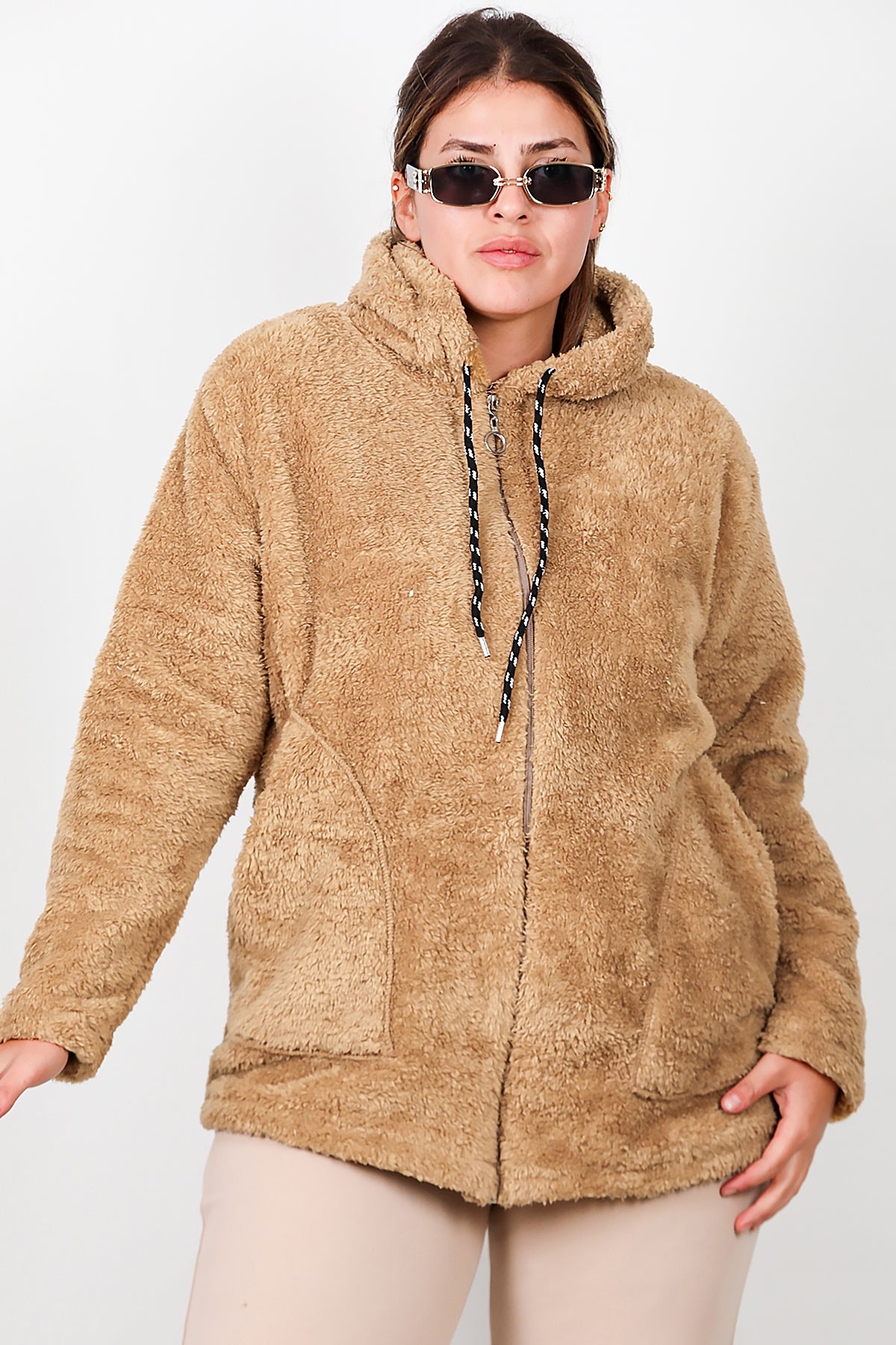 Büyük Beden Kapşonlu Fermuarlı Peluş Ceket Bej