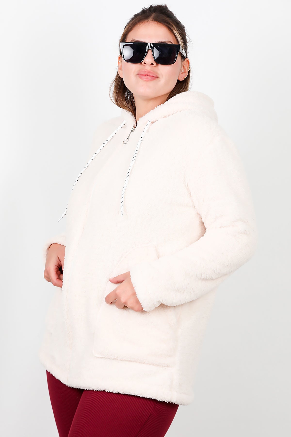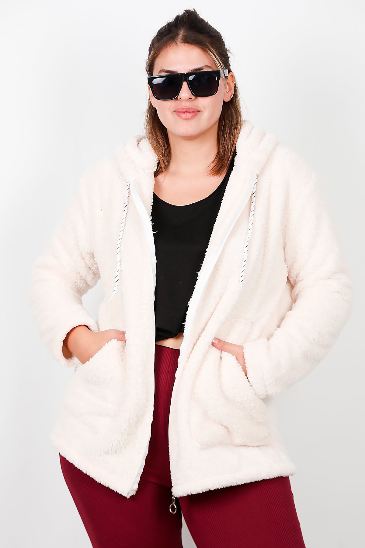 Büyük Beden Kapşonlu Fermuarlı Peluş Ceket Ekru