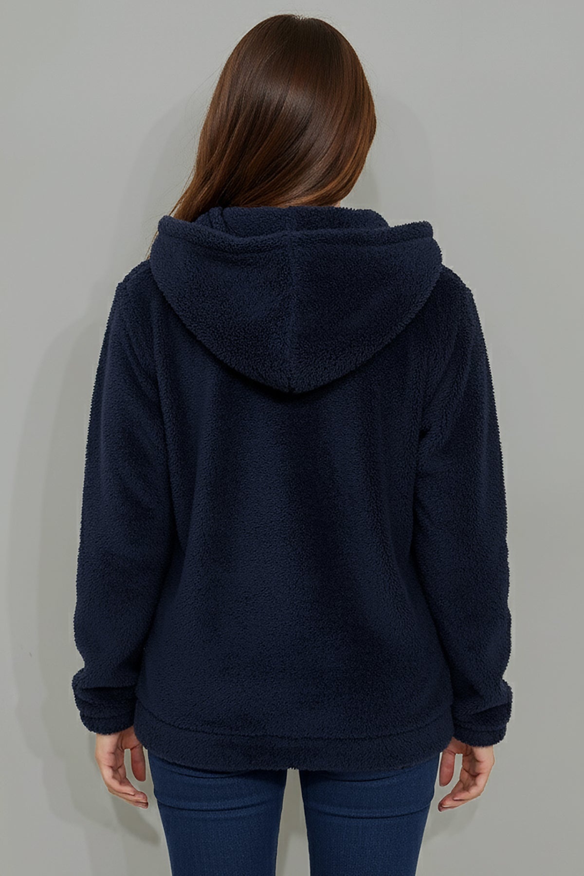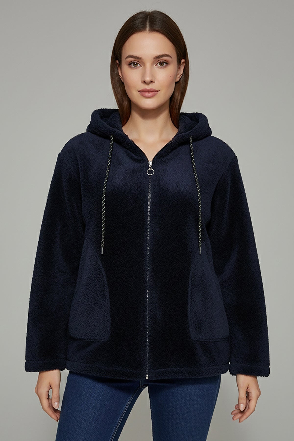 Büyük Beden Kapşonlu Fermuarlı Peluş Ceket Lacivert