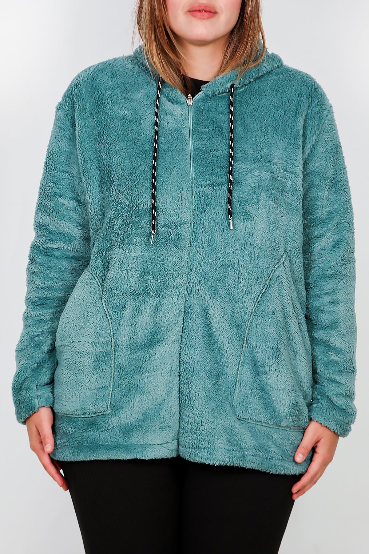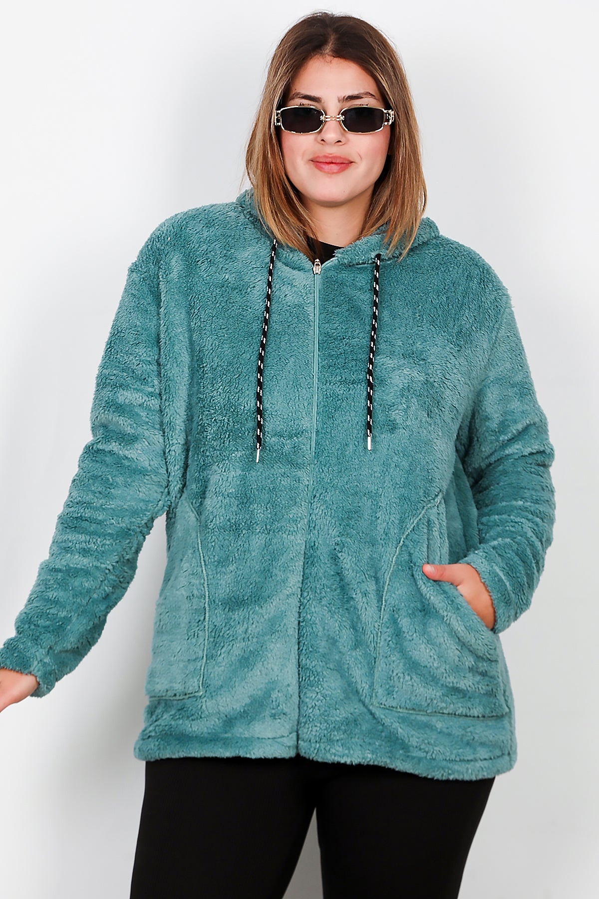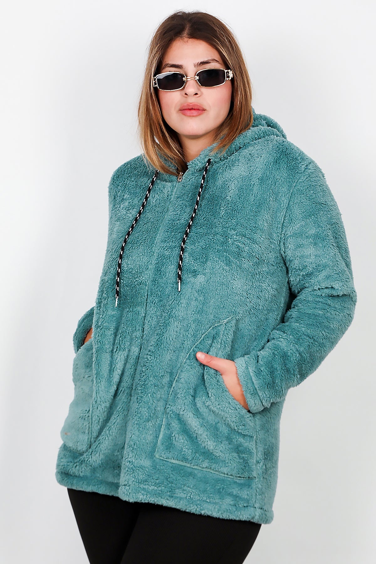 Büyük Beden Kapşonlu Fermuarlı Peluş Ceket Mint