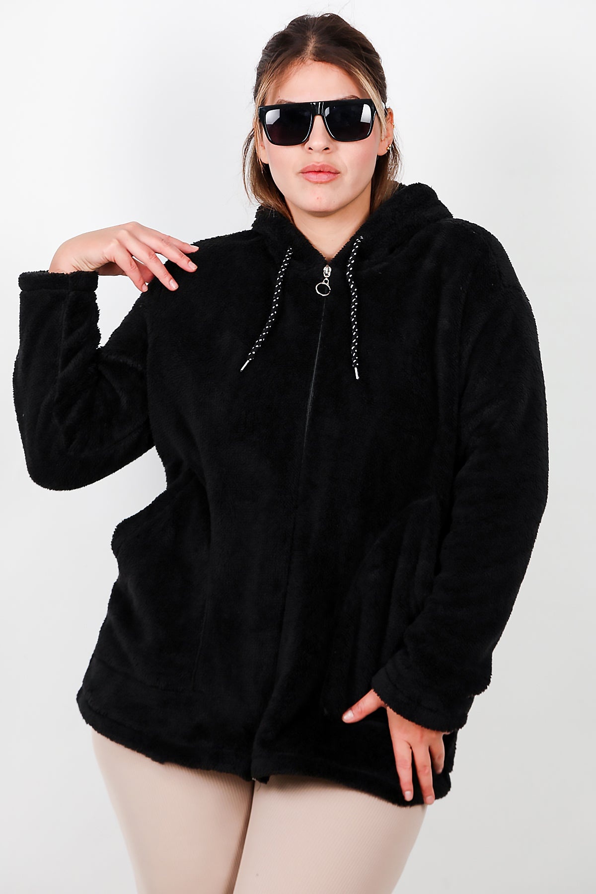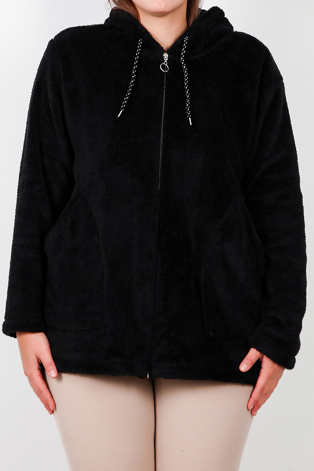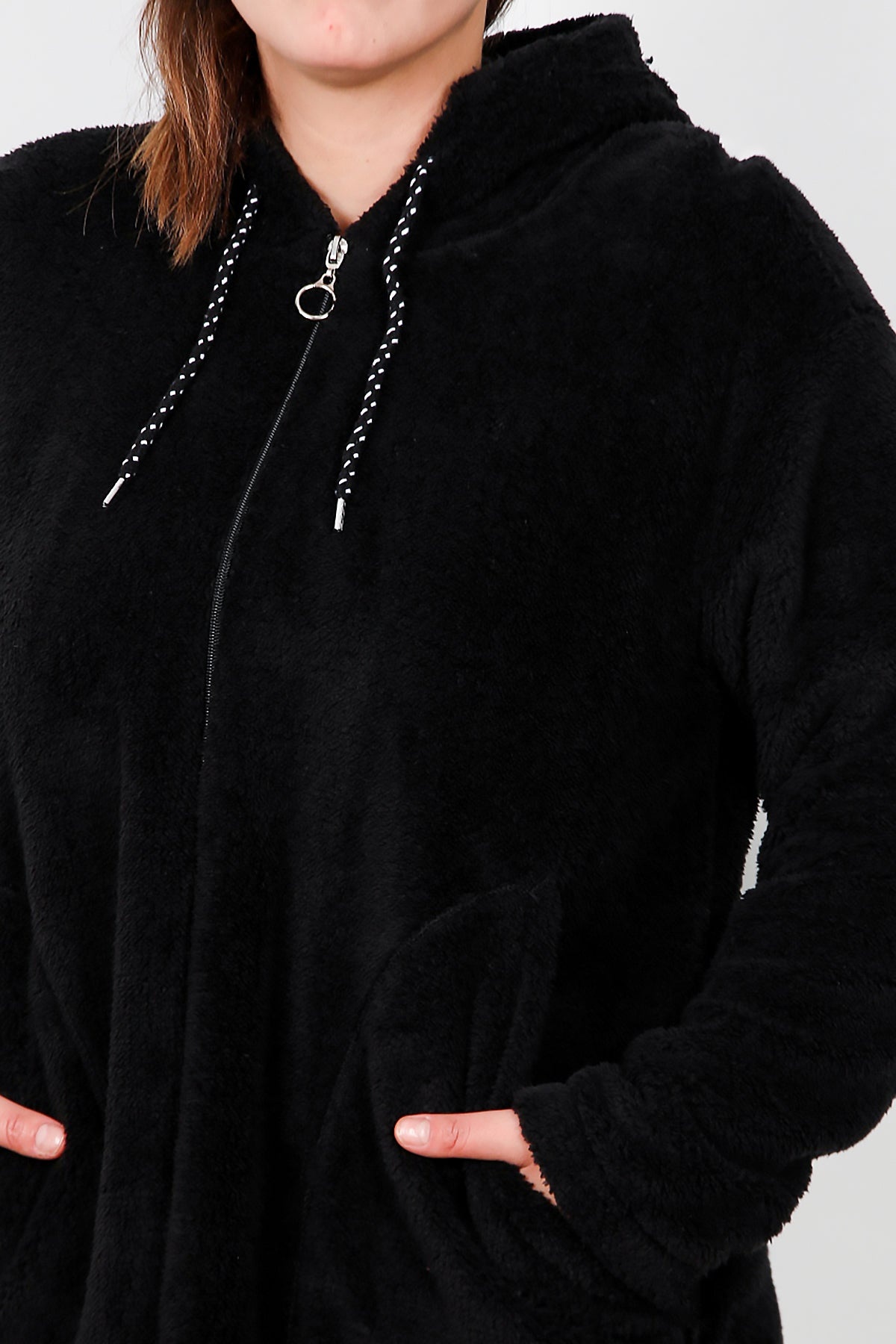 Büyük Beden Kapşonlu Fermuarlı Peluş Ceket Siyah