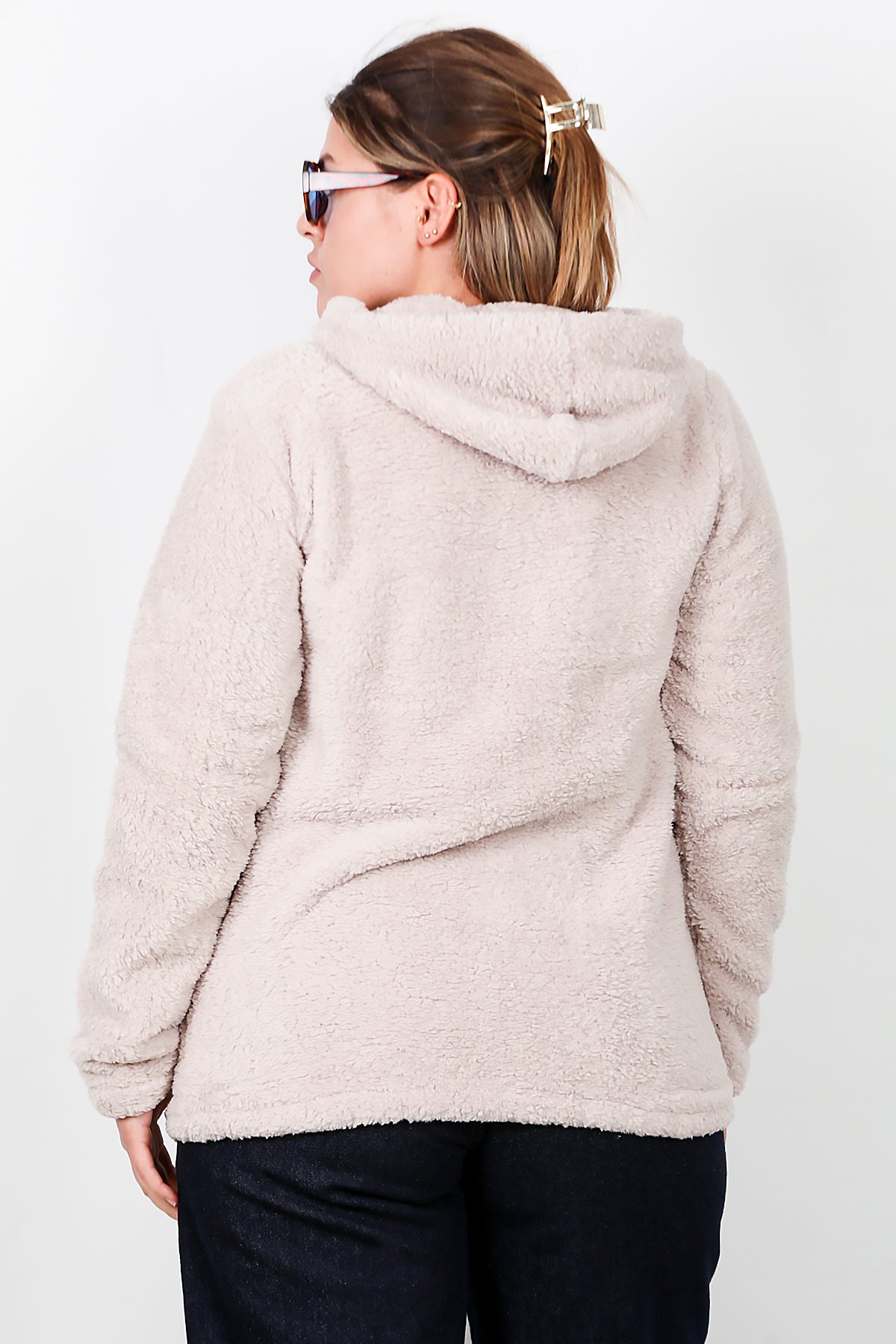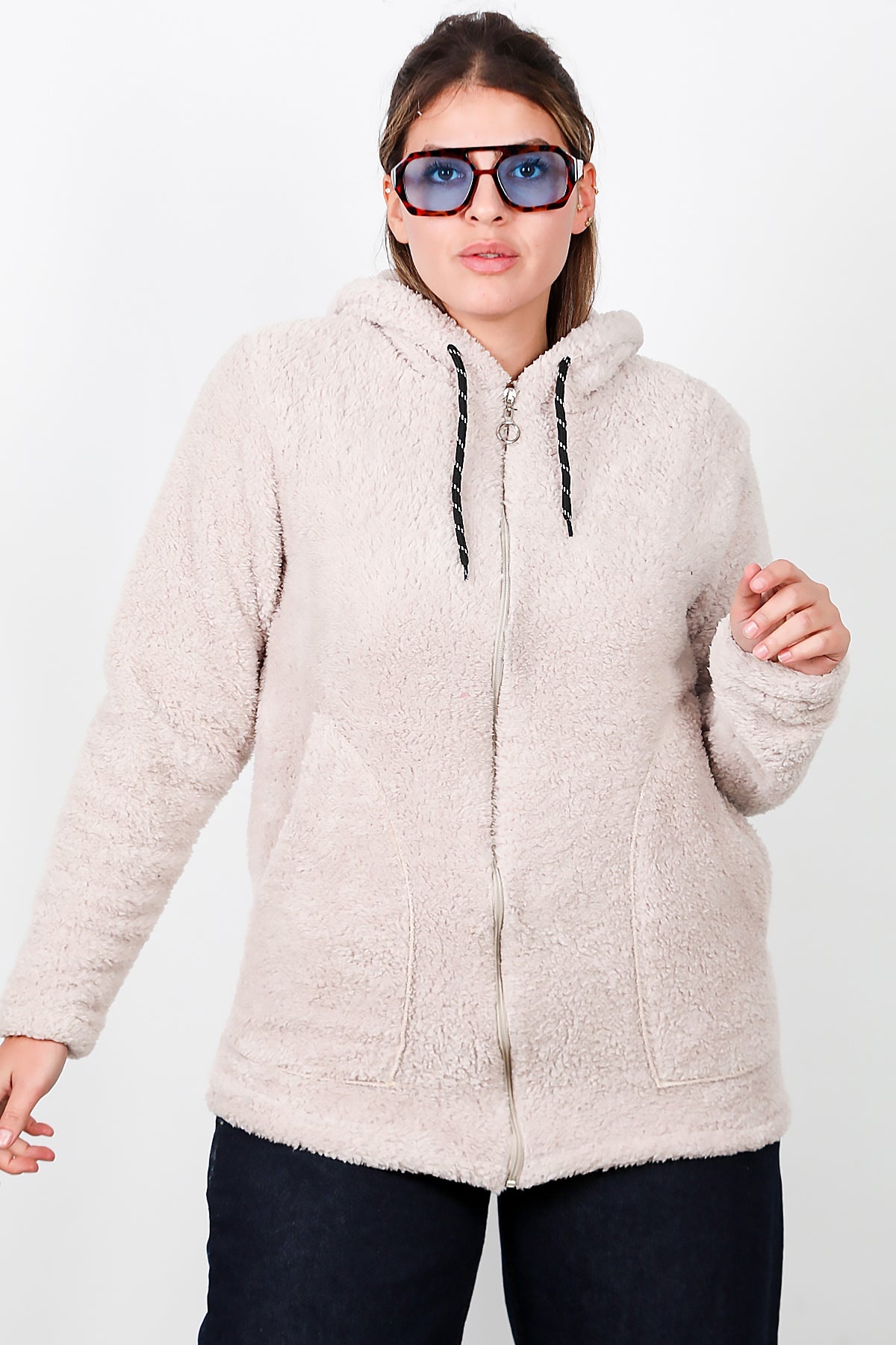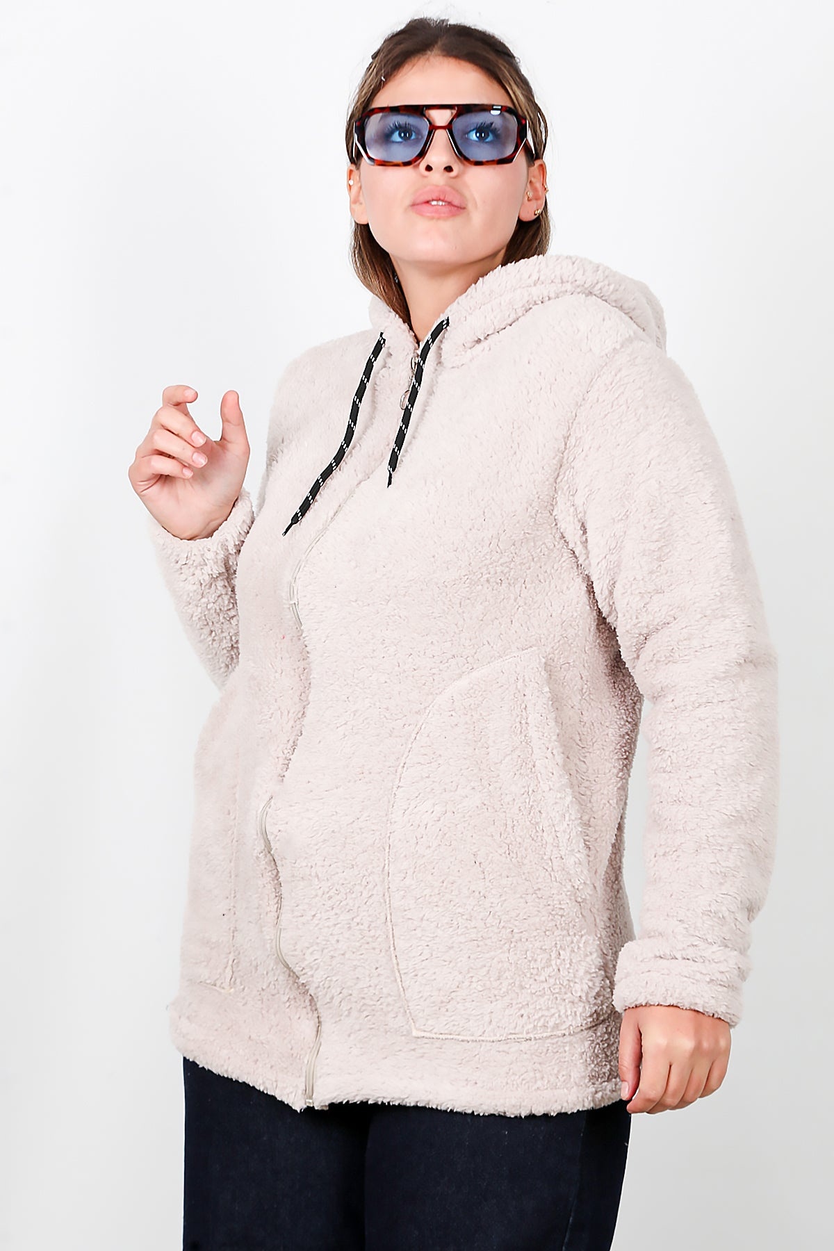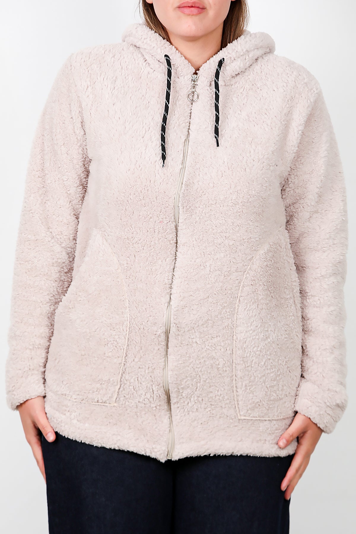 Büyük Beden Kapşonlu Fermuarlı Peluş Ceket Taş