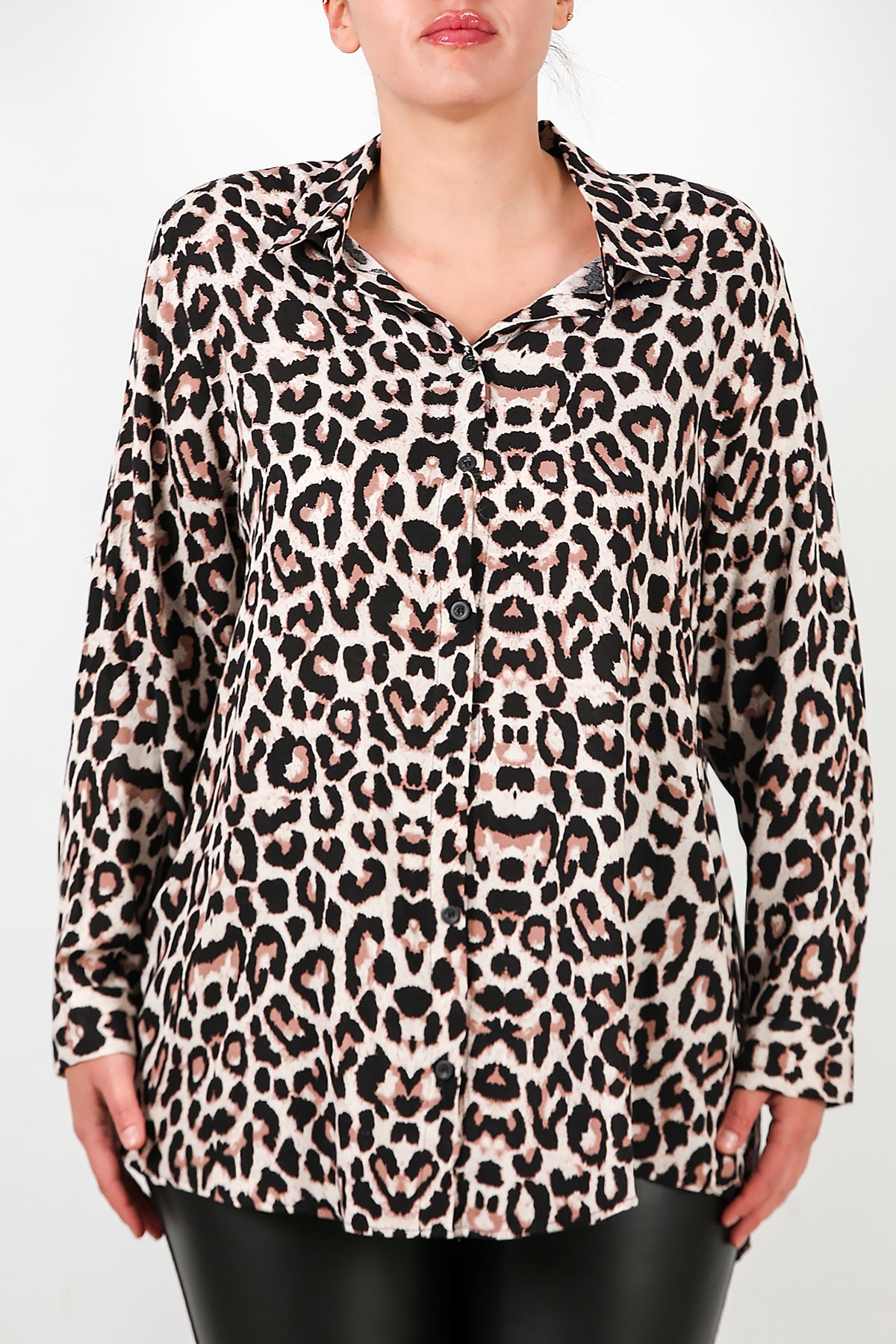 Büyük Beden Kol Katlamalı Gömlek Leopar Leopar