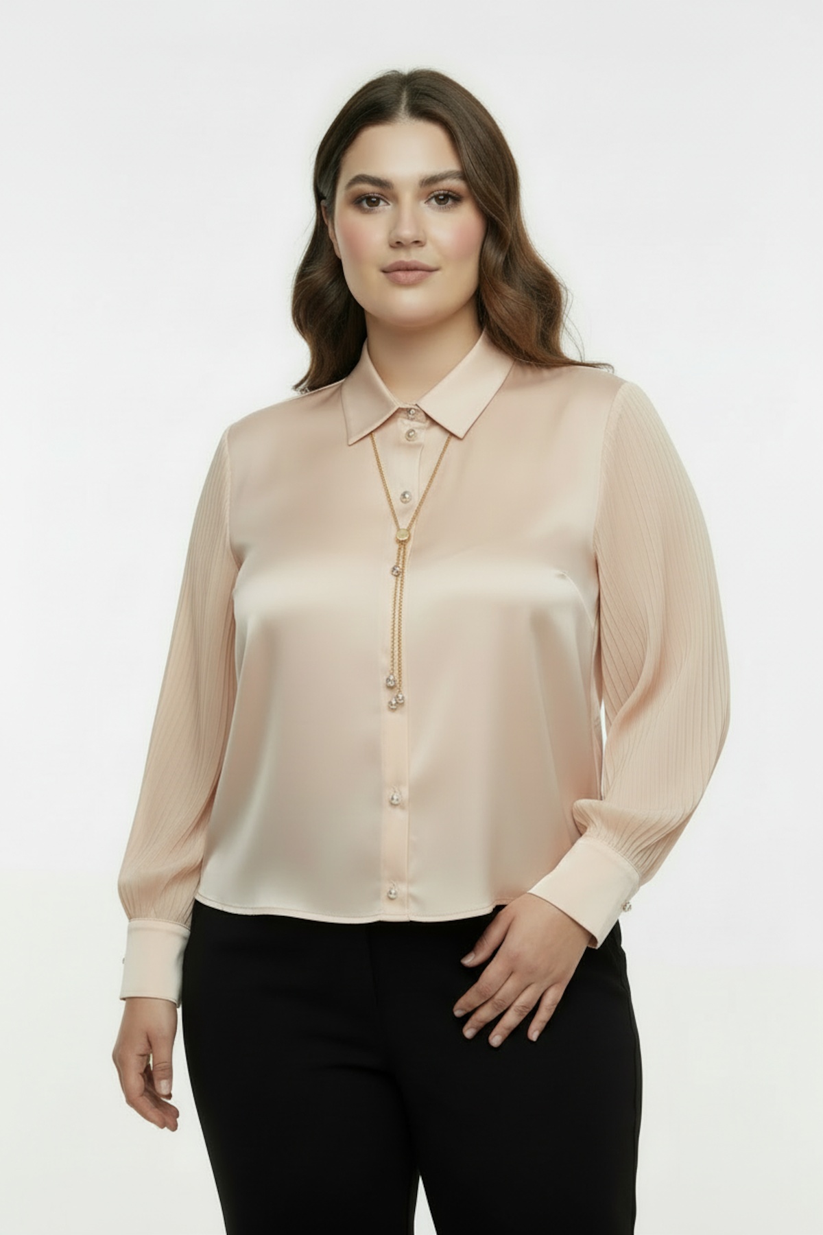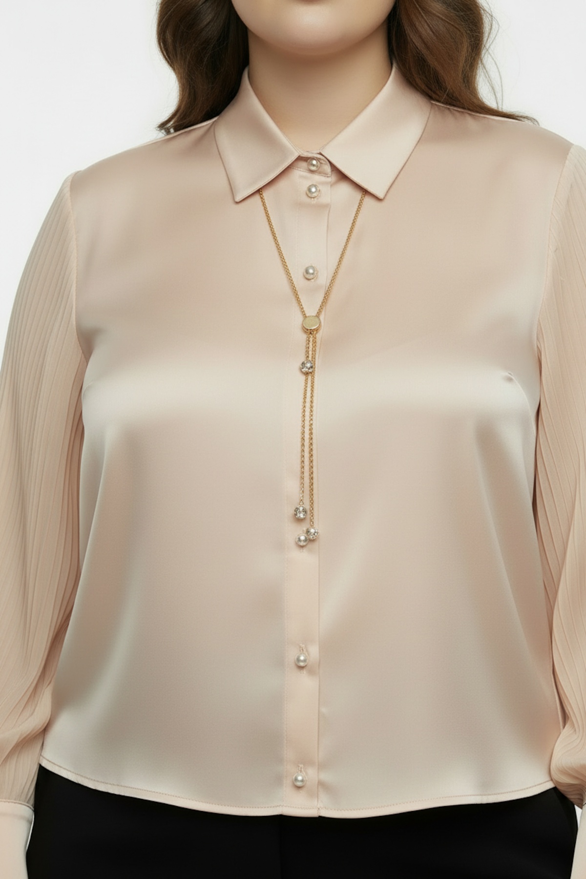 Zarafet ve şıklığın buluştuğu bu krem saten gömlek, gardırobunuzun en değerli parçalarından biri olacak! Yumuşak saten kumaşı ve zarif krem tonu ile her ortamda göz kamaştıran bu gömlek, kristal düğme detayları ve pileli kol manşetleriyle lüks bir görünüm sunuyor.