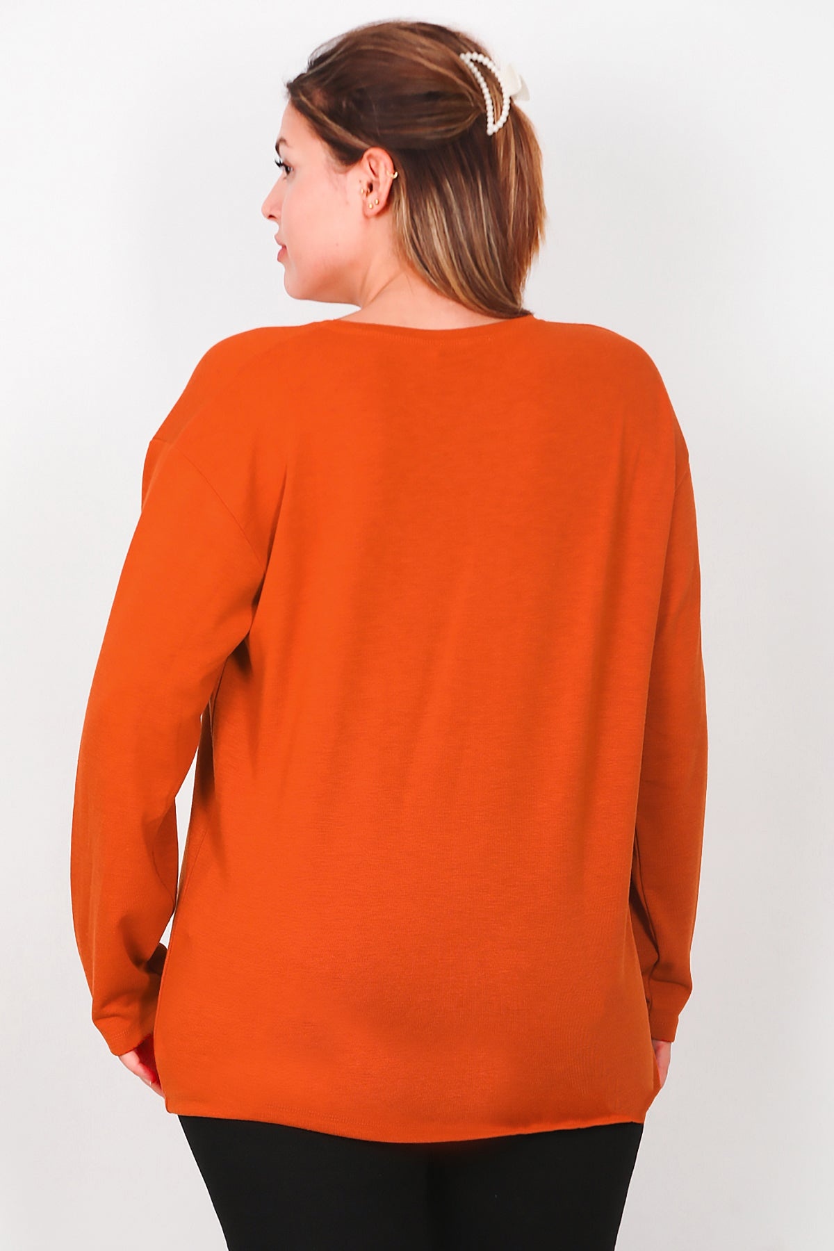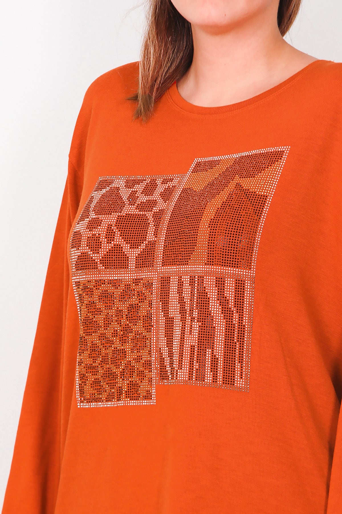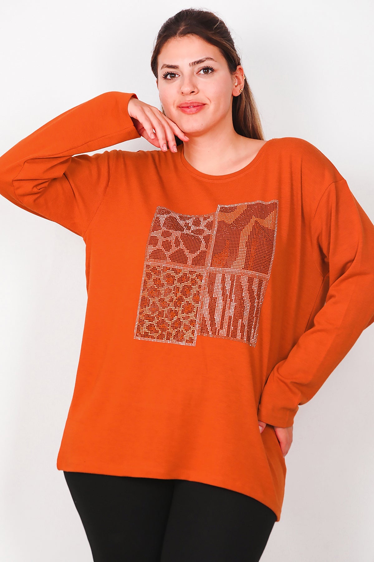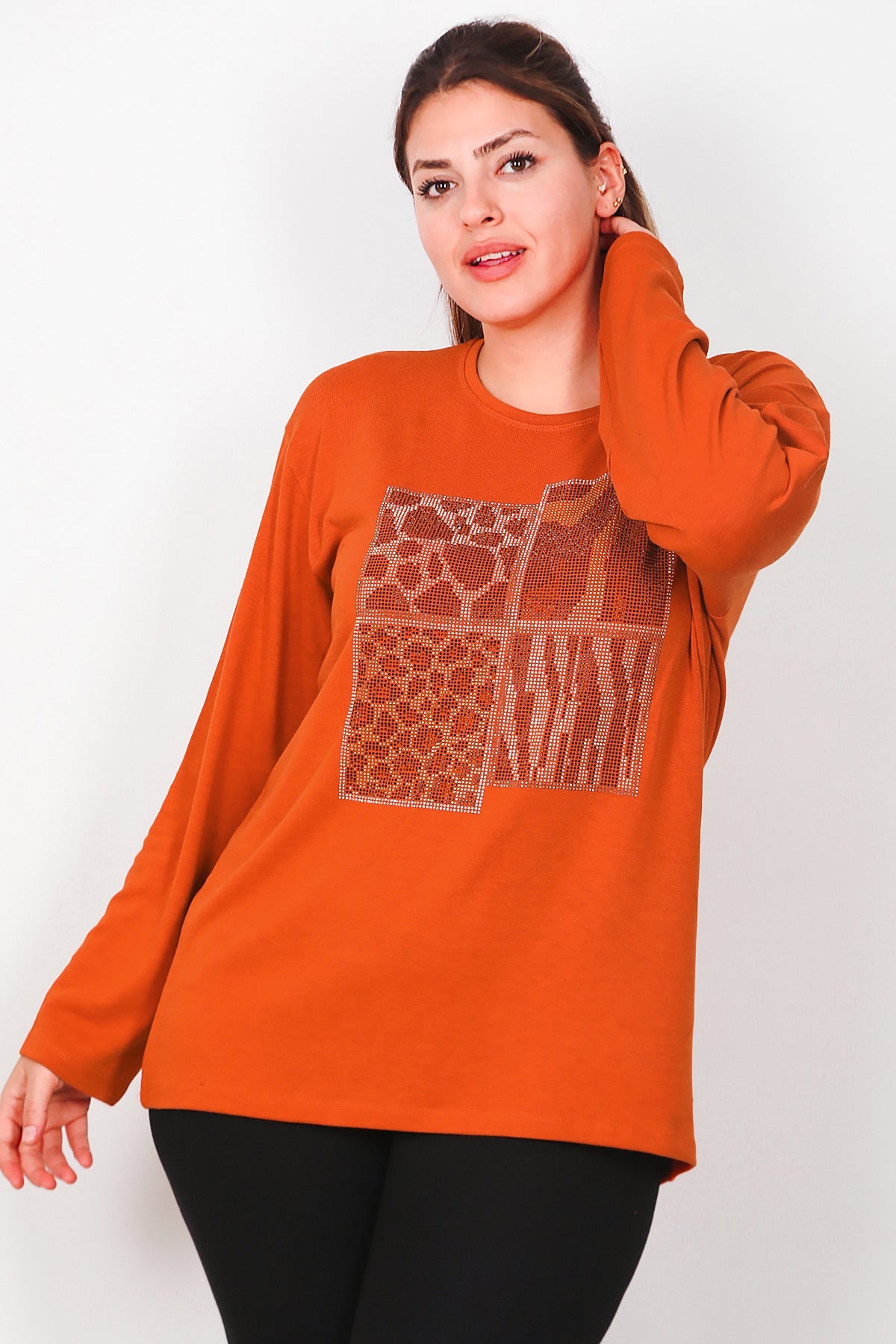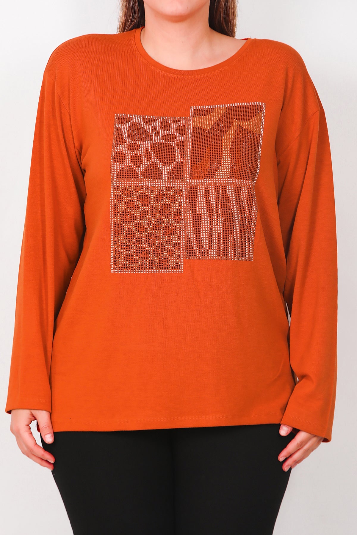 Büyük Beden Leopar Taşlı Uzun Kol Bluz Kiremit