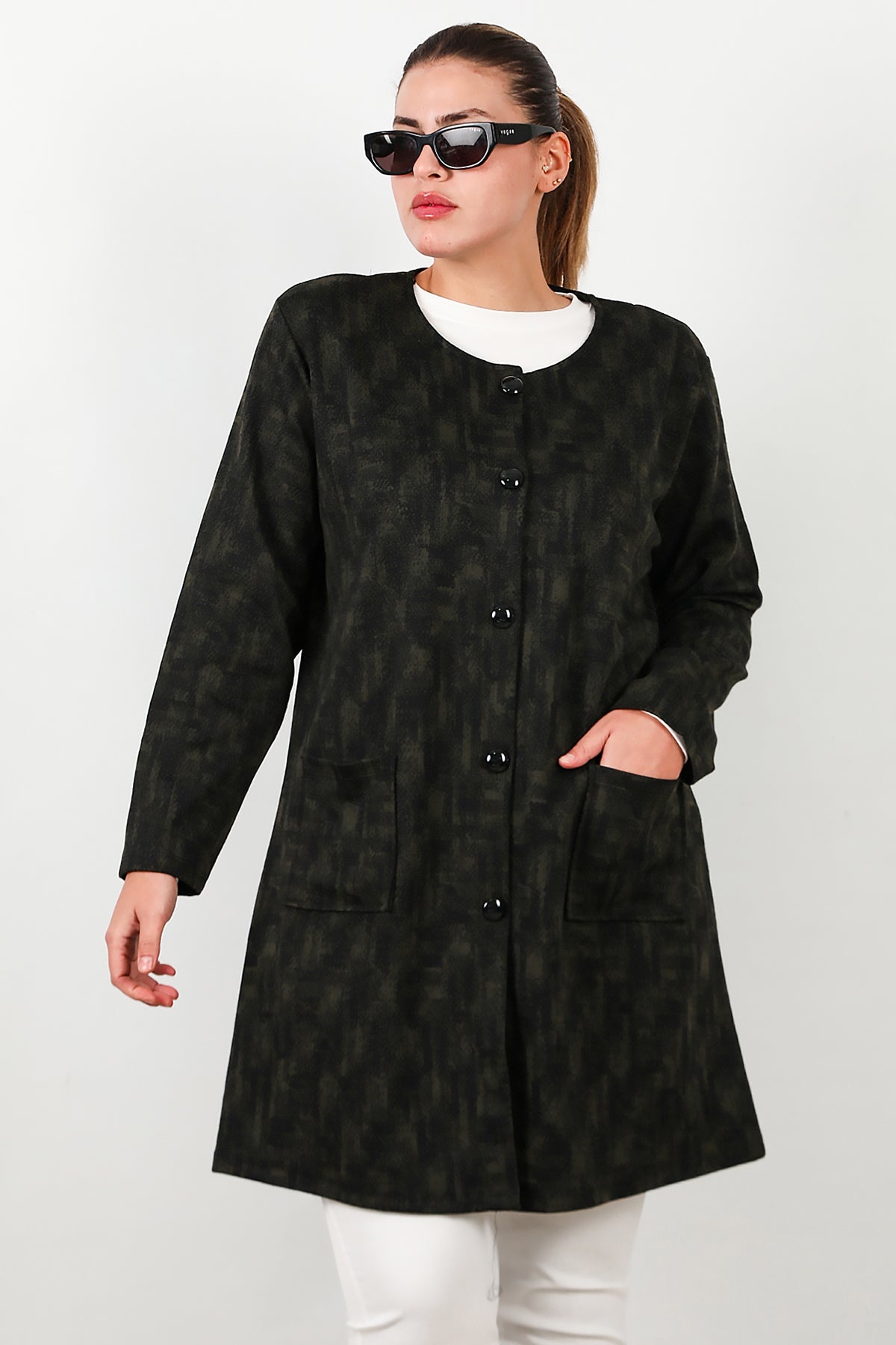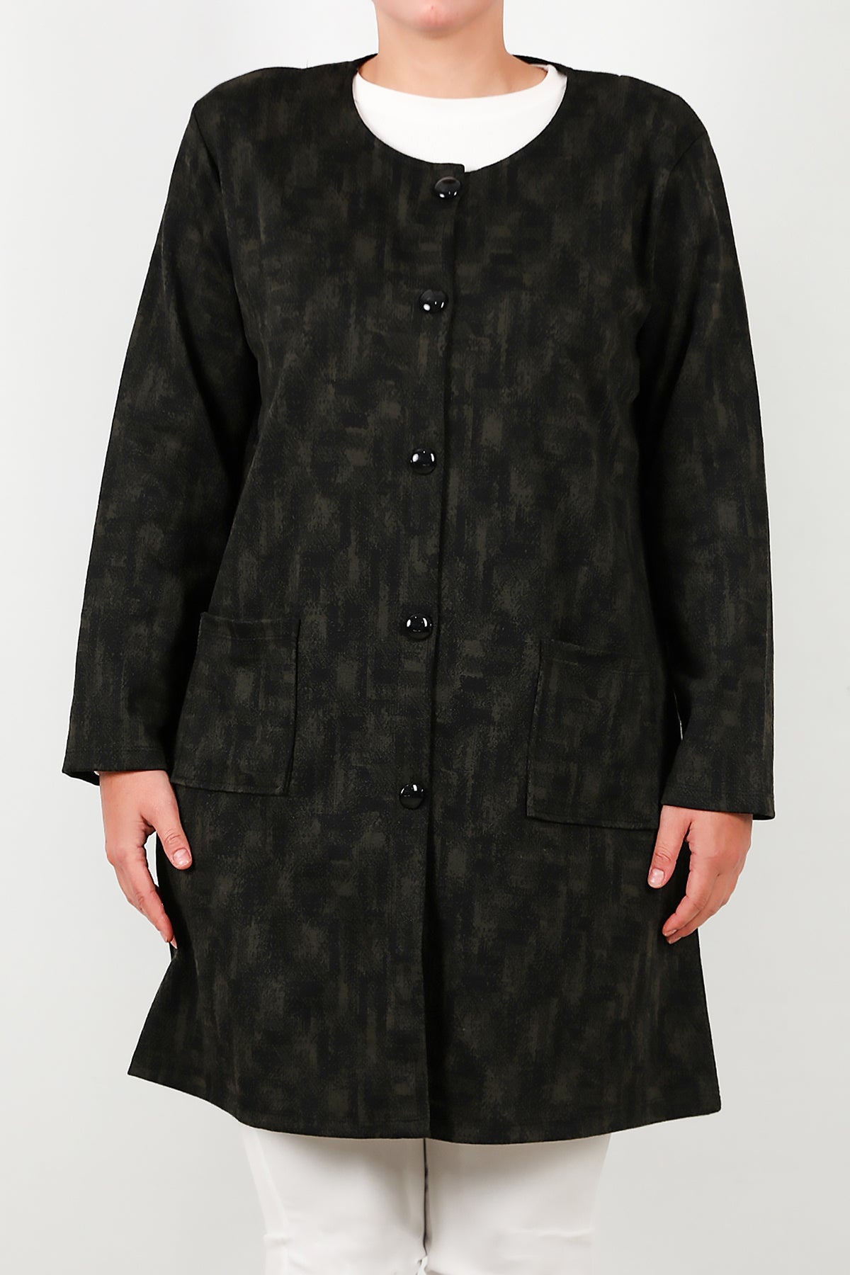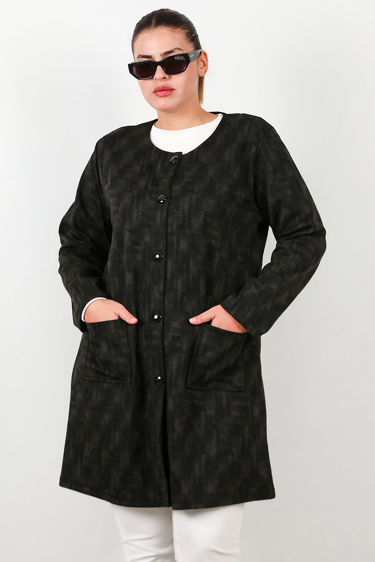 Büyük Beden Likralı Önü Düğmeli Cepli Ceket Haki
