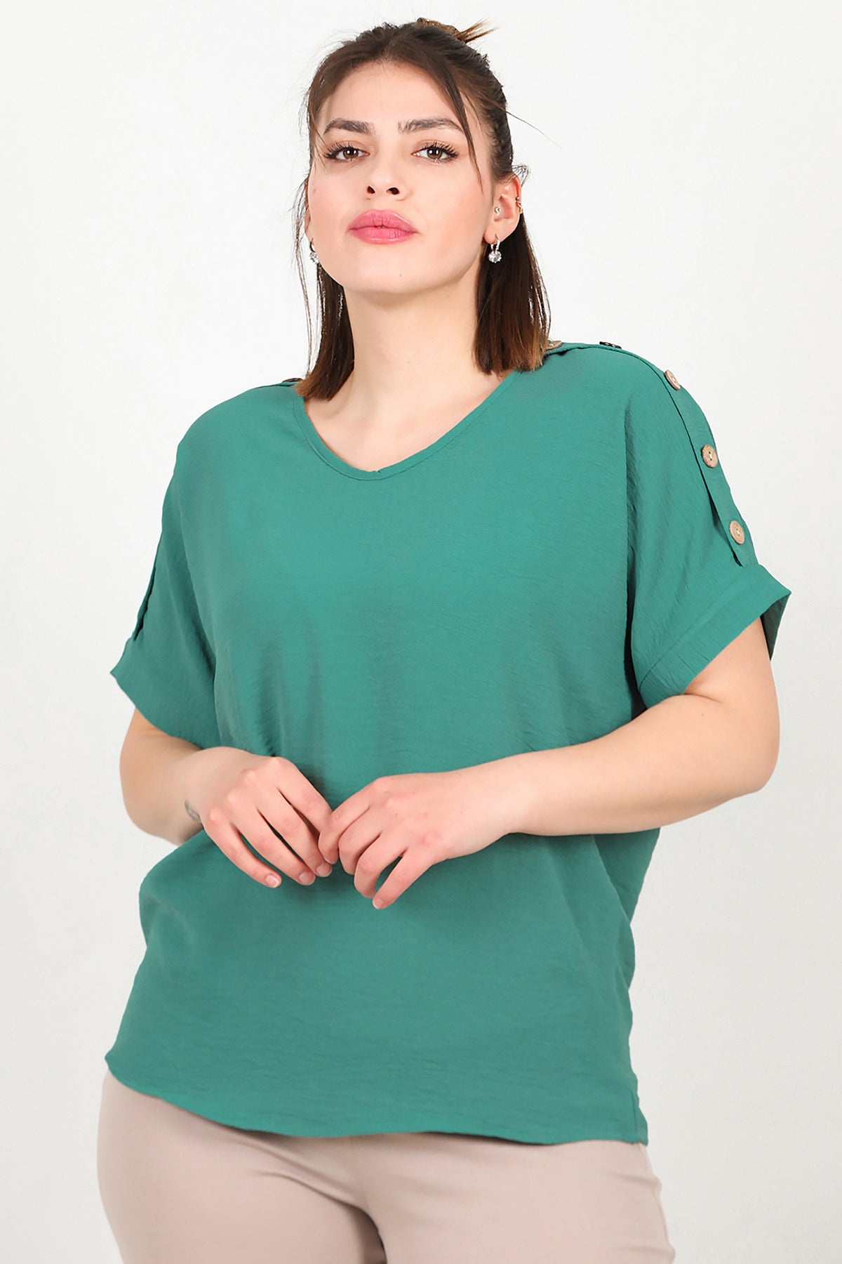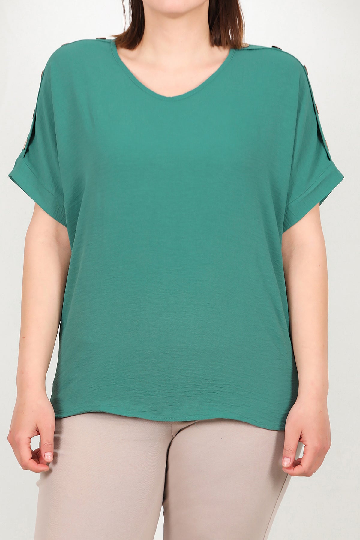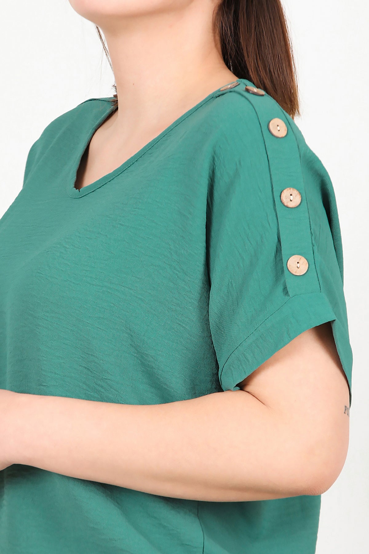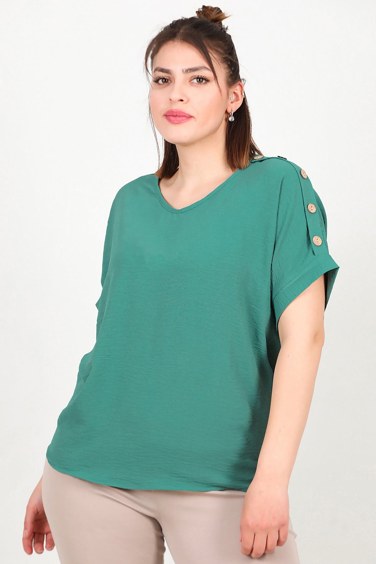 Büyük Beden Omuz Düğmeli V Yaka Bluz Zümrüt