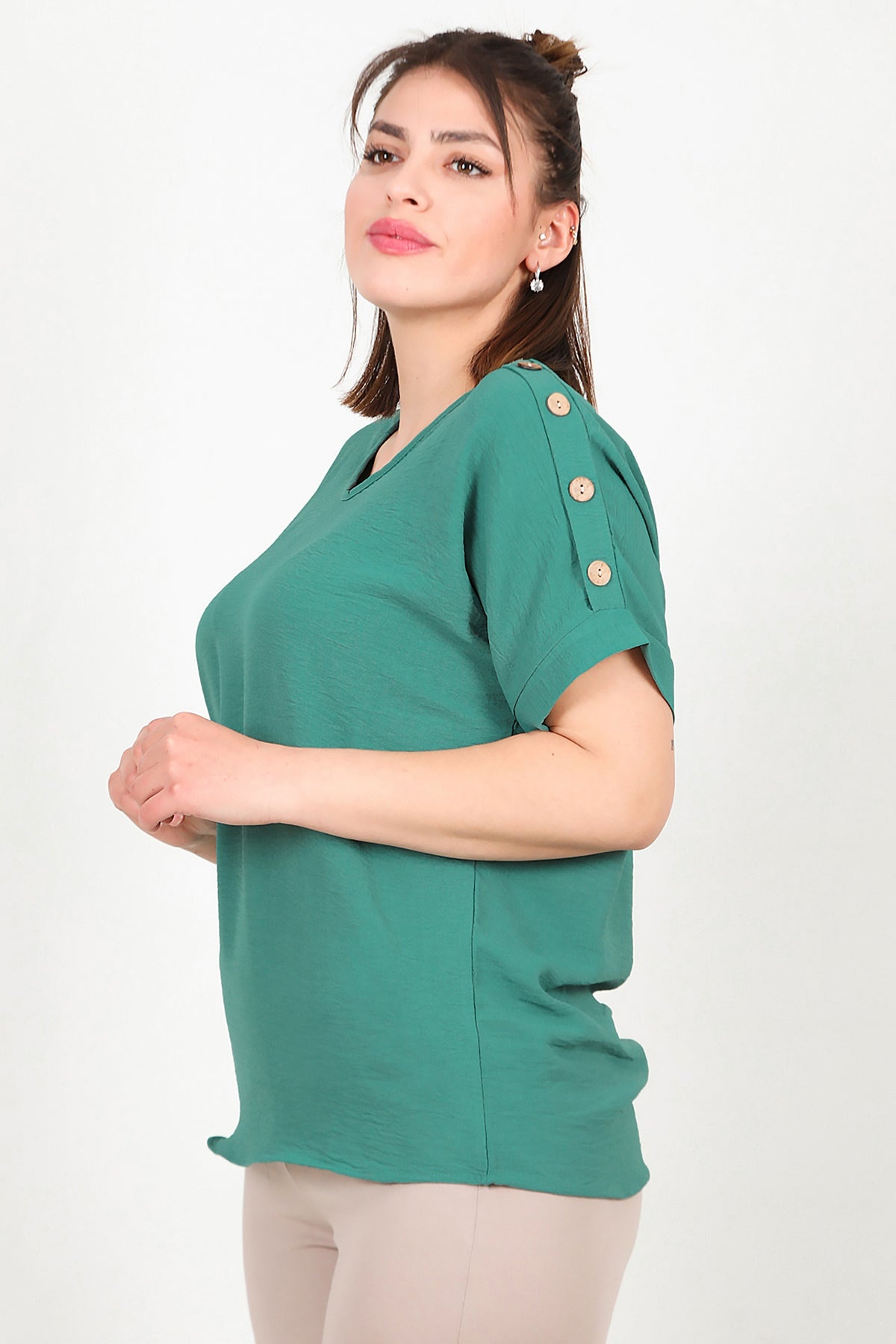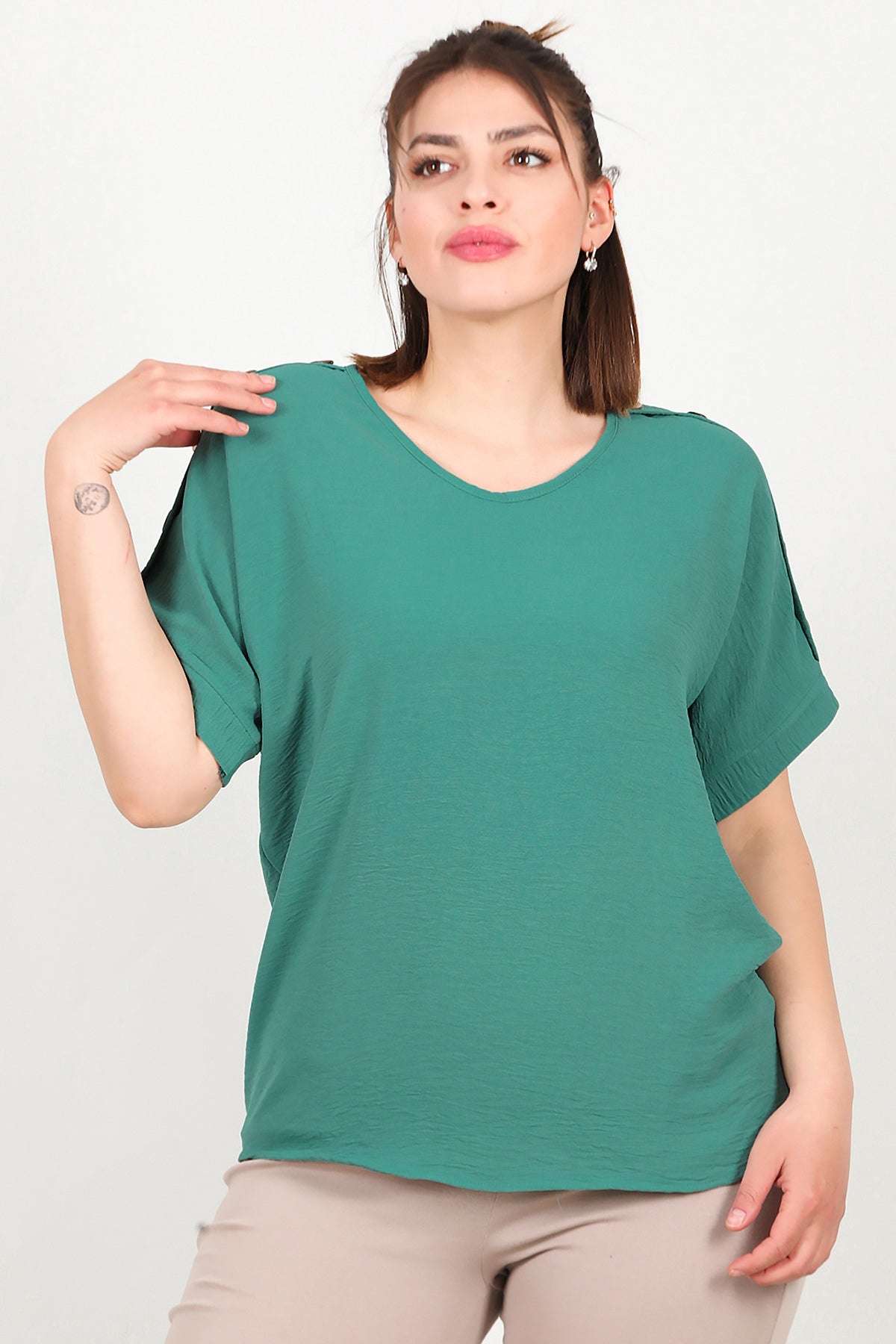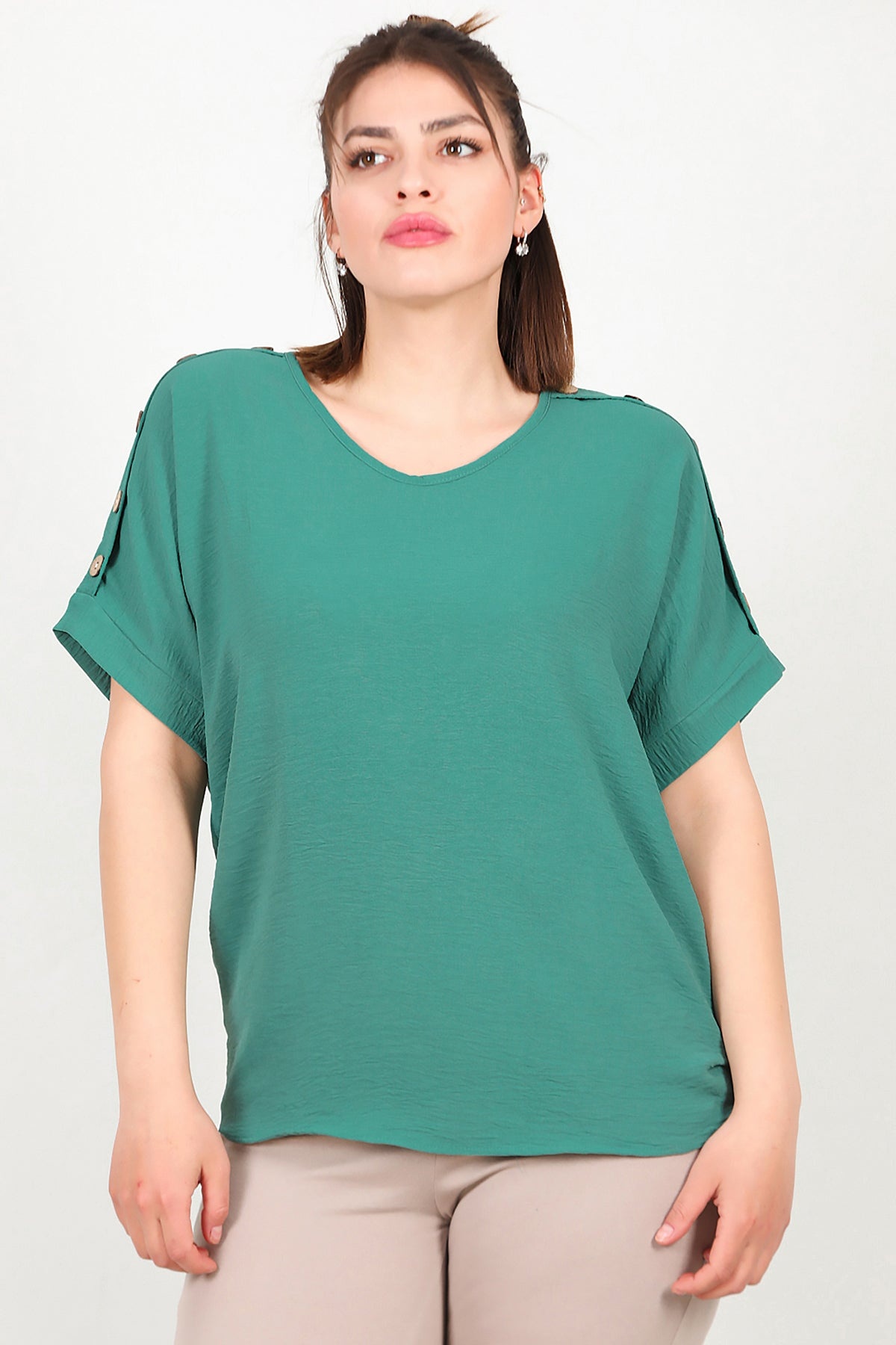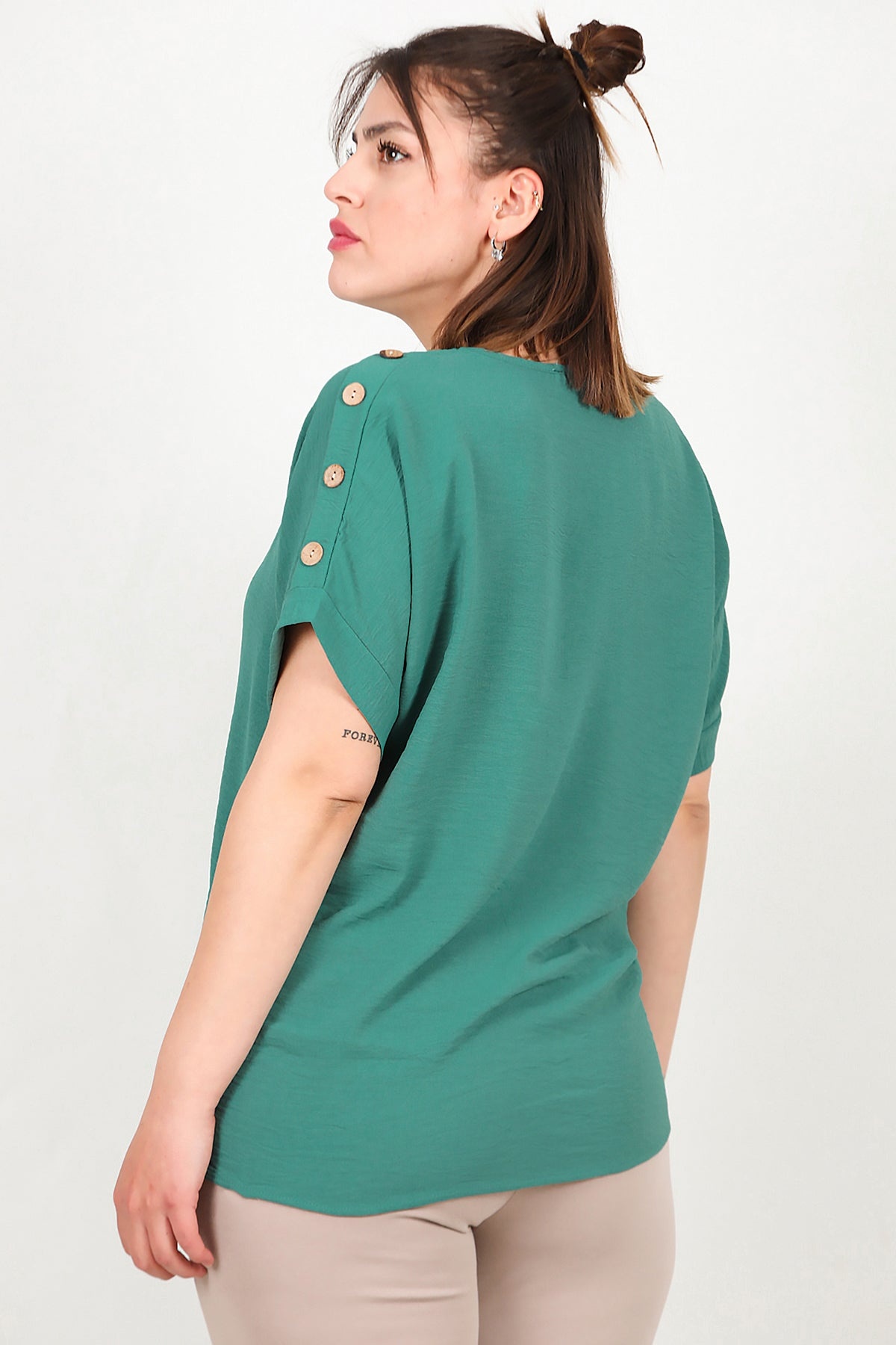 Büyük Beden Omuz Düğmeli V Yaka Bluz Zümrüt