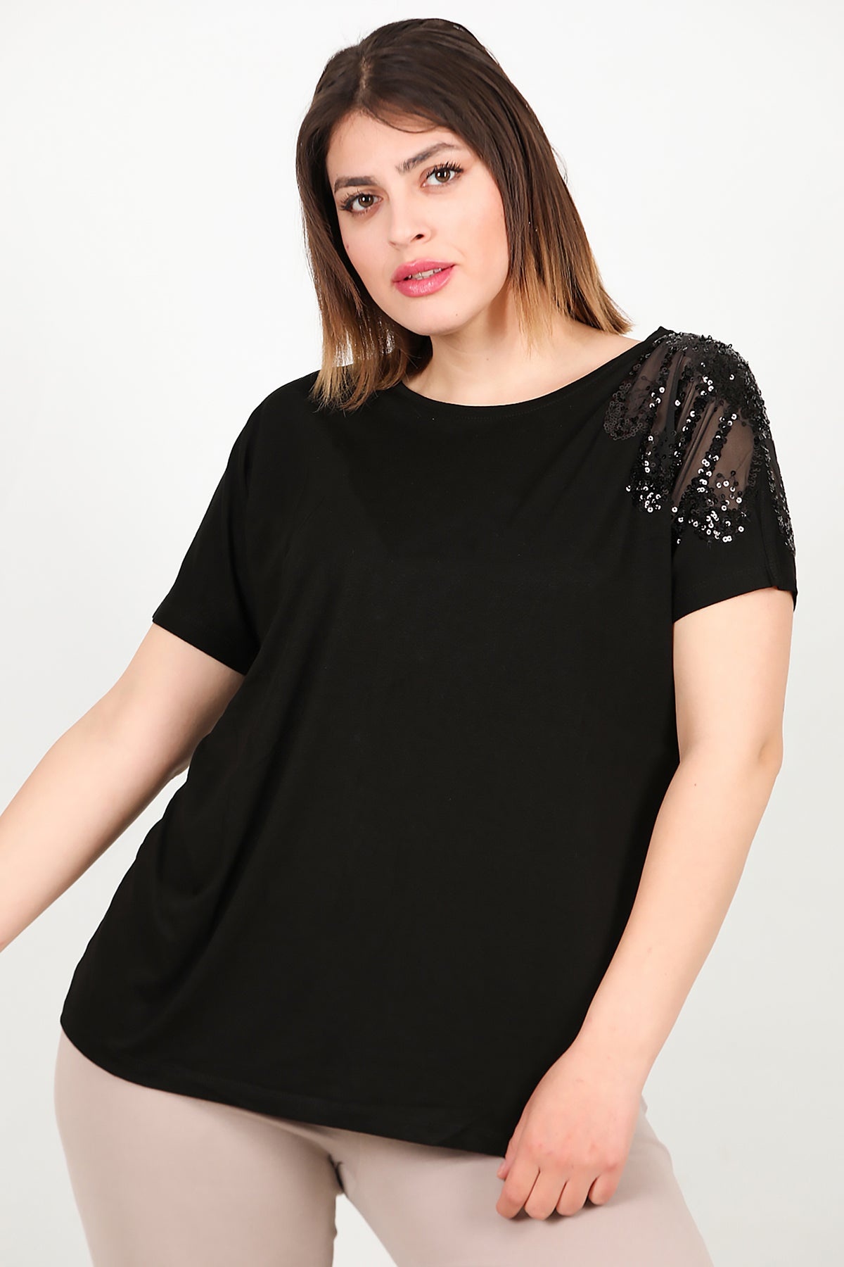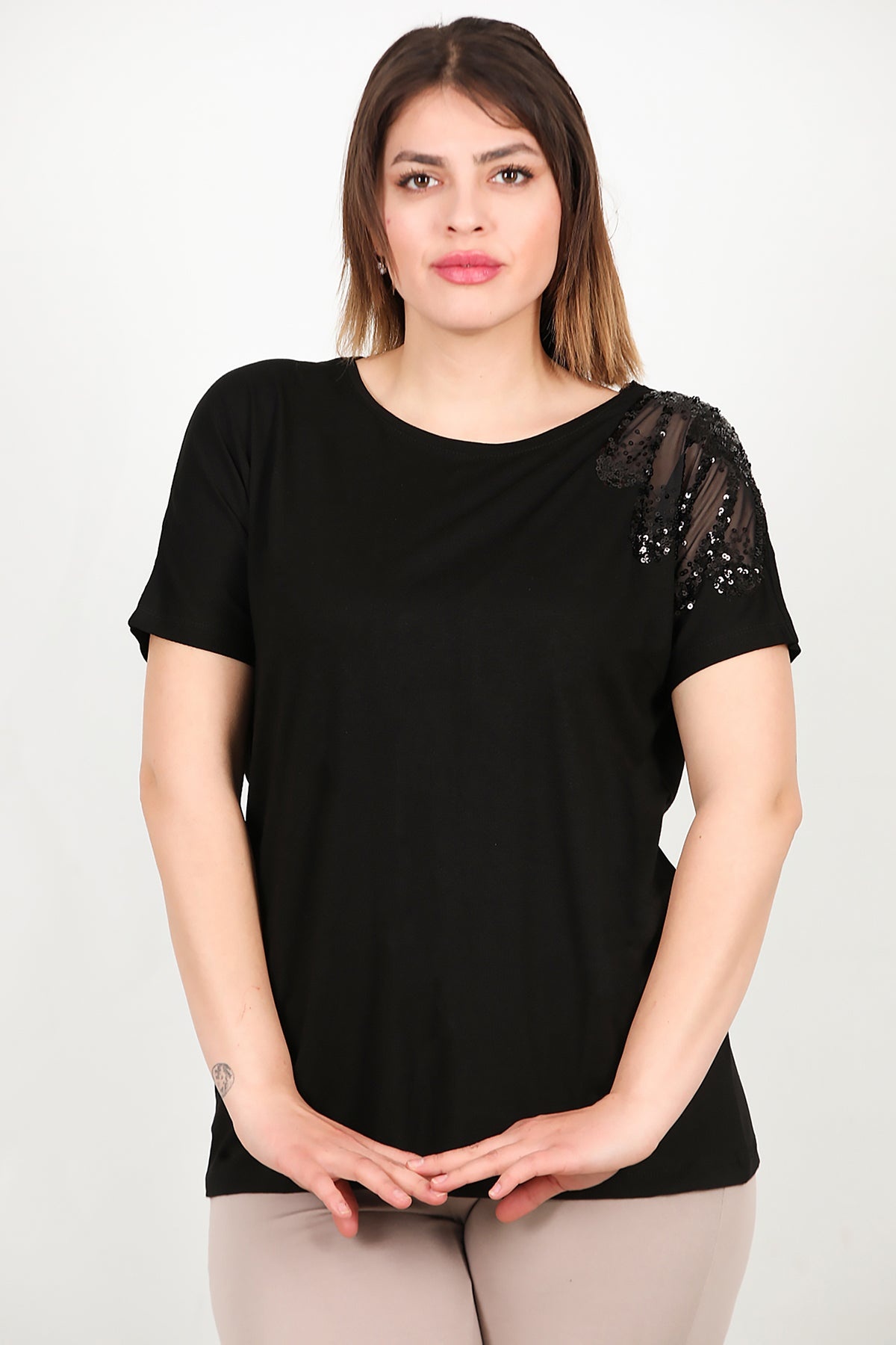 Büyük Beden Omuz Nakışlı Bluz Siyah