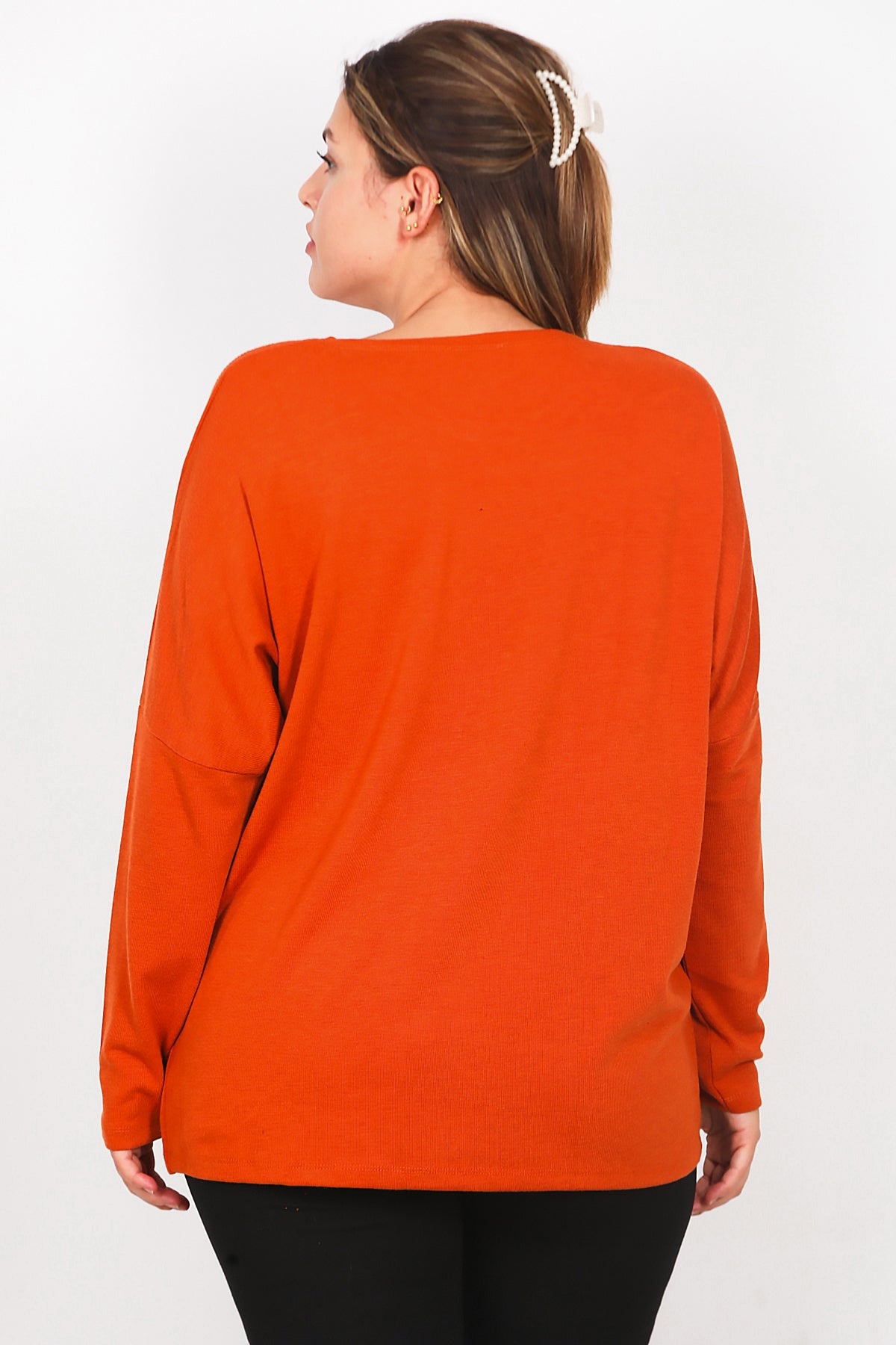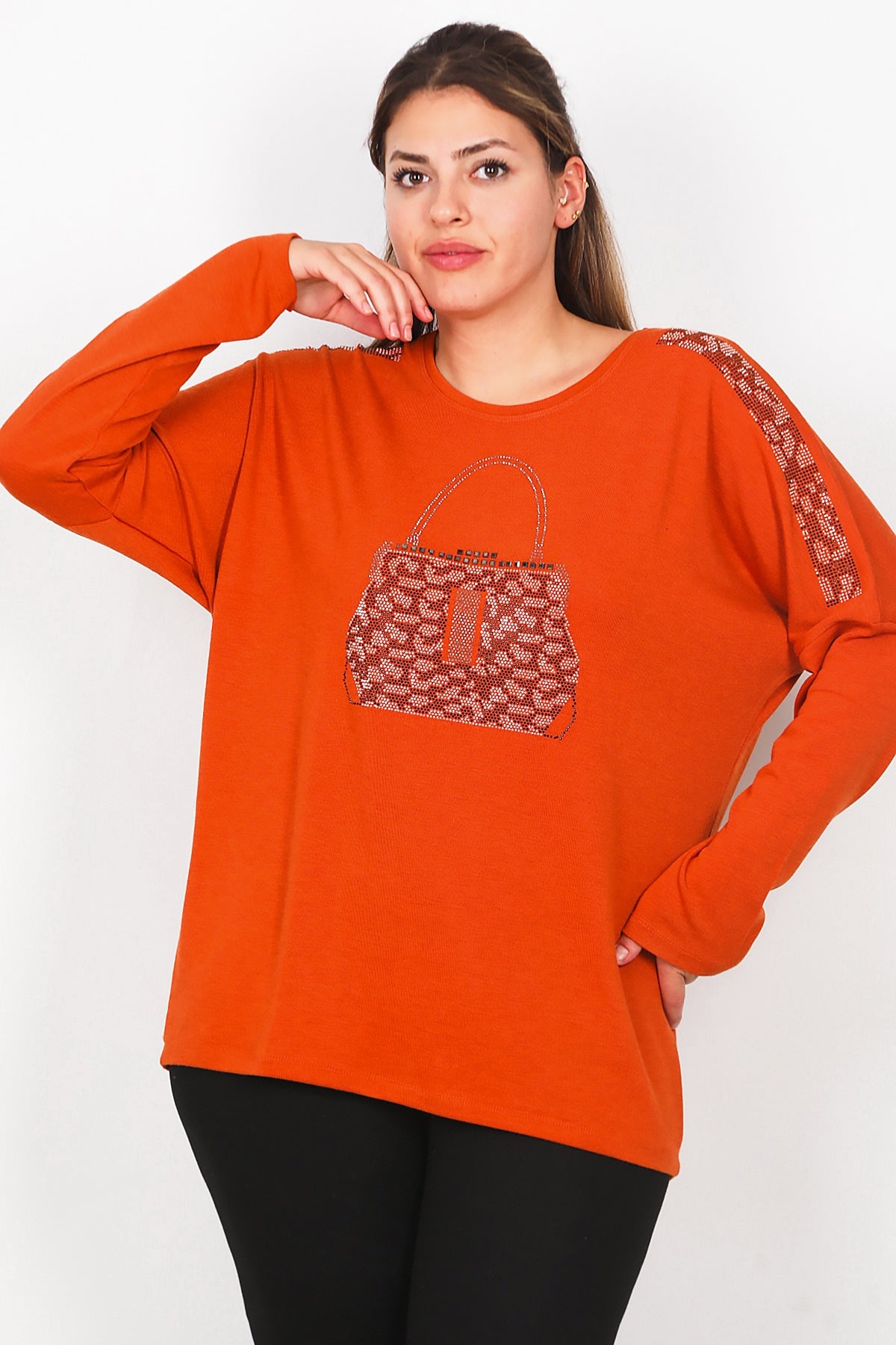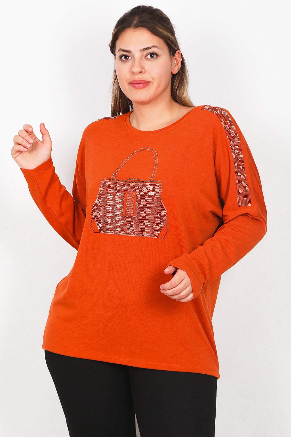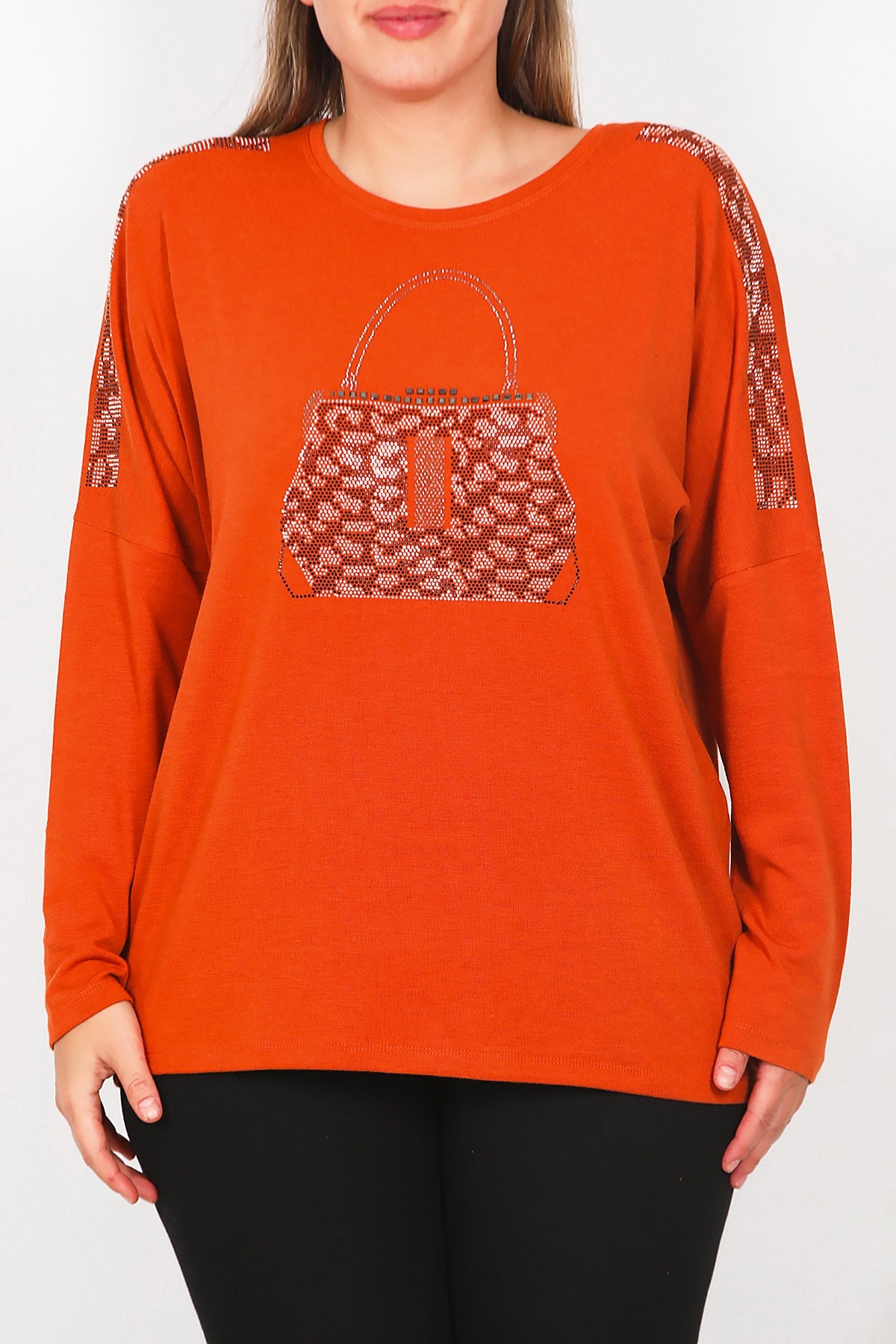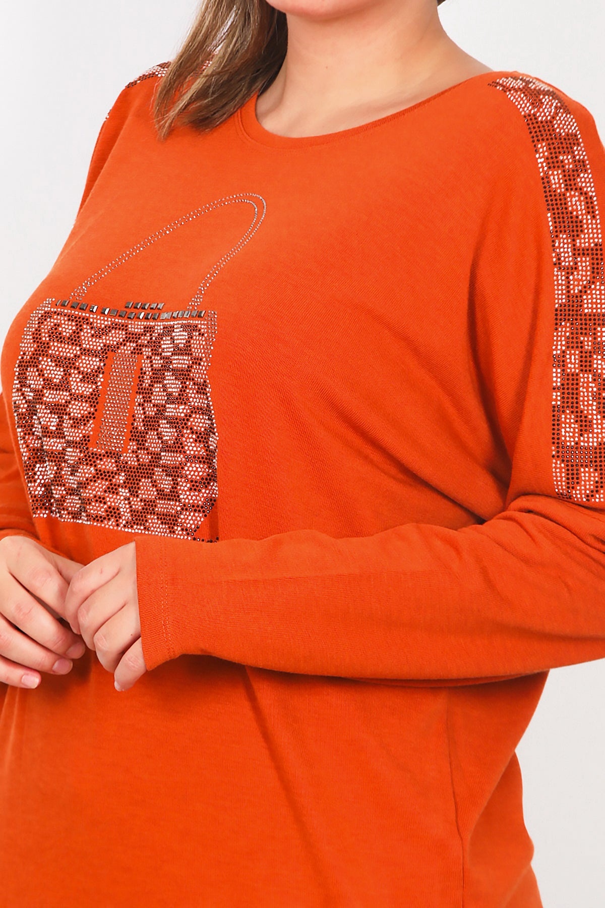 Büyük Beden Ön Çanta Baskılı Uzun Kol Bluz Kiremit