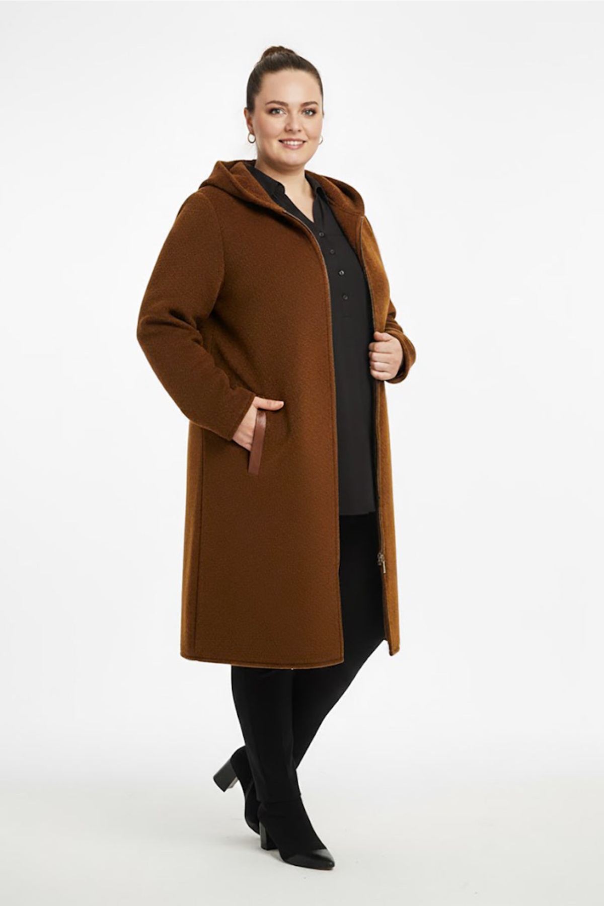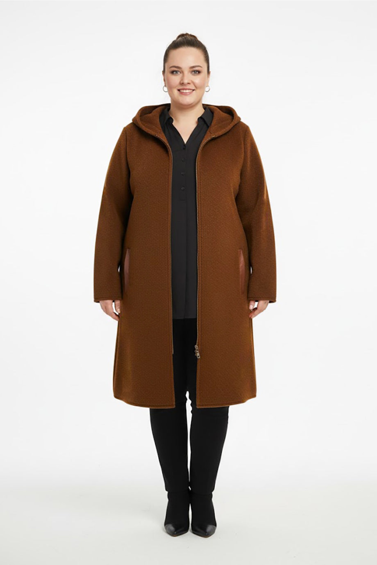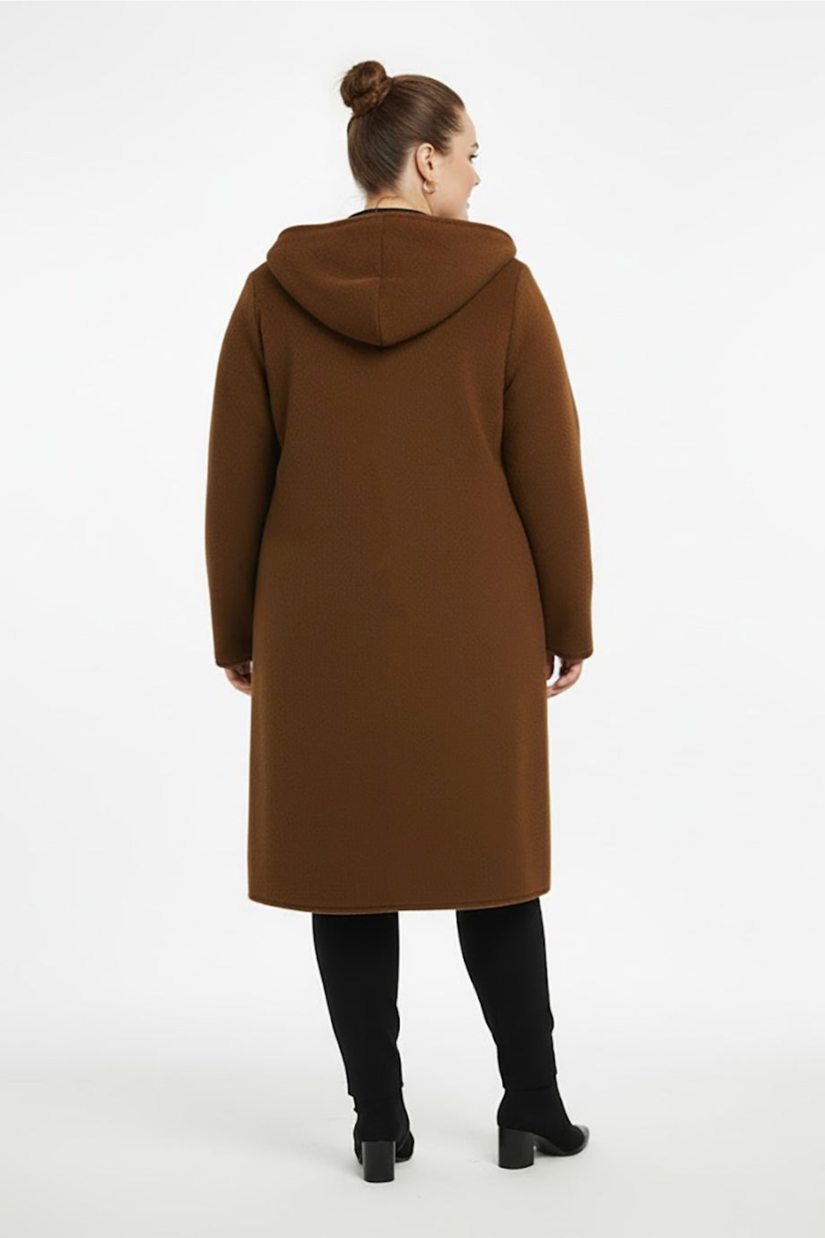Büyük Beden Ön Fermuarlı Kapşonlu Kaban Kahverengi