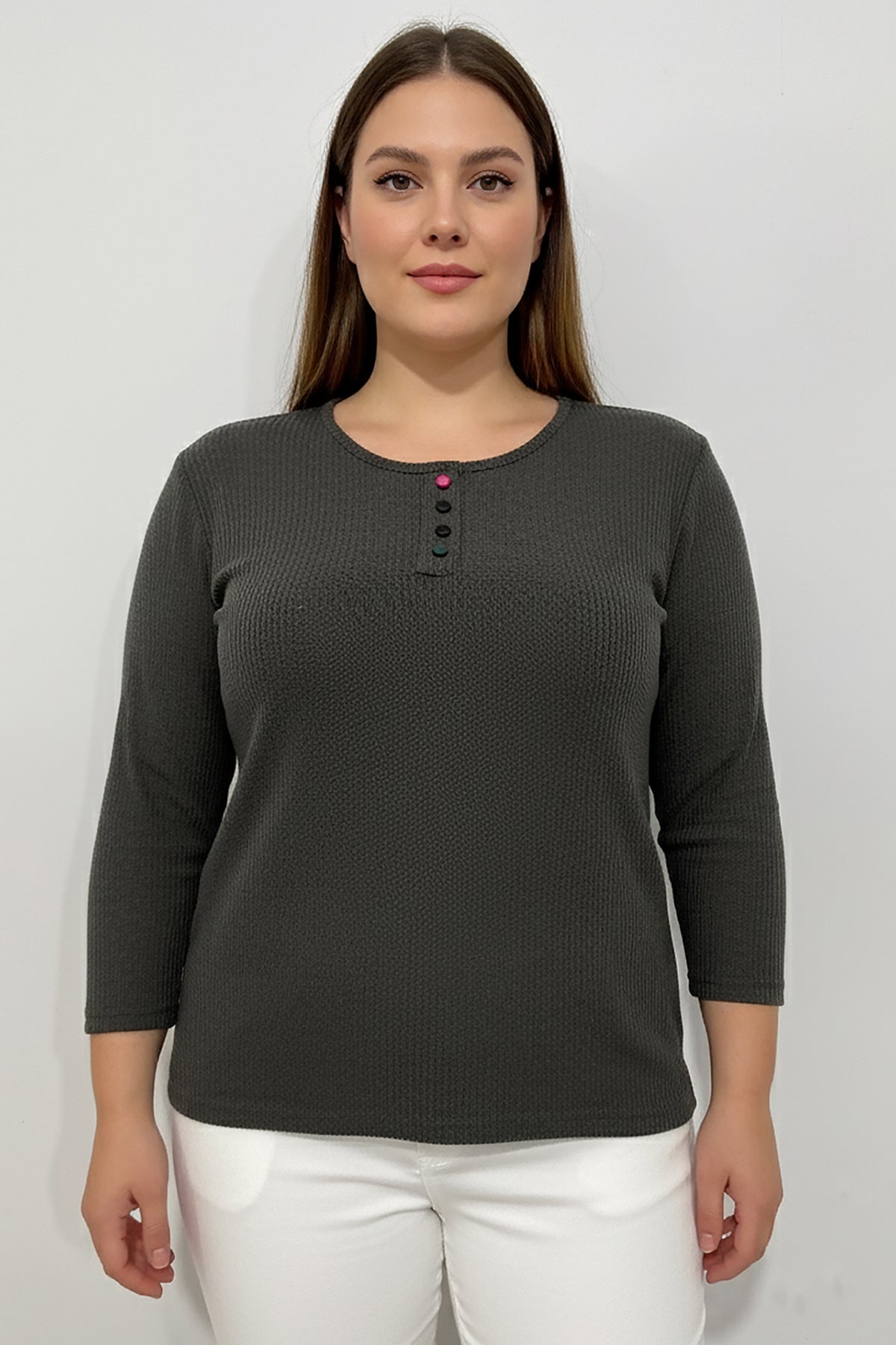 Büyük Beden Önü Renkli Düğmeli Triko Bluz Haki