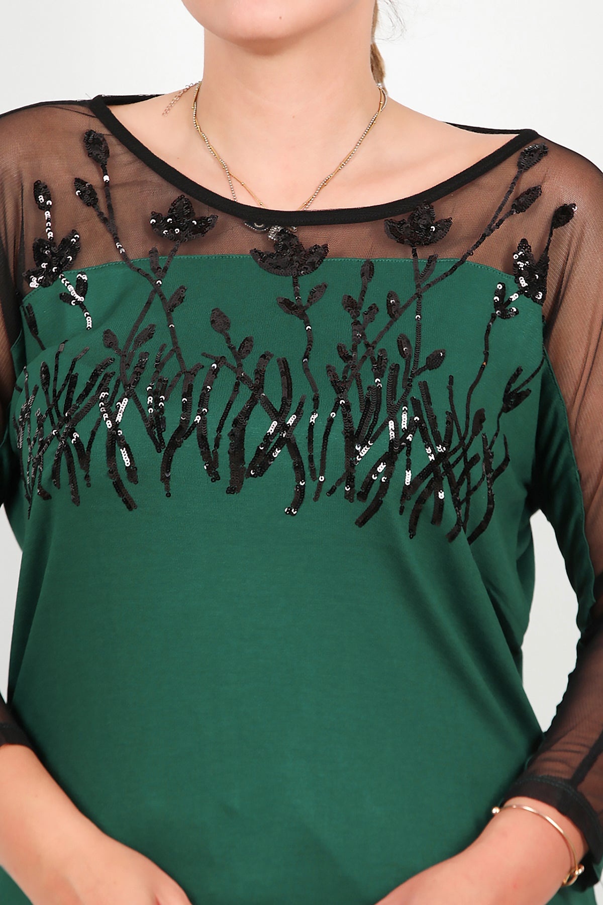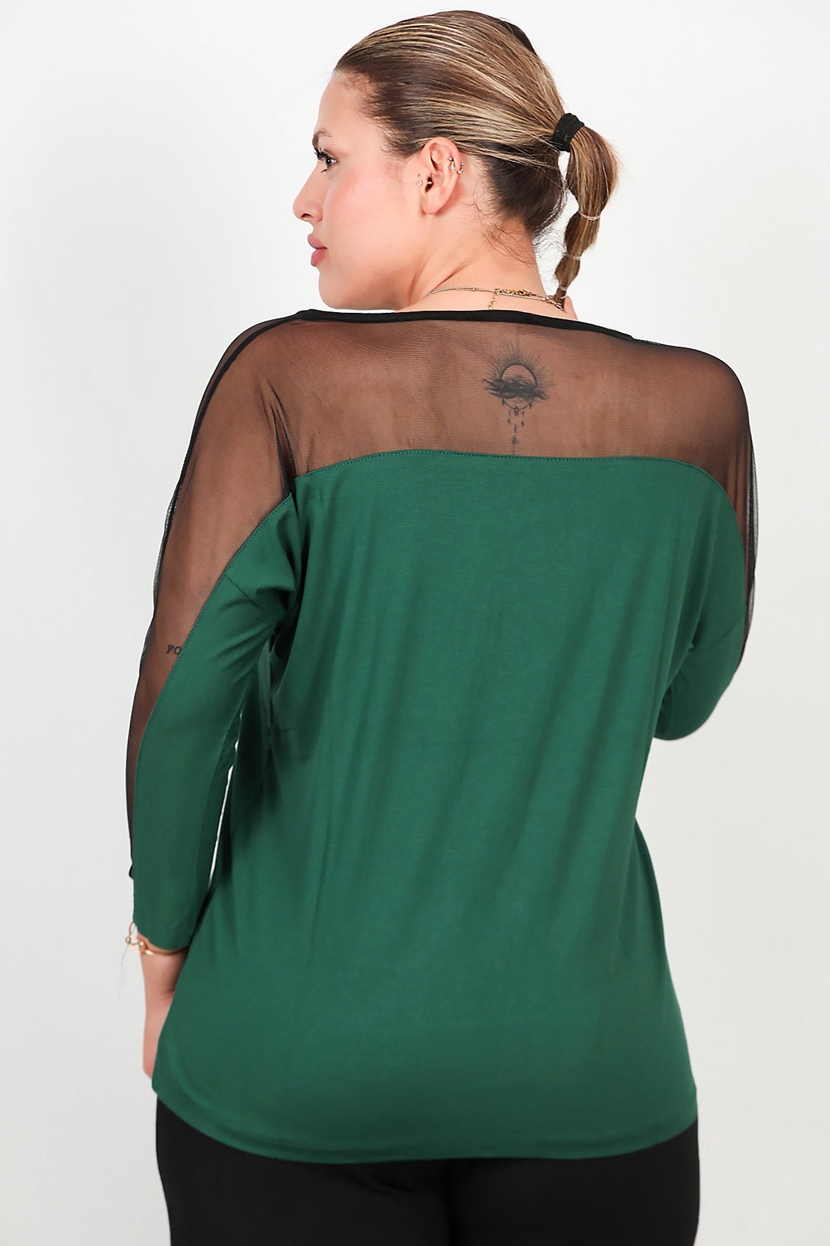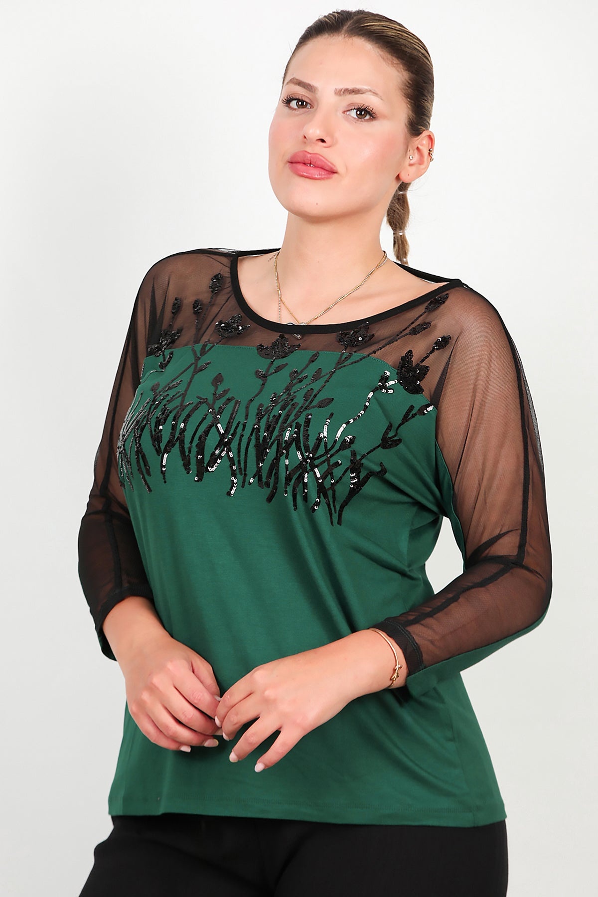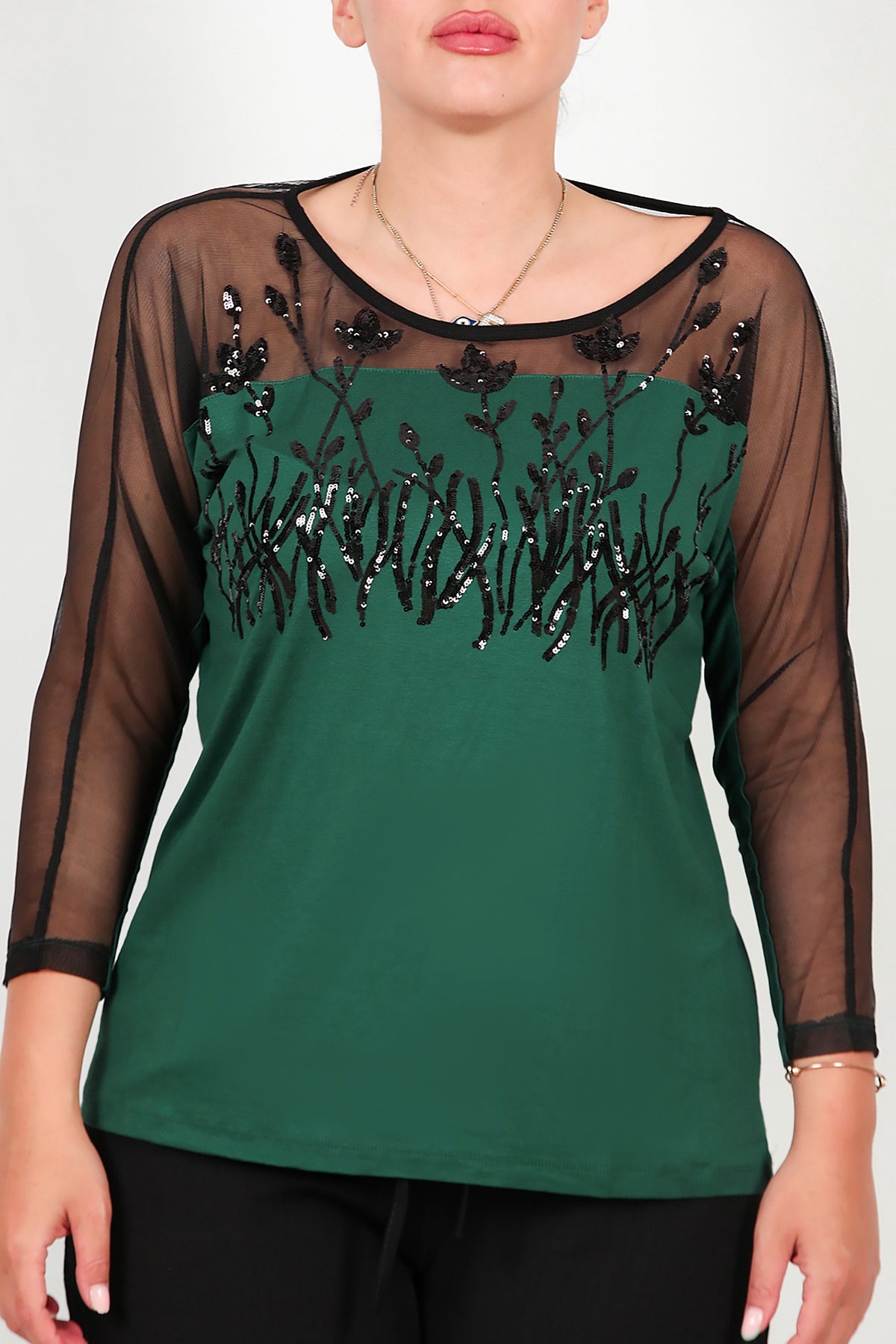 Büyük Beden Tüllü Nakışlı Bluz Zümrüt