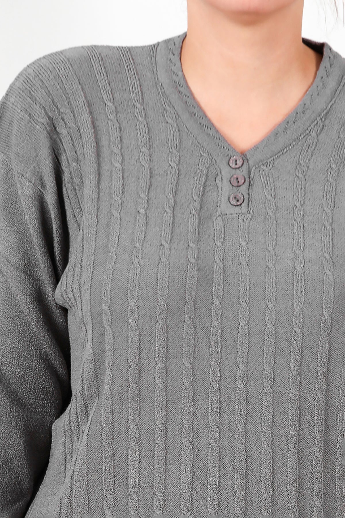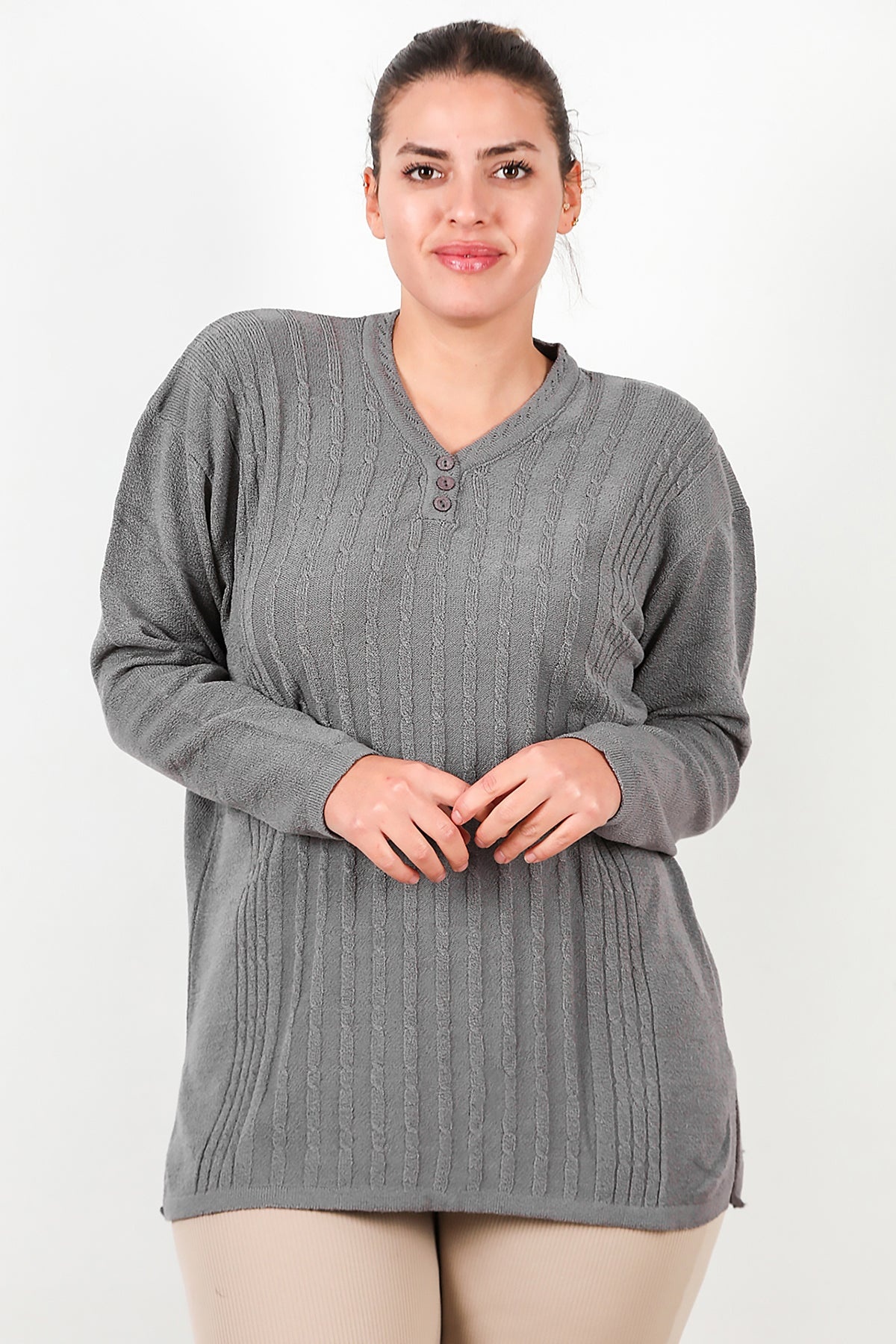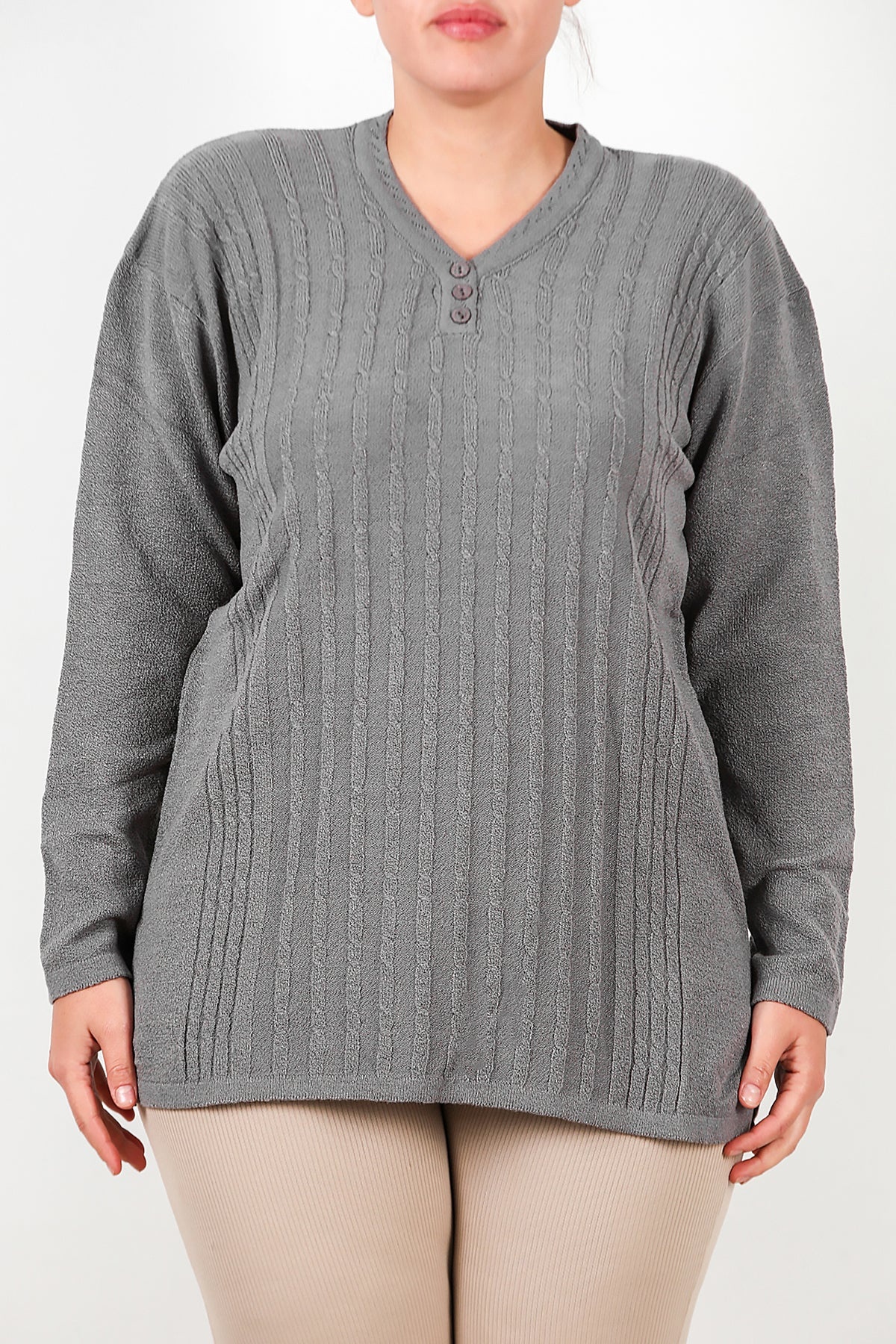 Büyük Beden V Yaka Üç Düğmeli Triko Bluz Gri