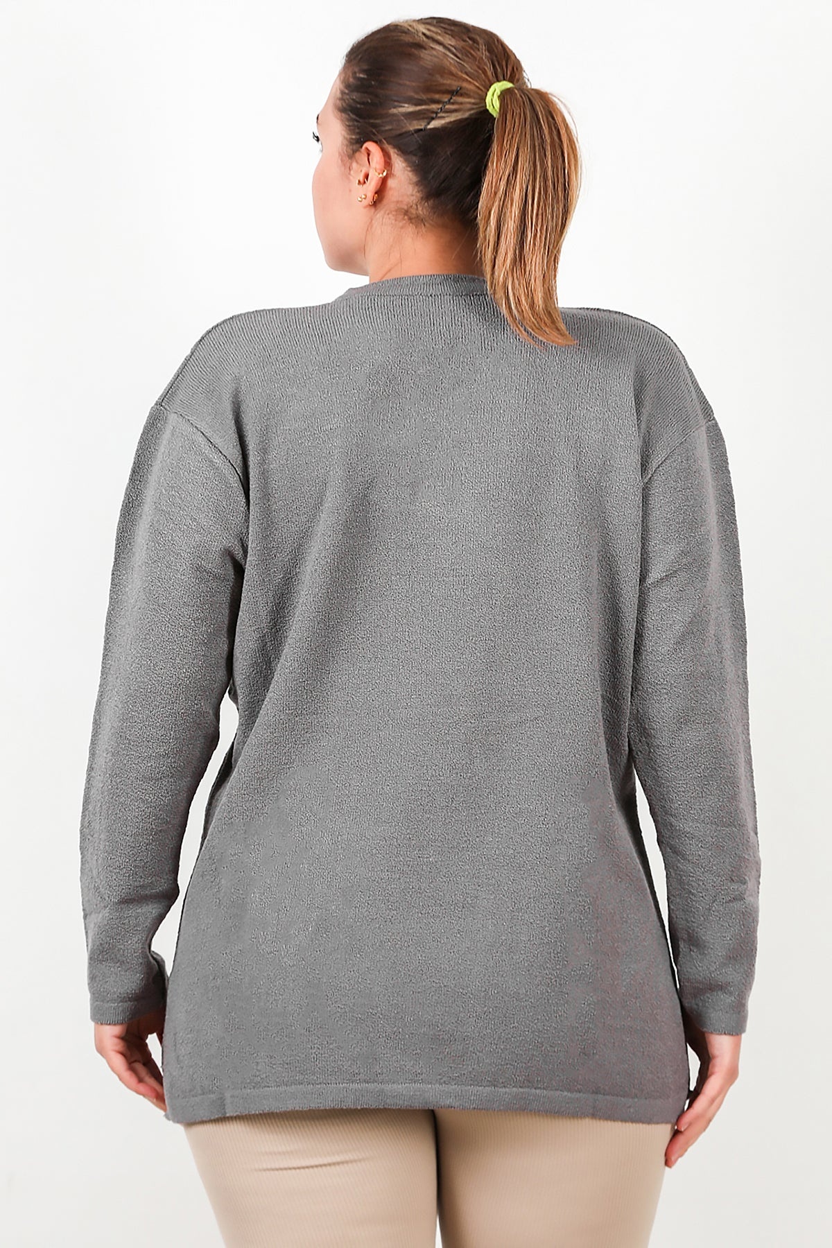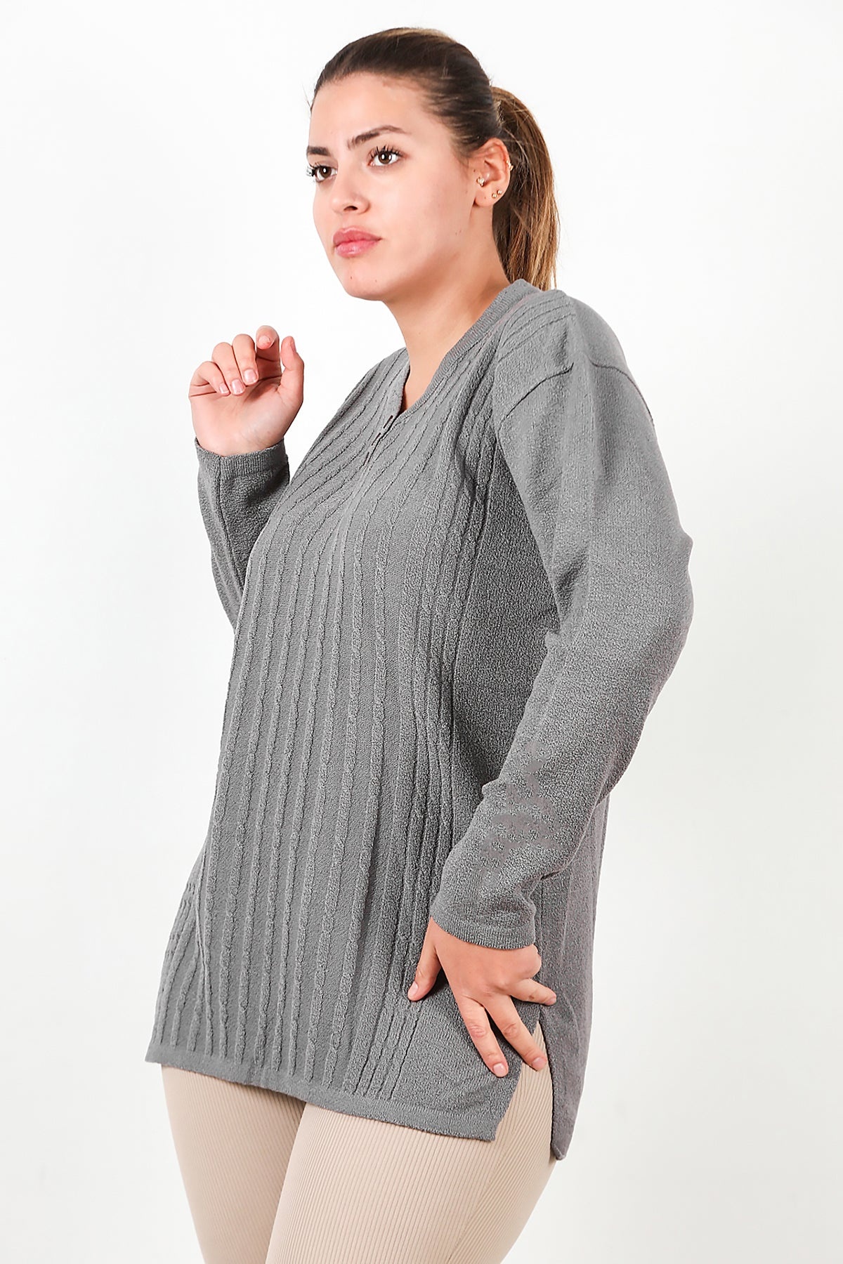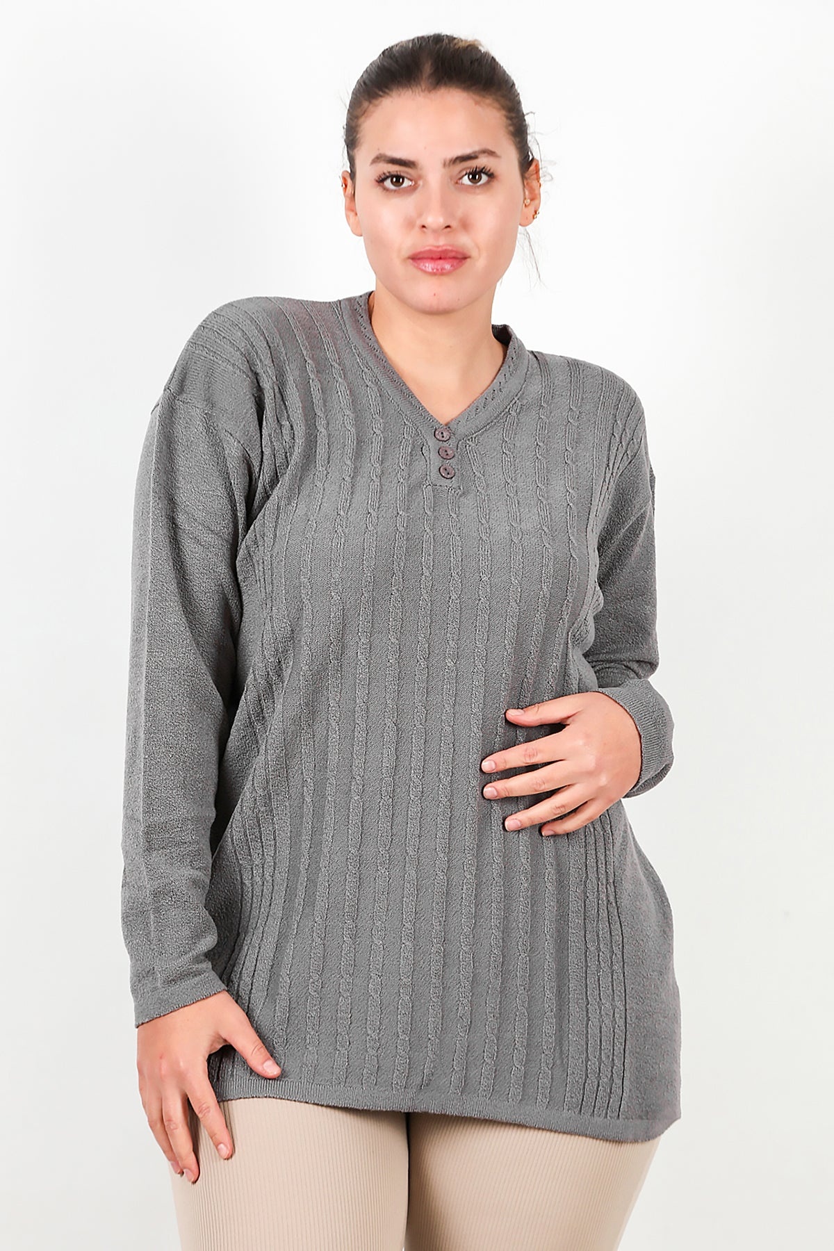Büyük Beden V Yaka Üç Düğmeli Triko Bluz Gri