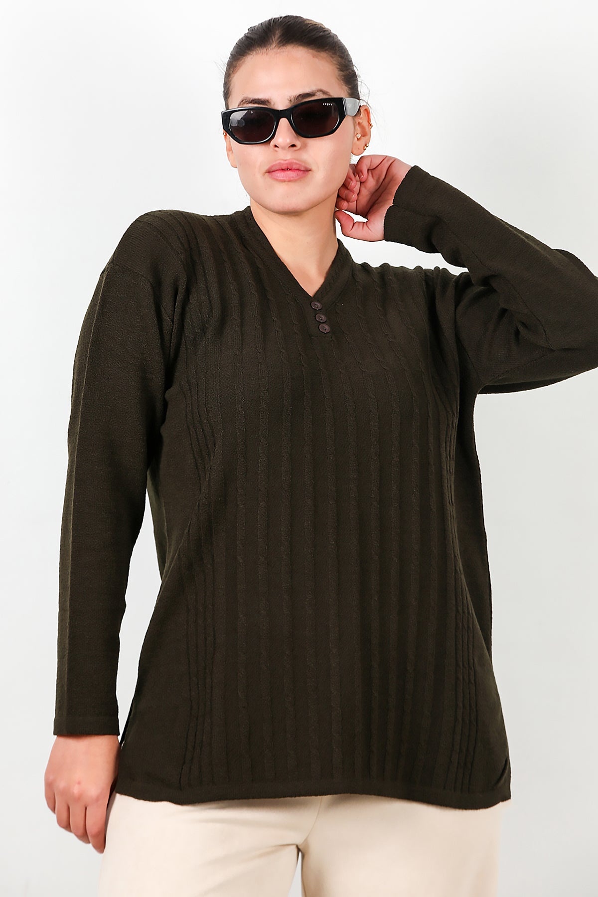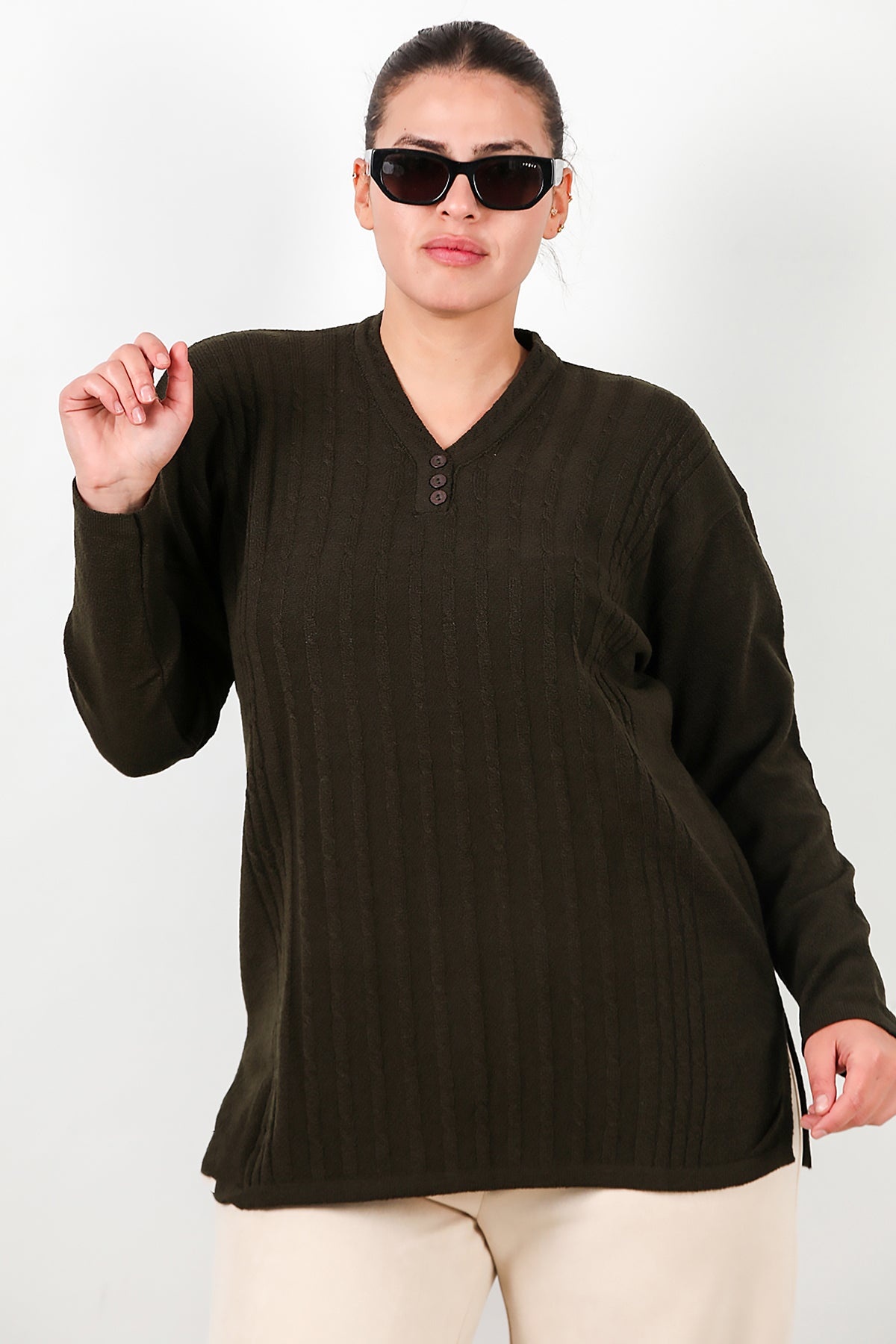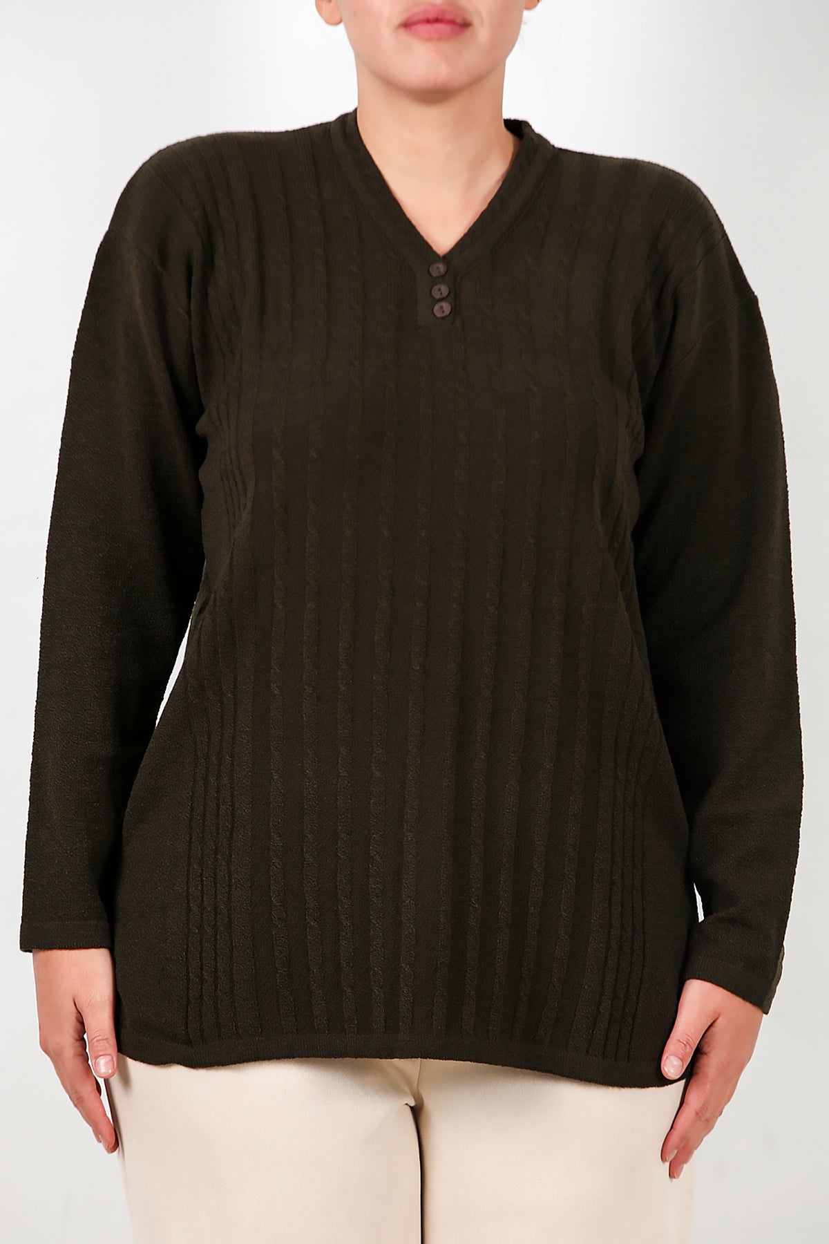 Büyük Beden V Yaka Üç Düğmeli Triko Bluz Haki