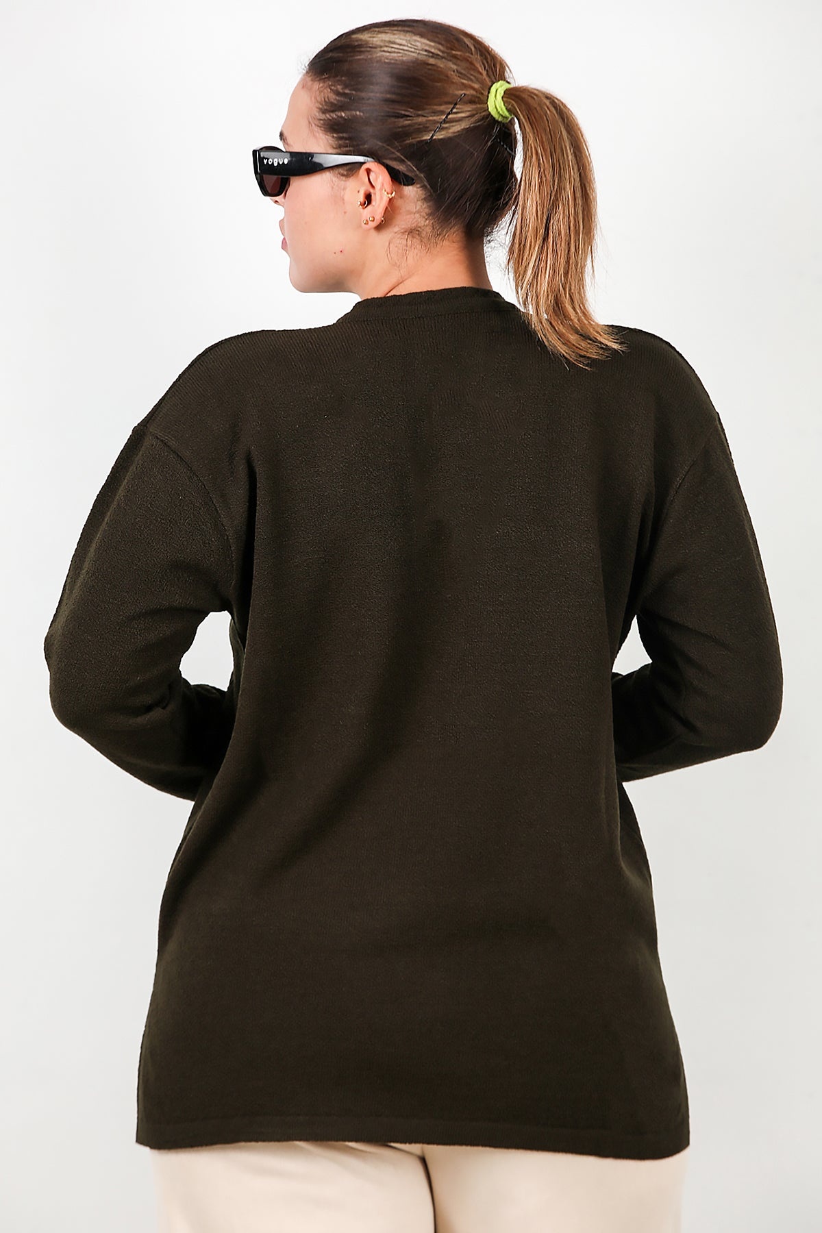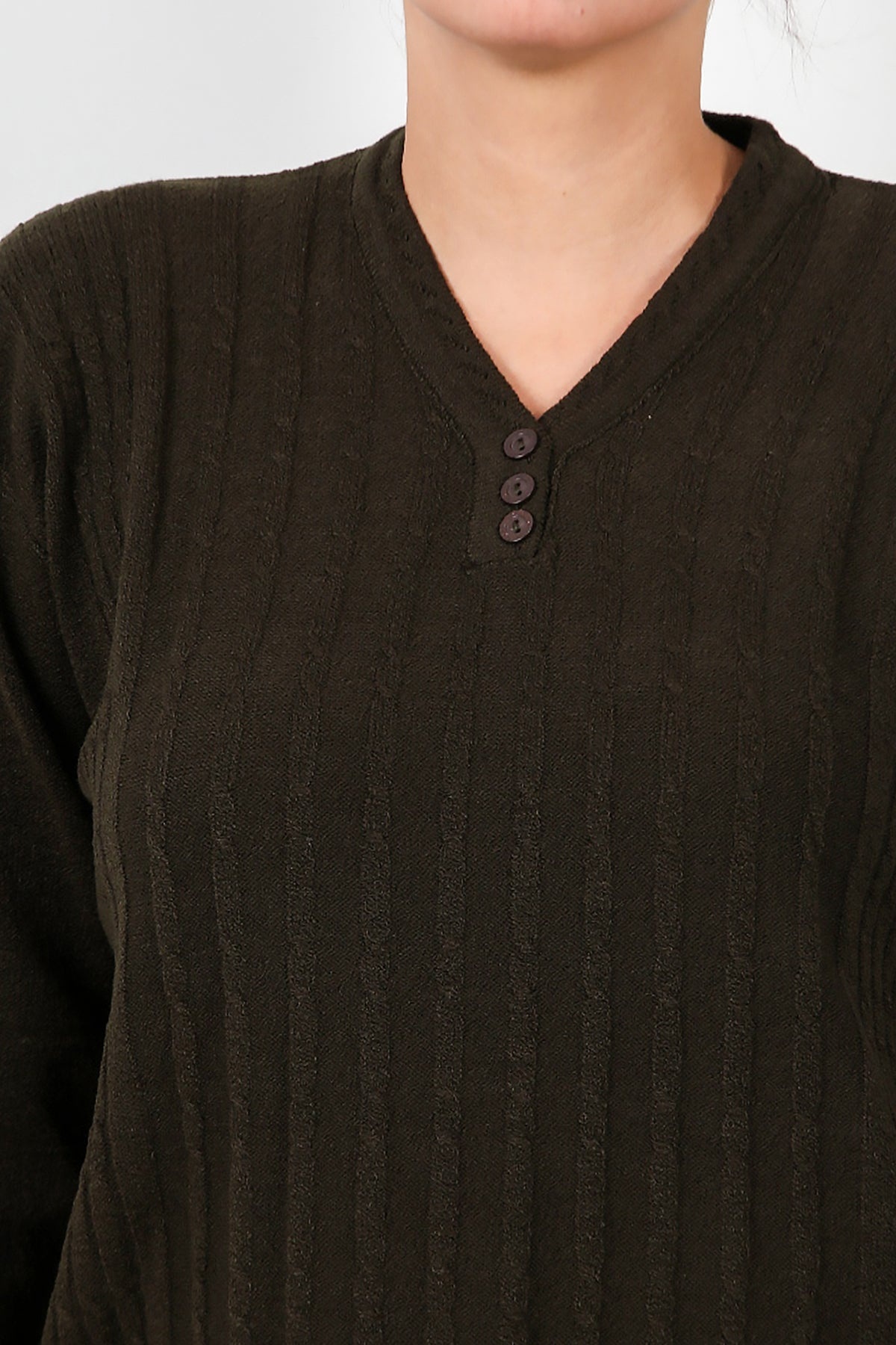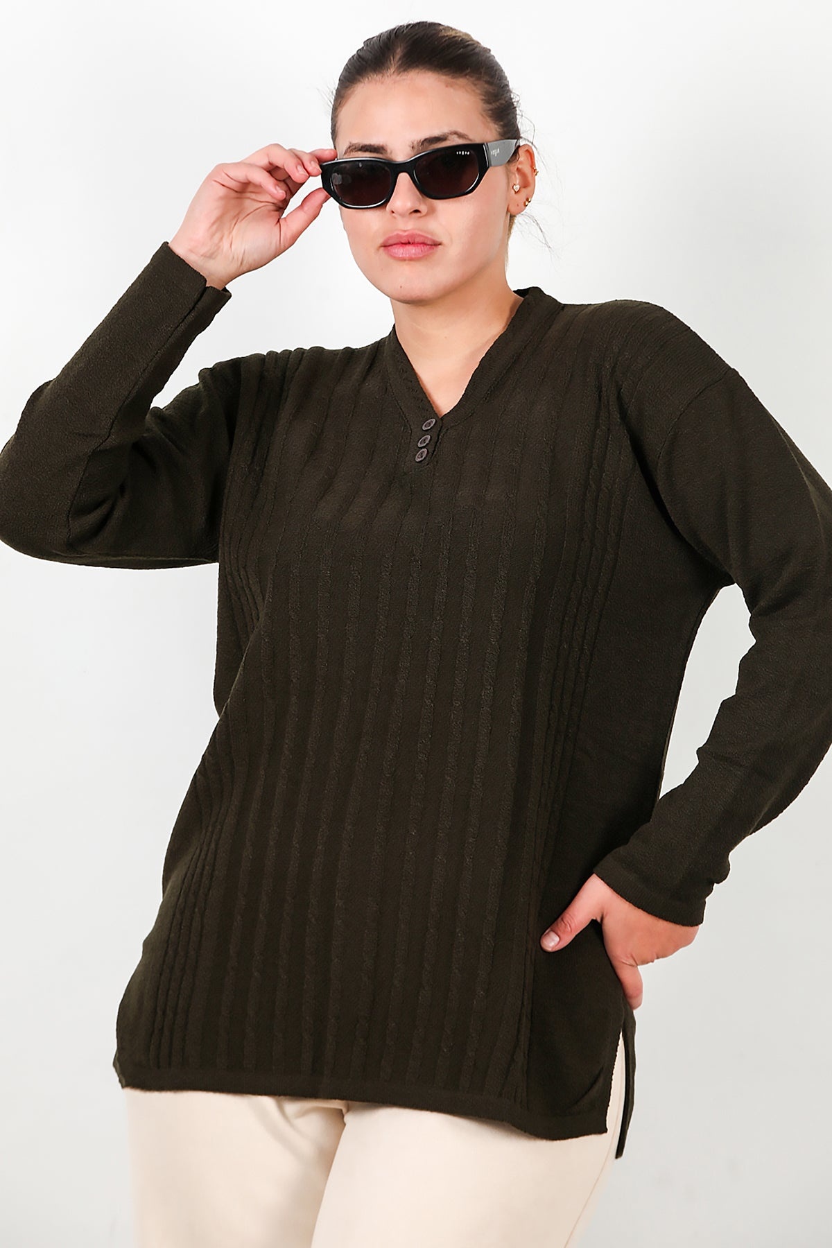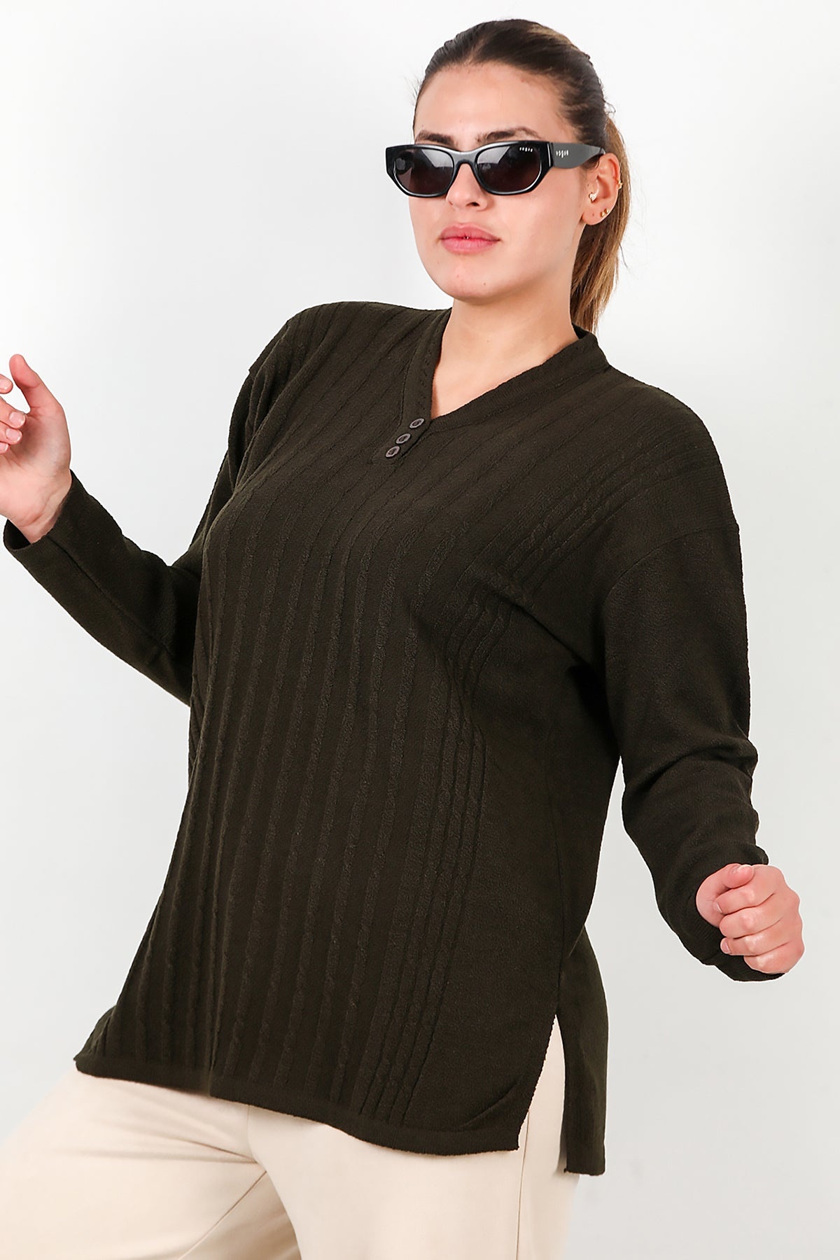 Büyük Beden V Yaka Üç Düğmeli Triko Bluz Haki