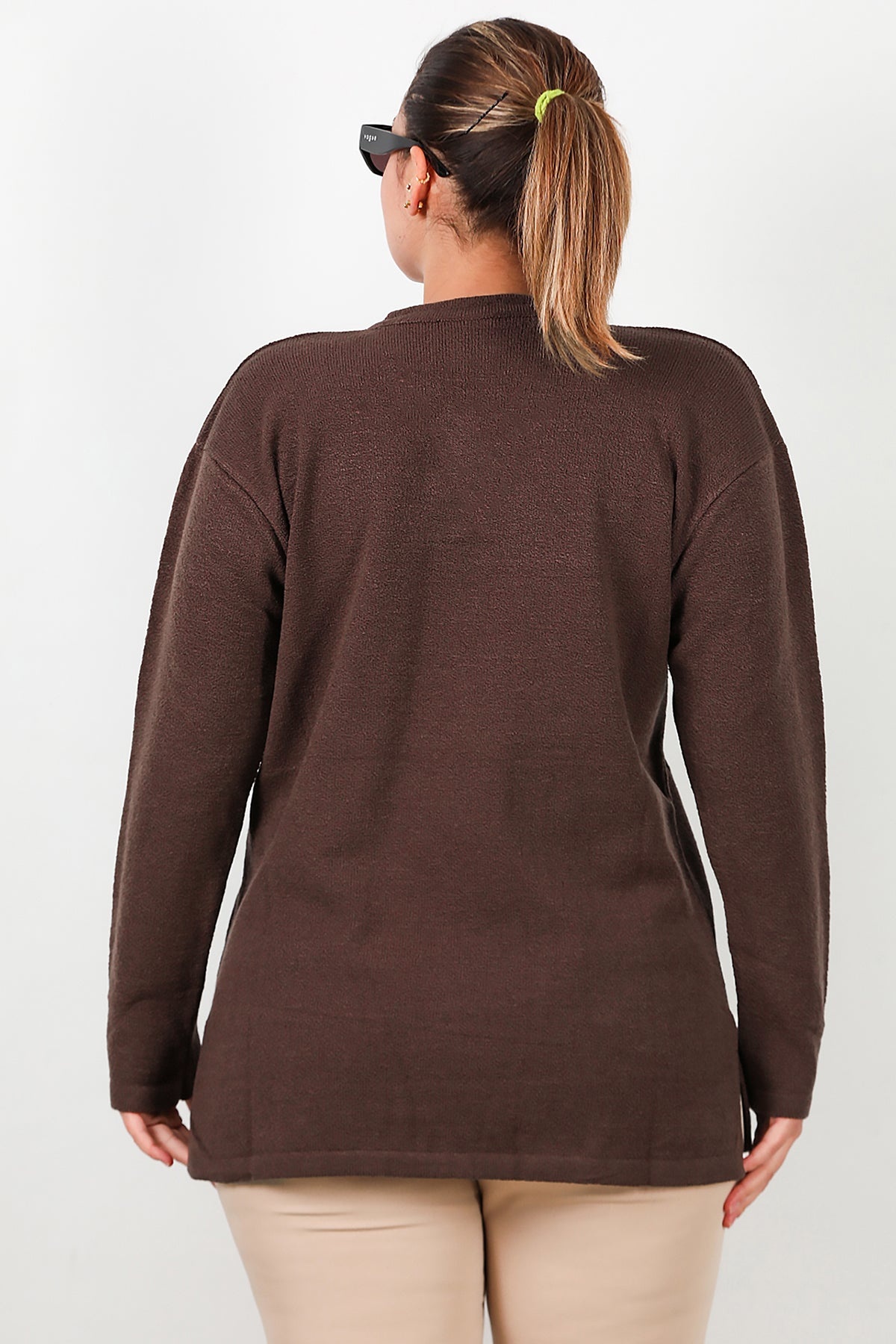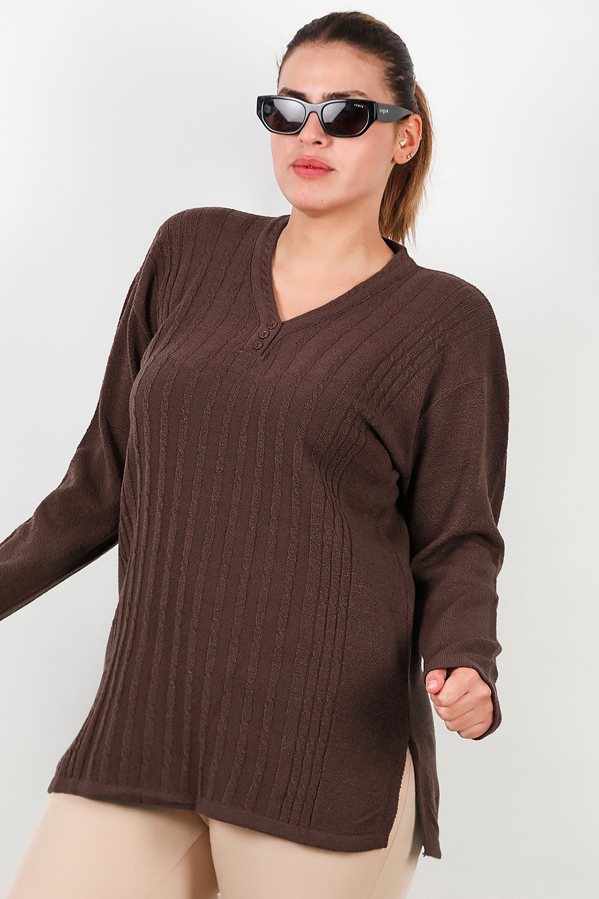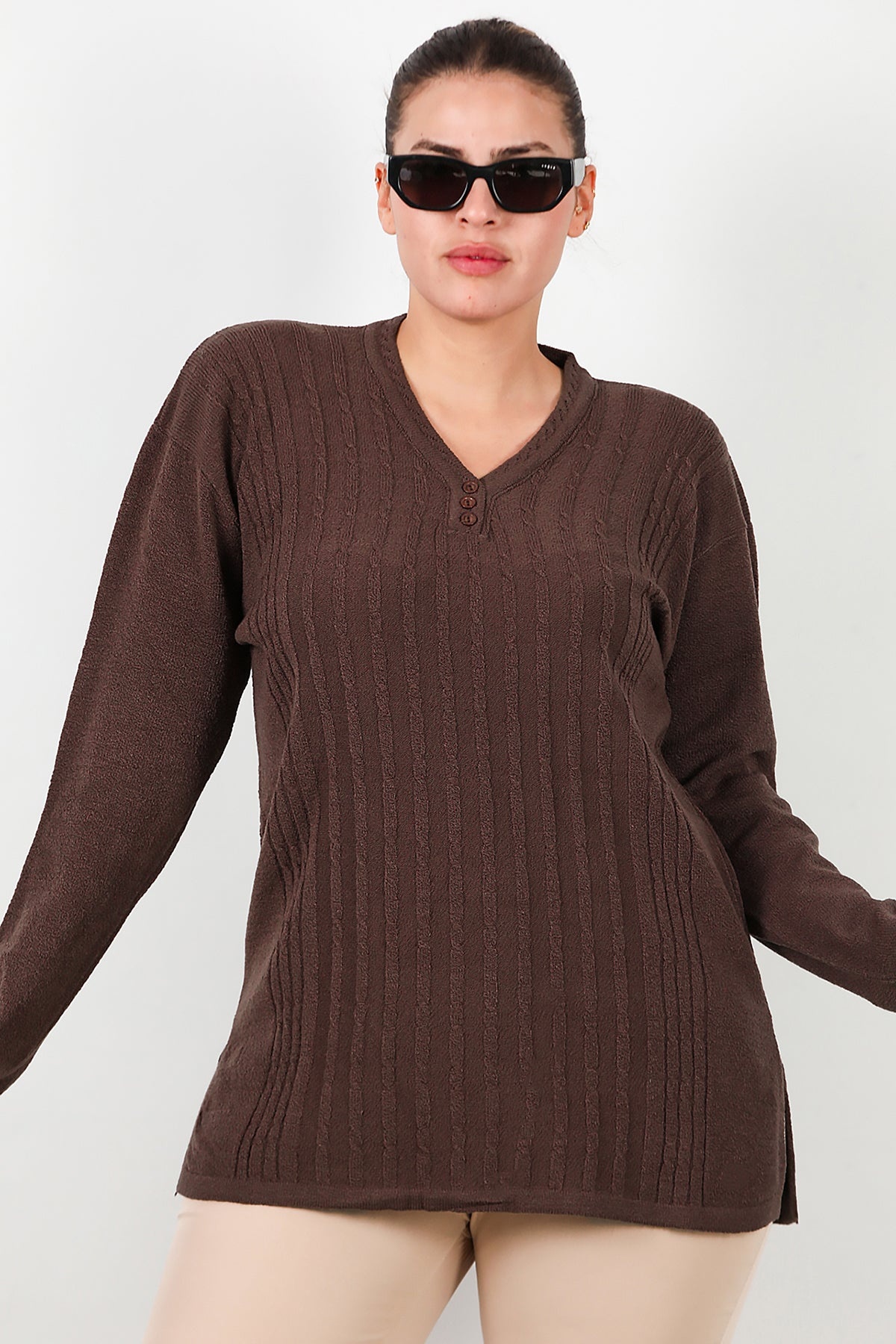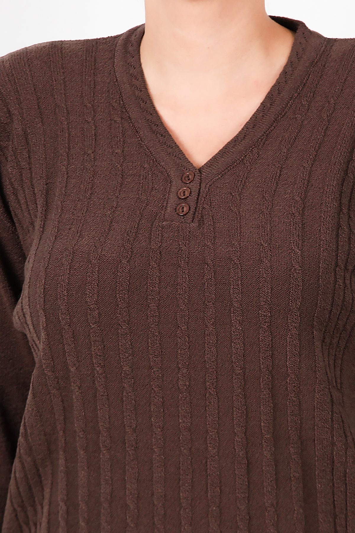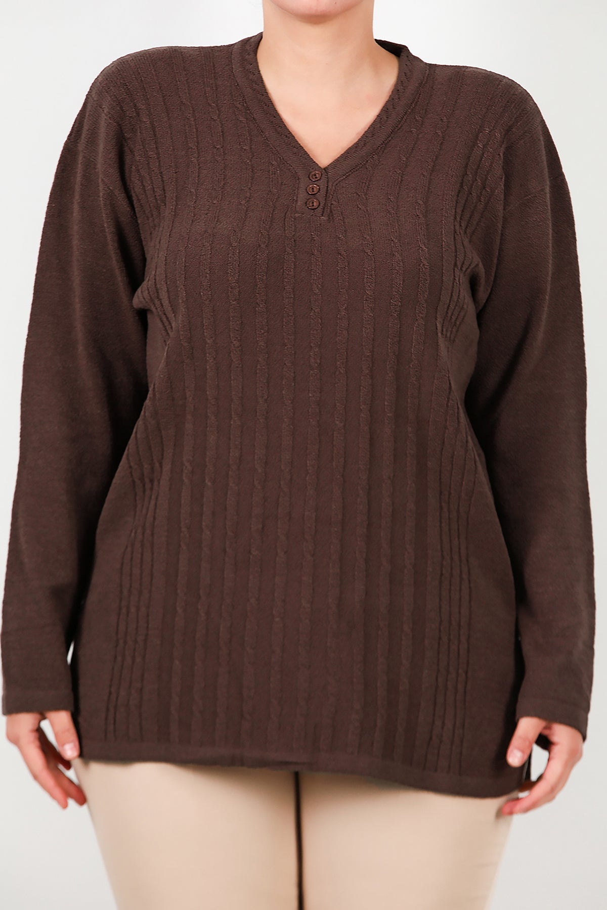 Büyük Beden V Yaka Üç Düğmeli Triko Bluz Kahverengi