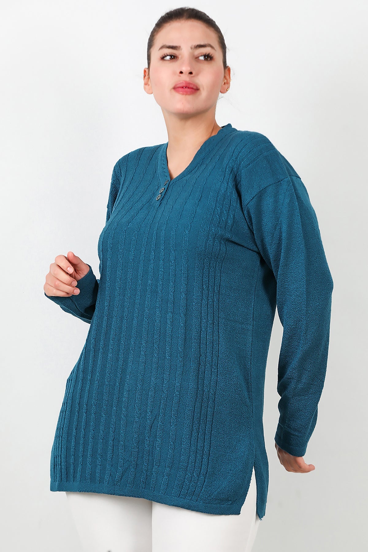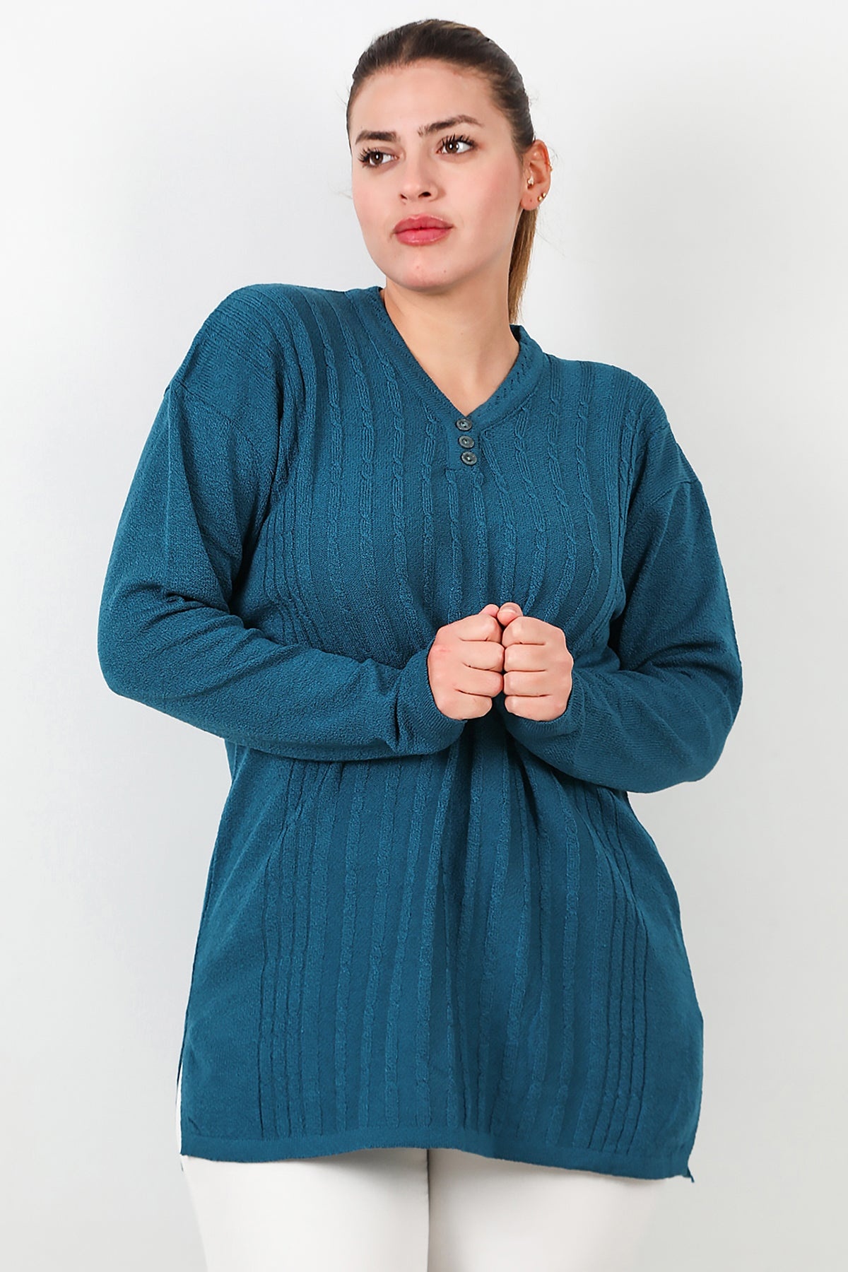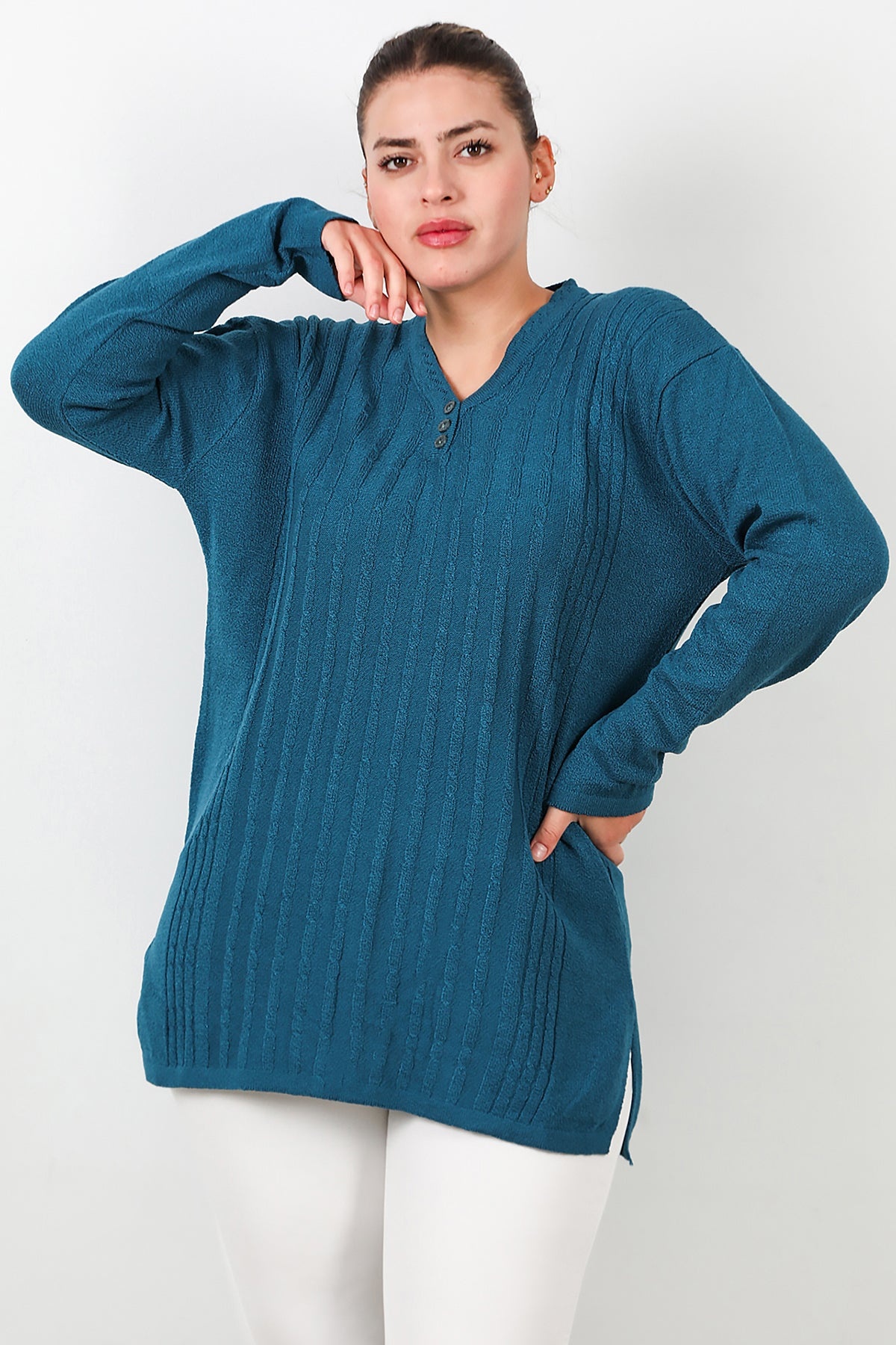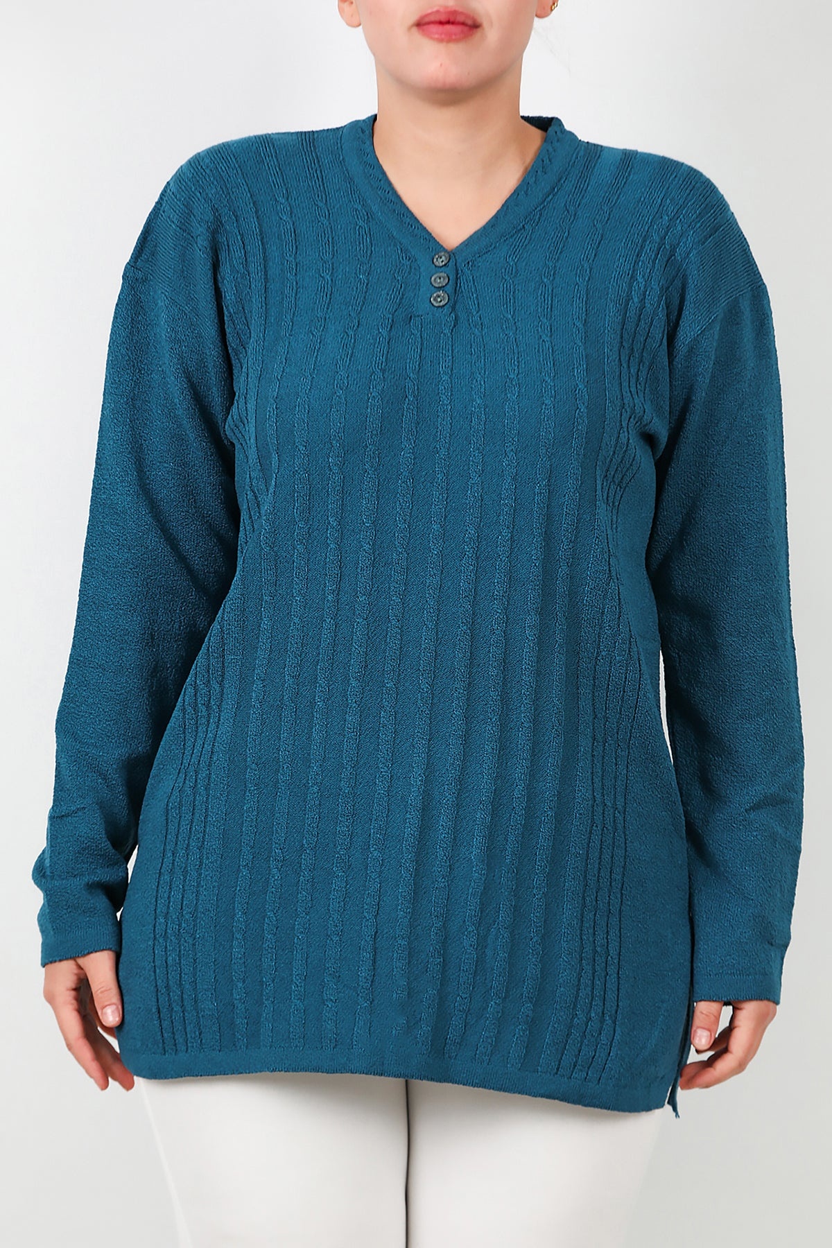 Büyük Beden V Yaka Üç Düğmeli Triko Bluz Mavi