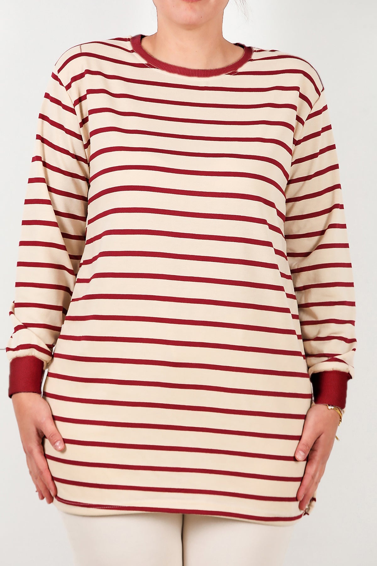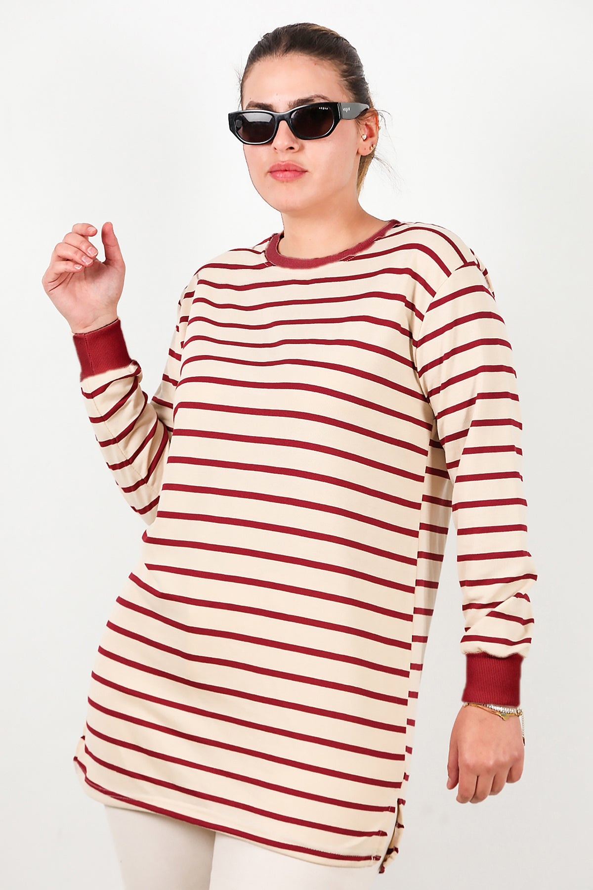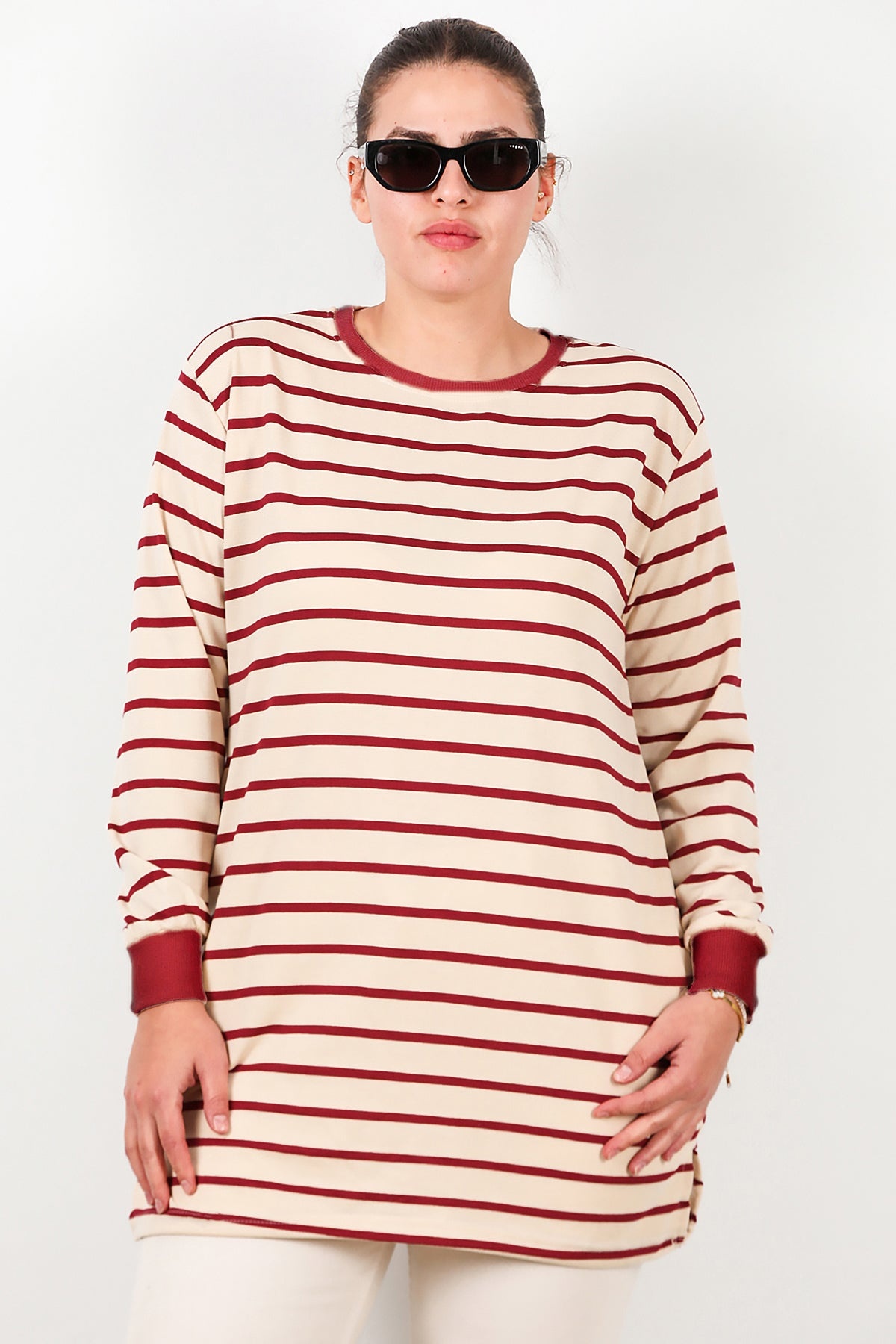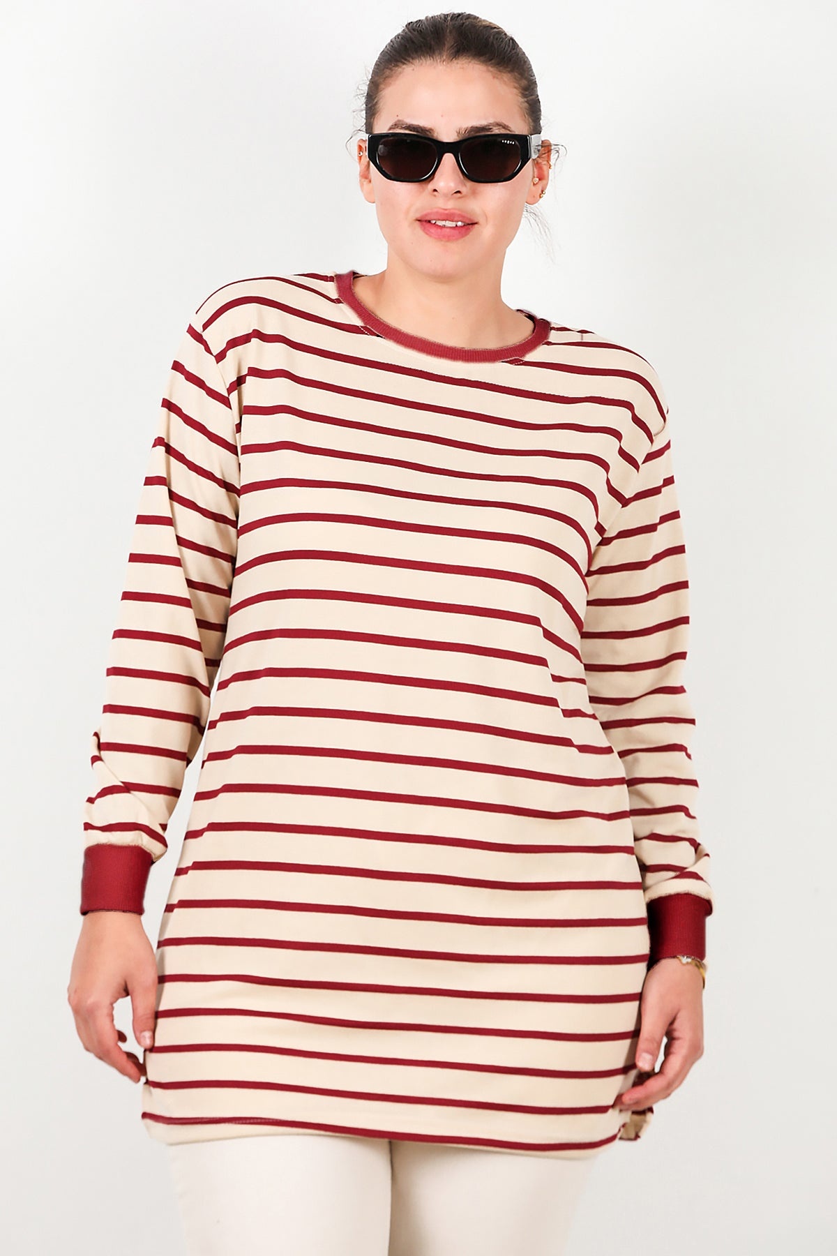 Büyük Beden Yan Yırtmaçlı Bisiklet Yaka Çizgili Tunik Bordo