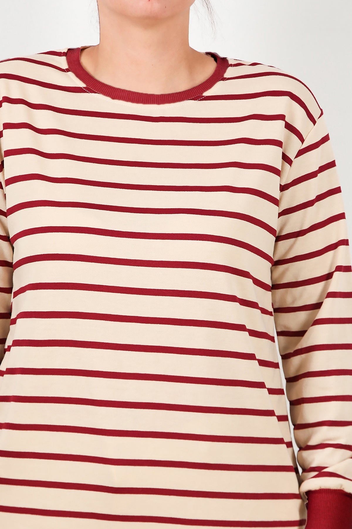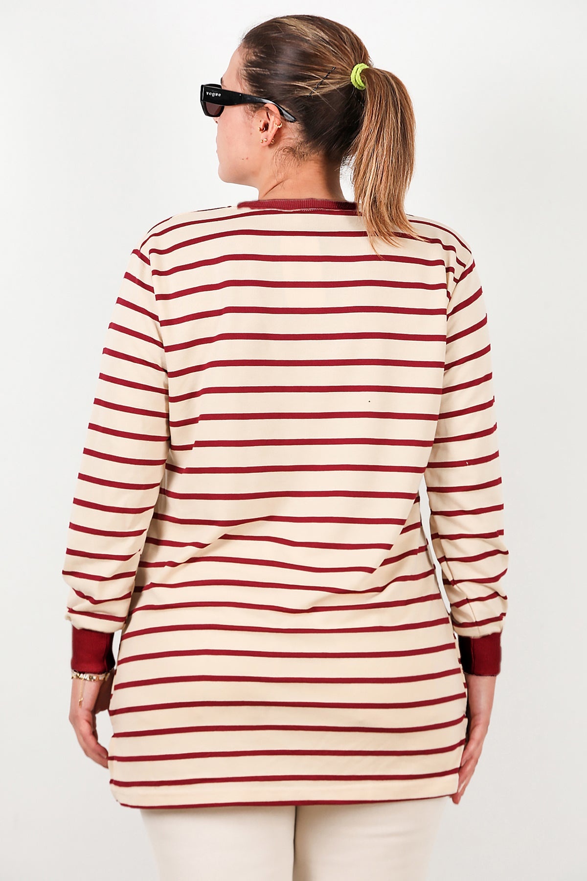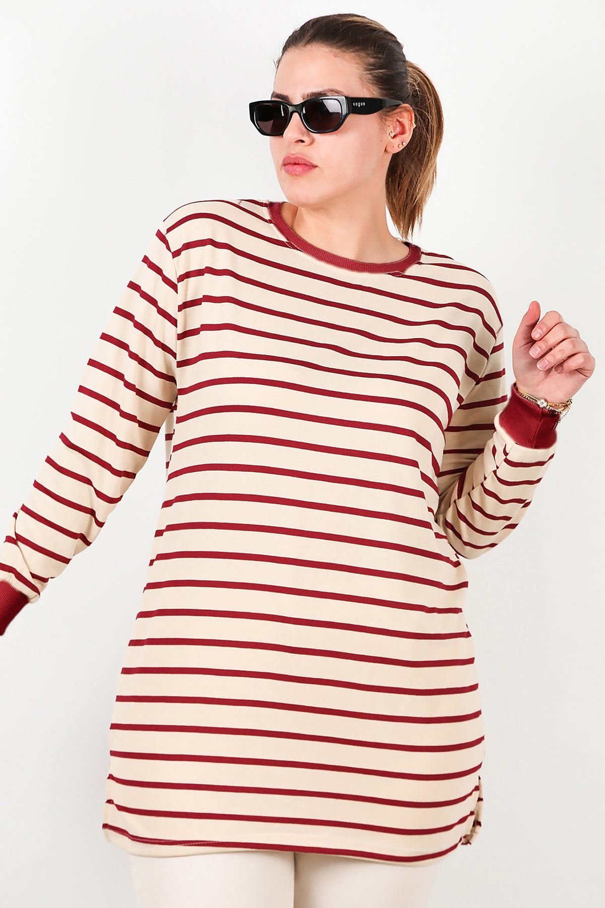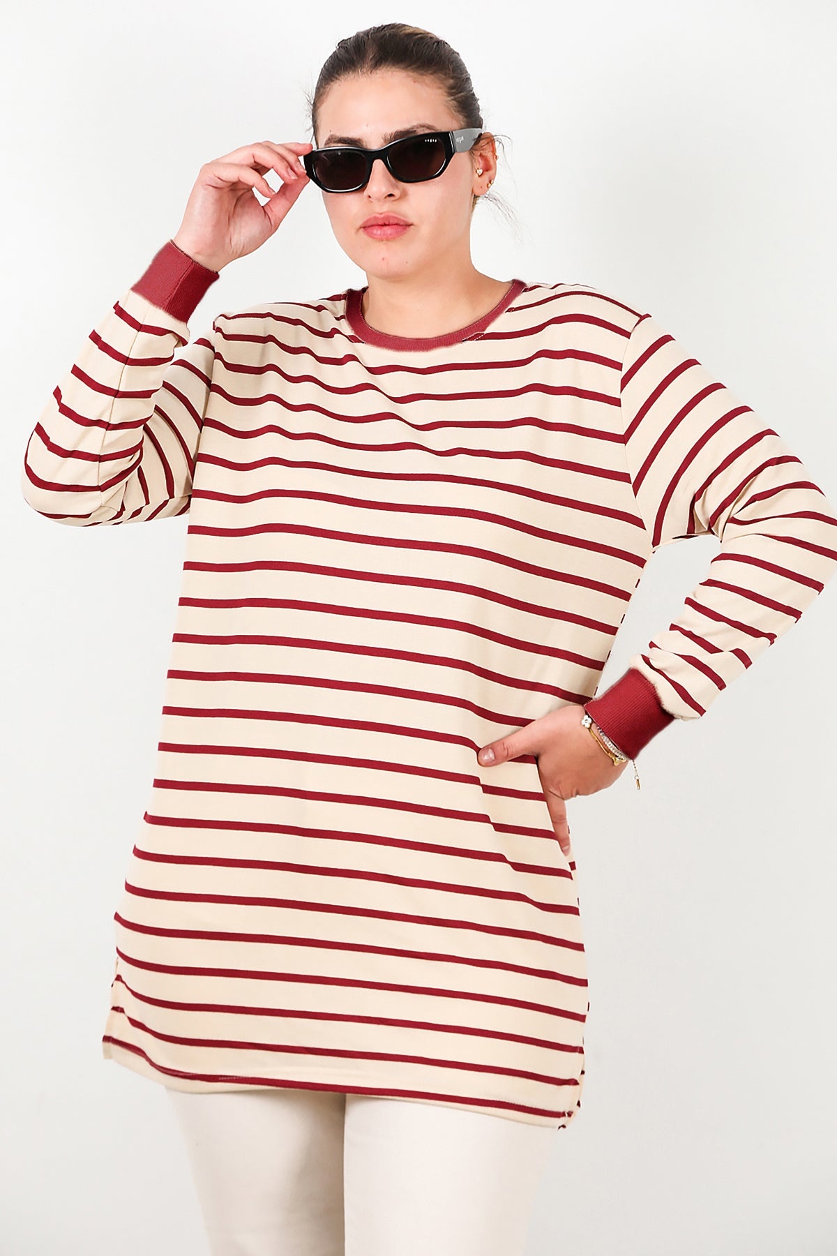 Büyük Beden Yan Yırtmaçlı Bisiklet Yaka Çizgili Tunik Bordo
