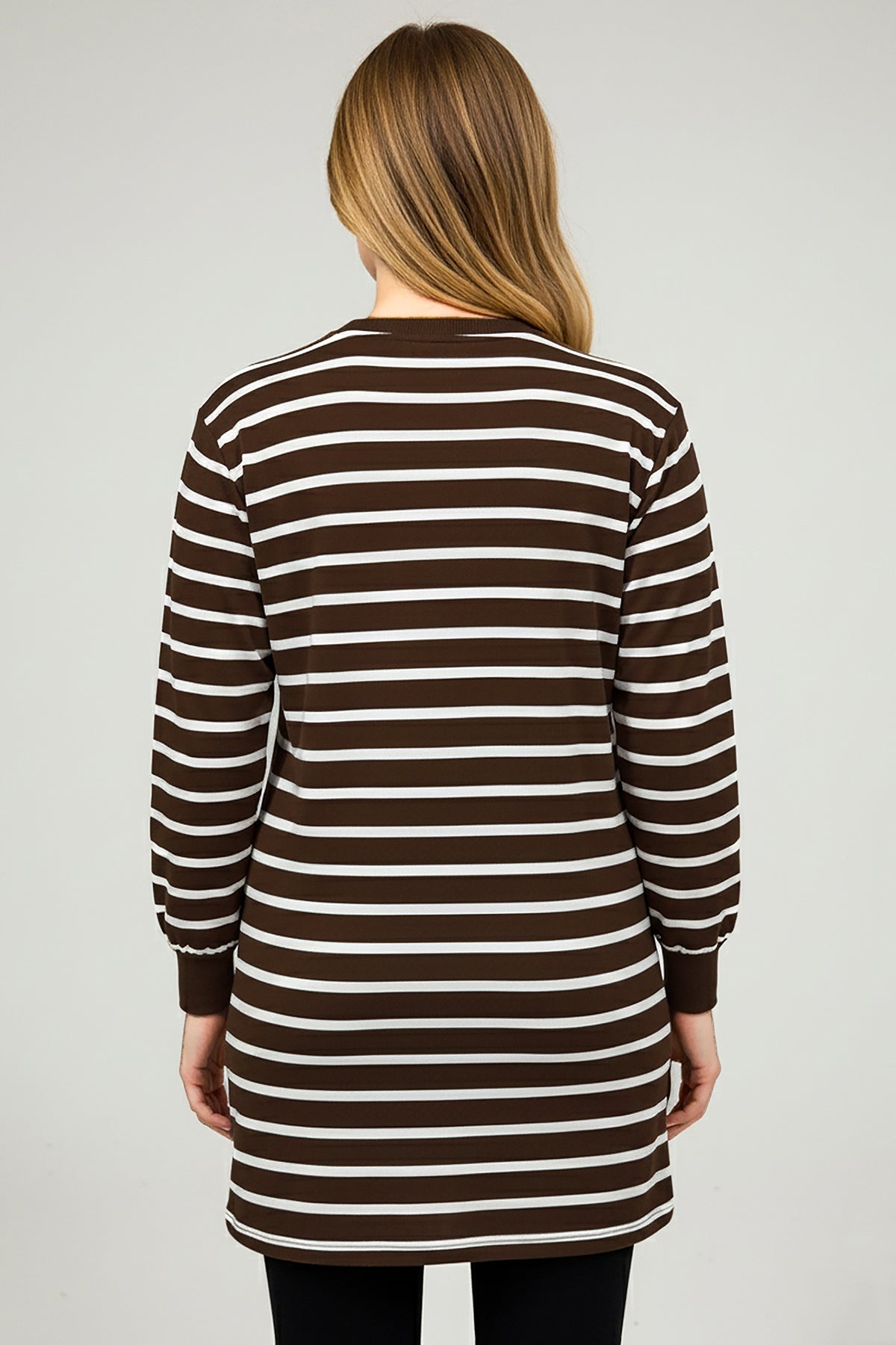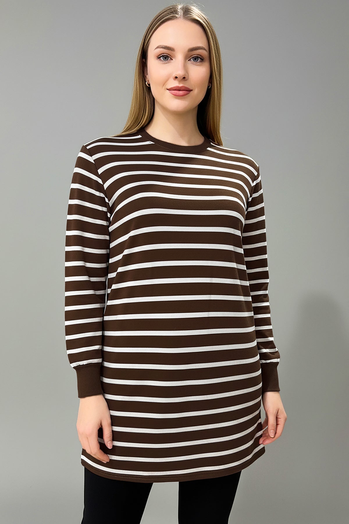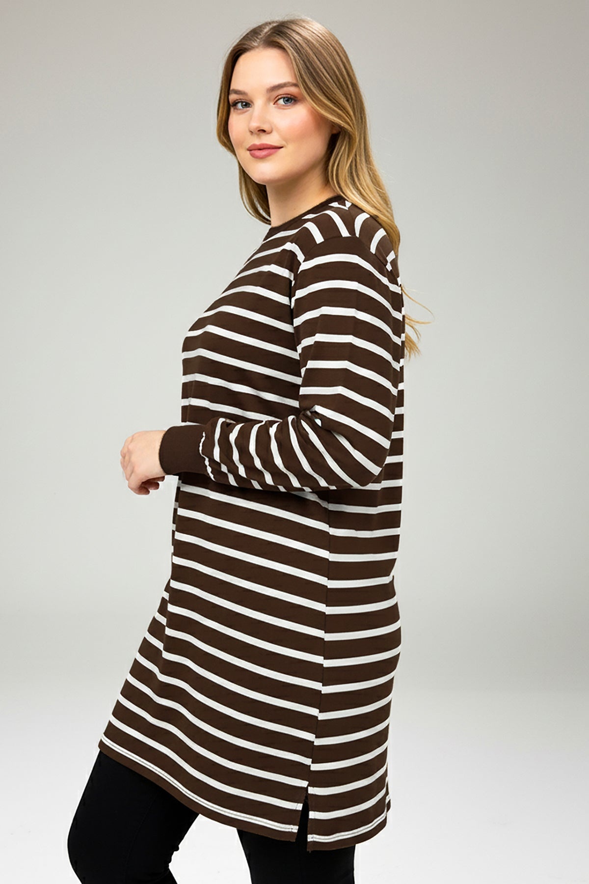 Büyük Beden Yan Yırtmaçlı Bisiklet Yaka Çizgili Tunik Kahverengi