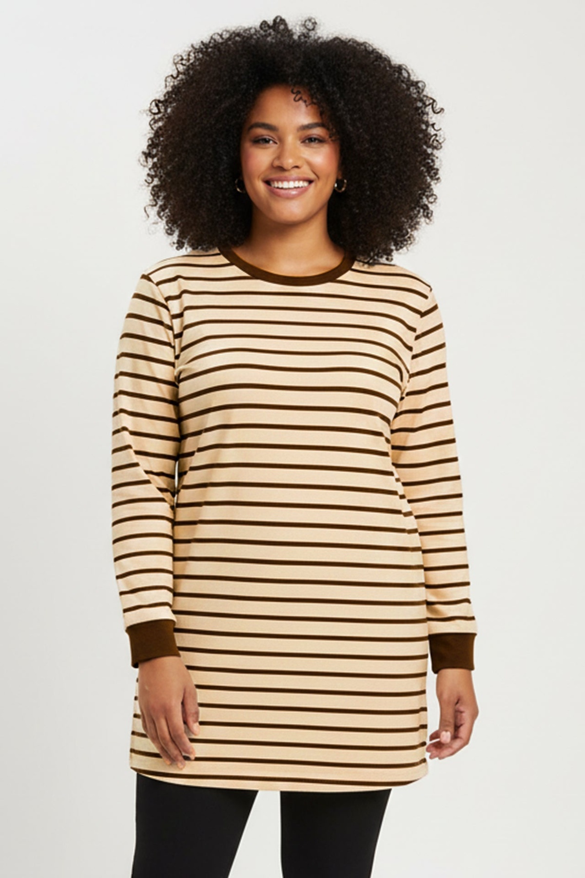 Büyük Beden Yan Yırtmaçlı Bisiklet Yaka Çizgili Tunik Krem