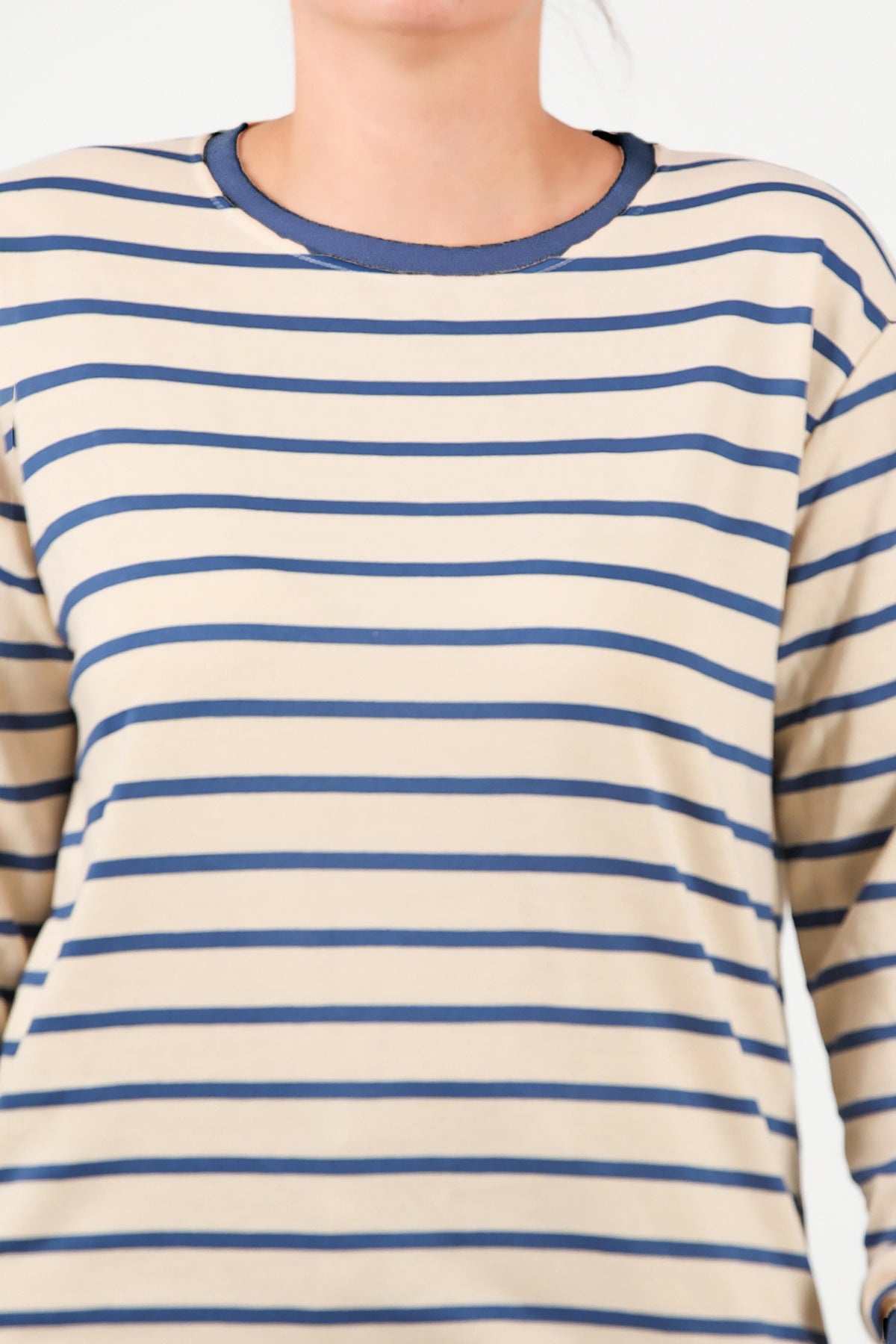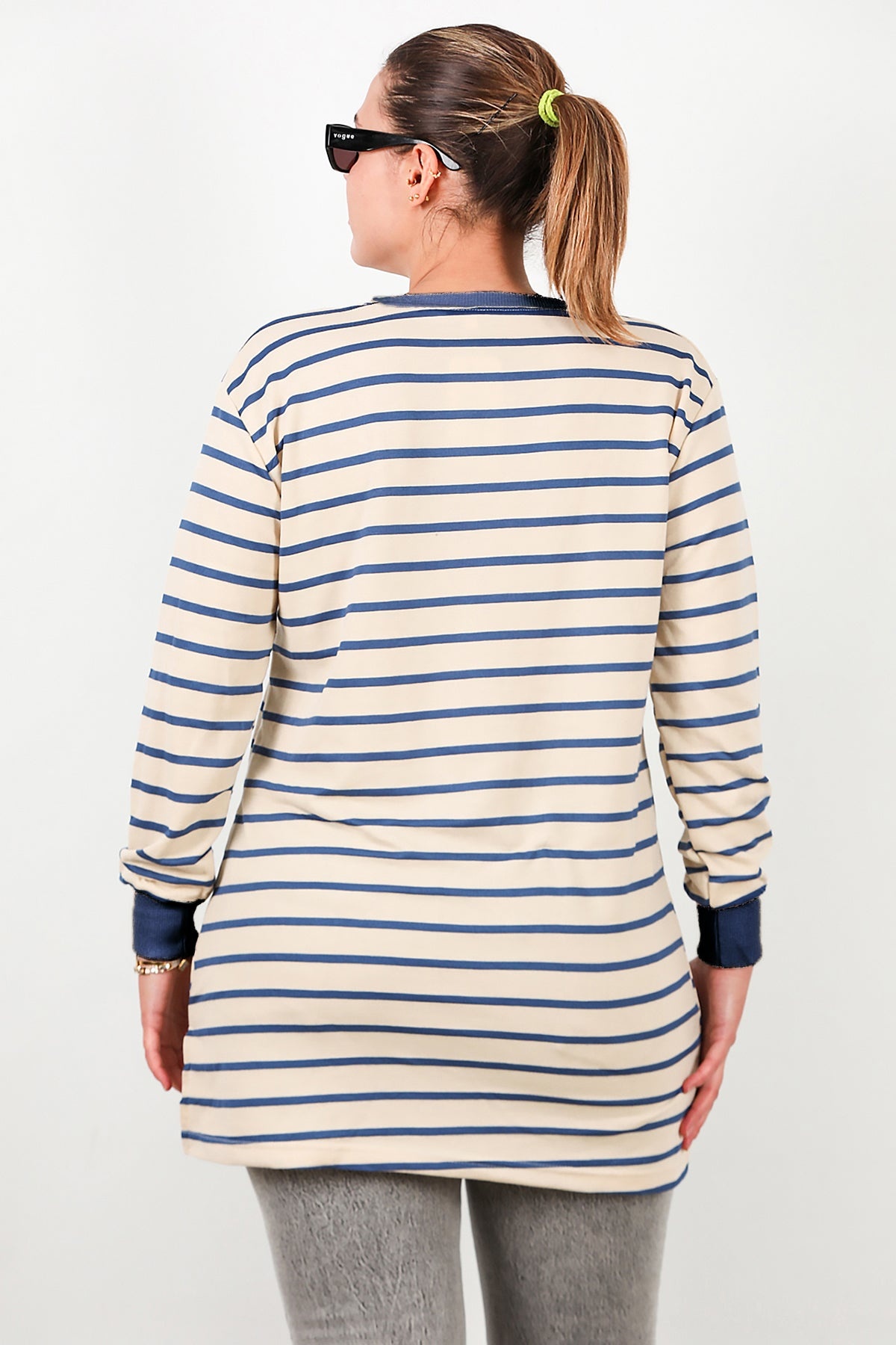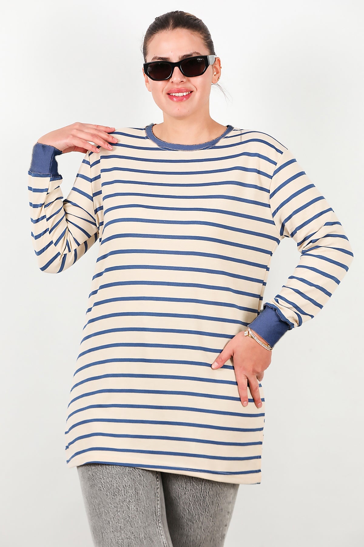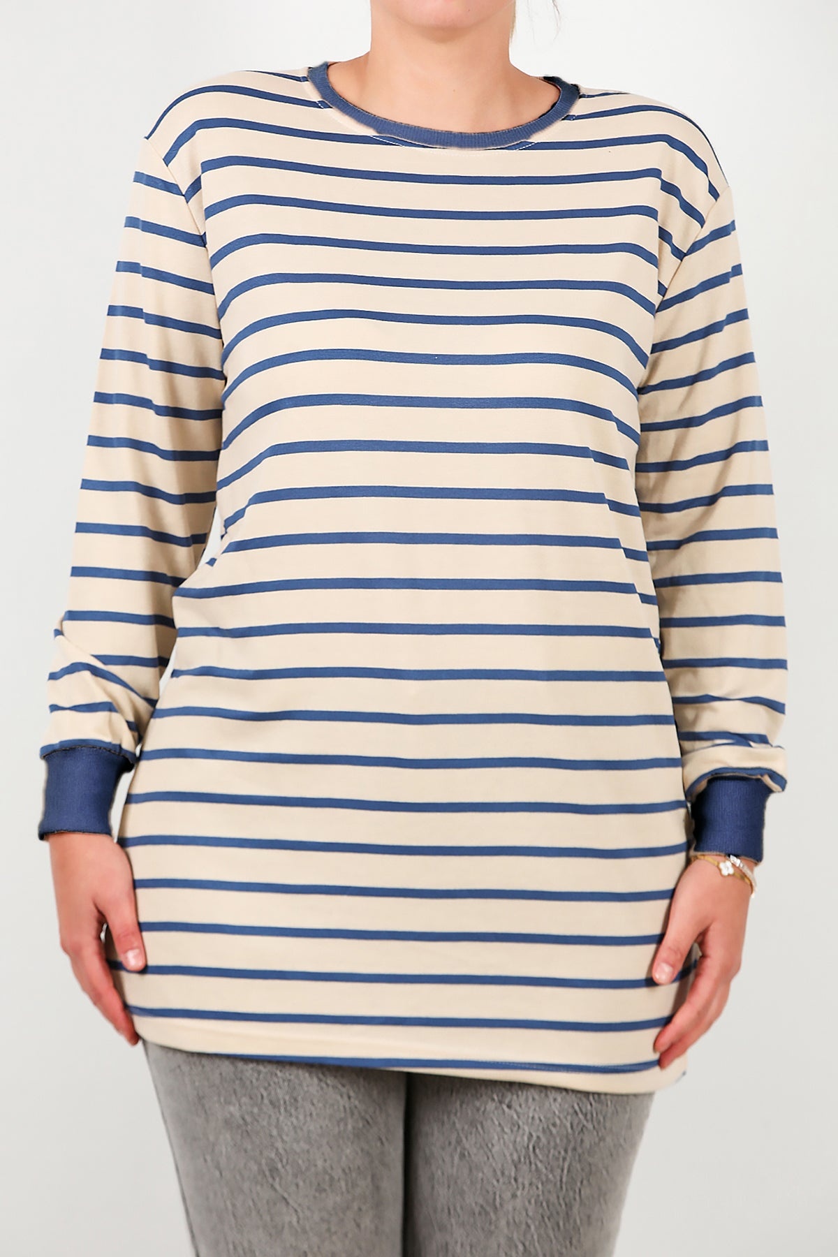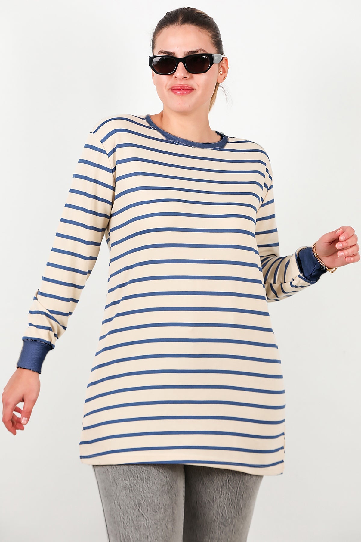 Büyük Beden Yan Yırtmaçlı Bisiklet Yaka Çizgili Tunik Mavi