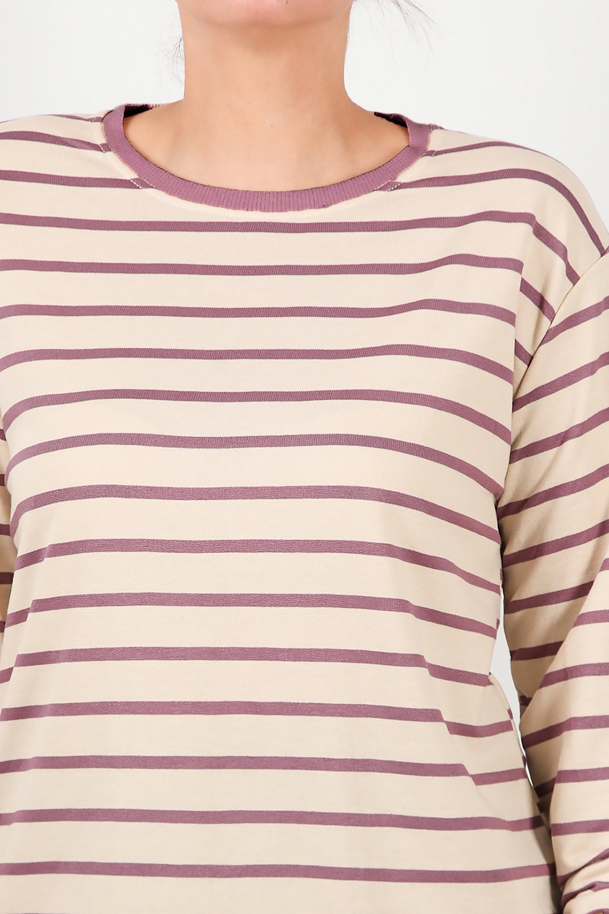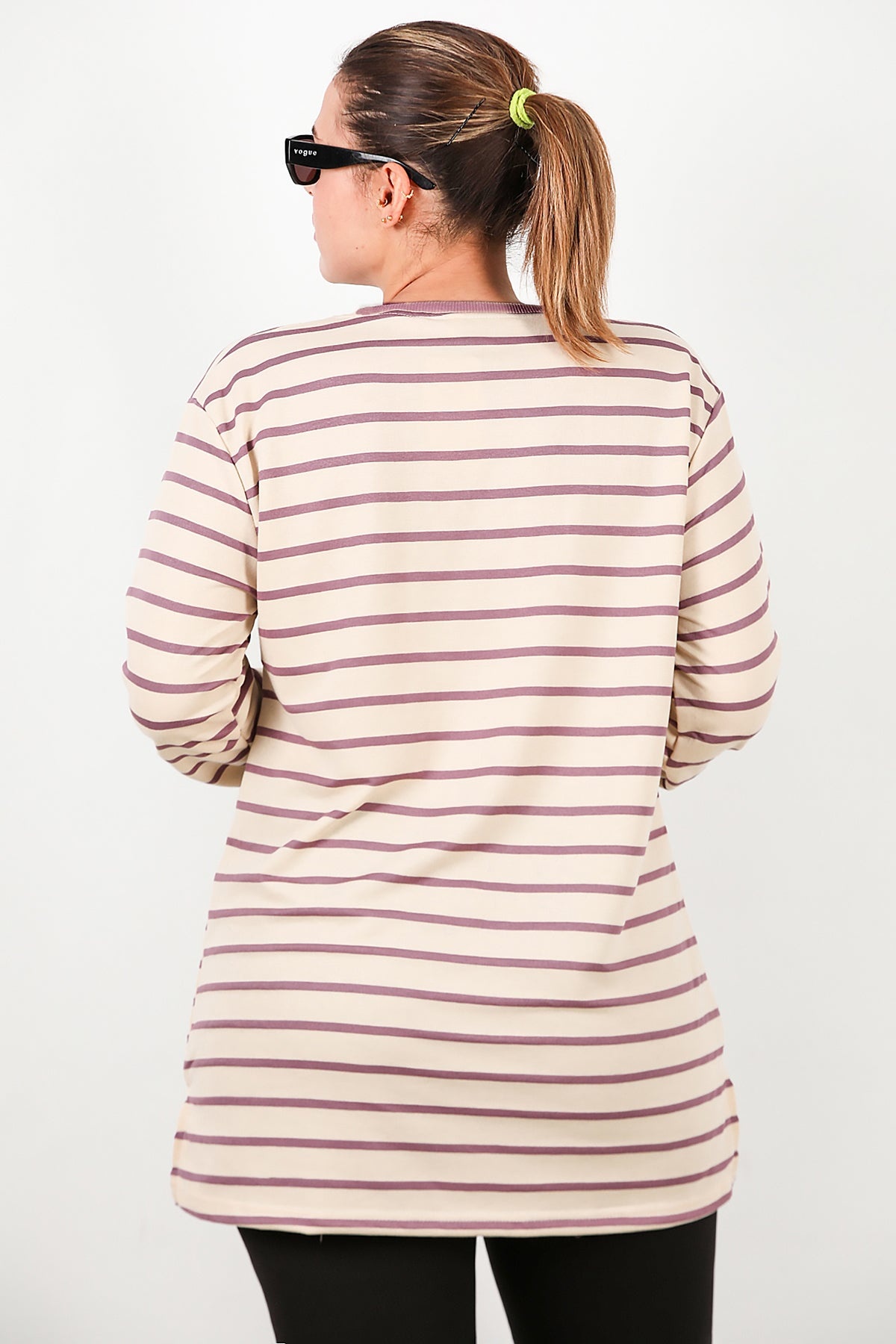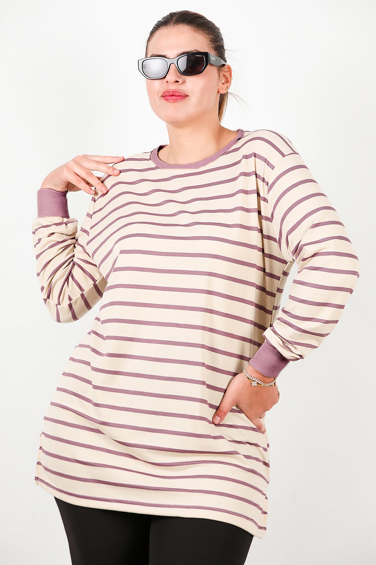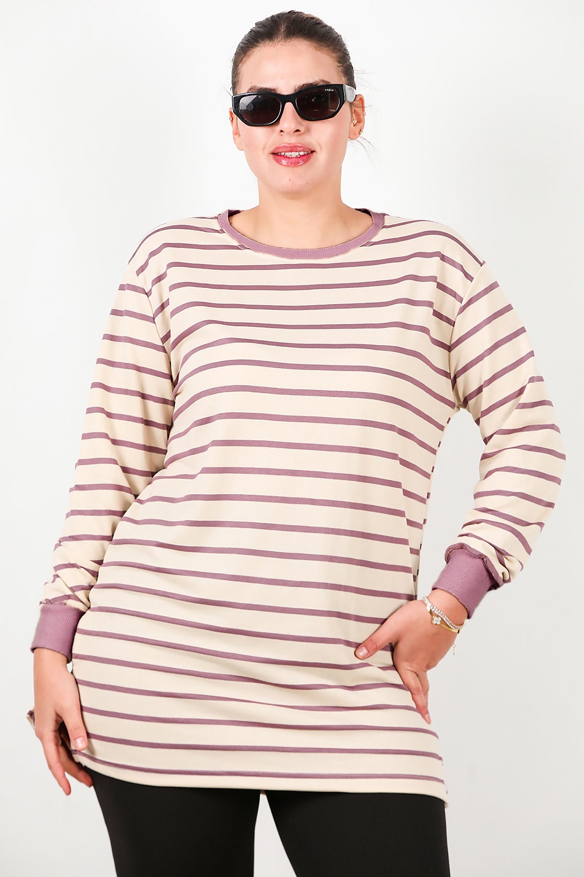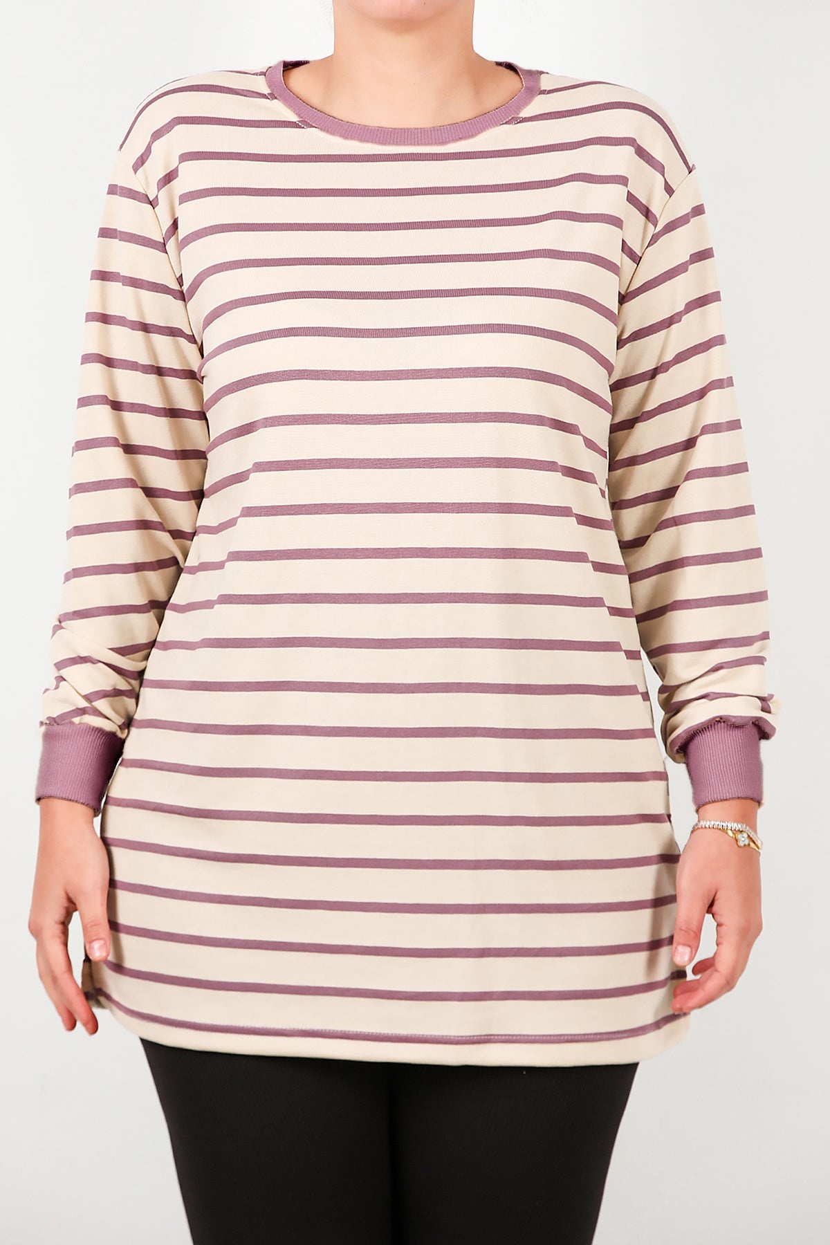 Büyük Beden Yan Yırtmaçlı Bisiklet Yaka Çizgili Tunik Mor