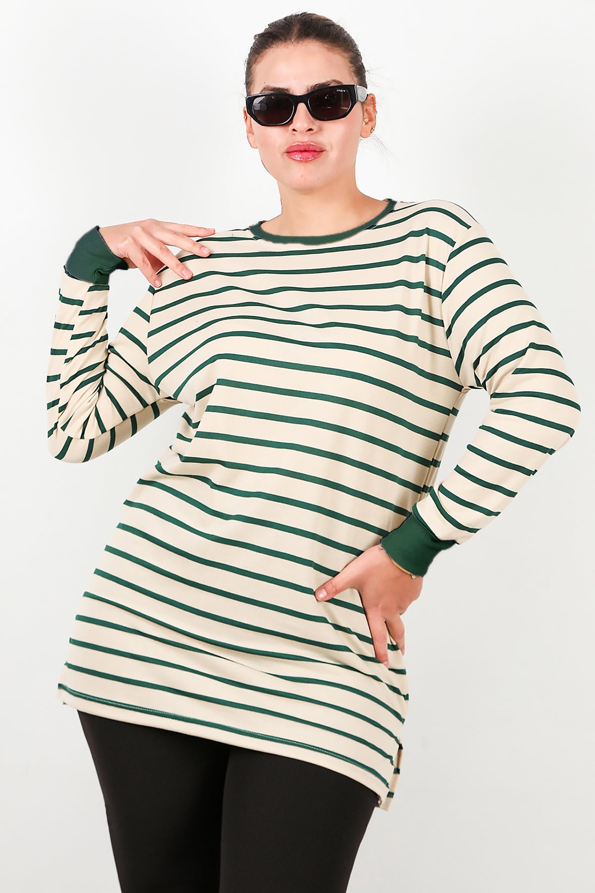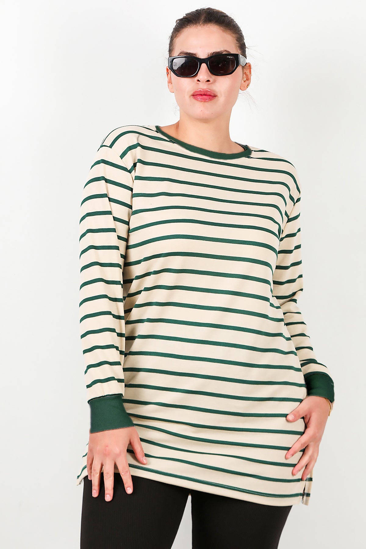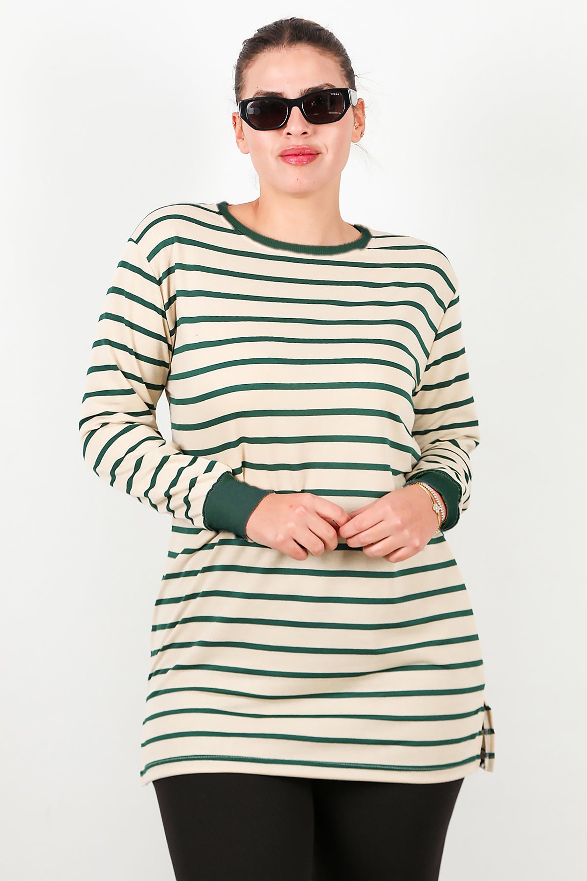 Büyük Beden Yan Yırtmaçlı Bisiklet Yaka Çizgili Tunik Yeşil