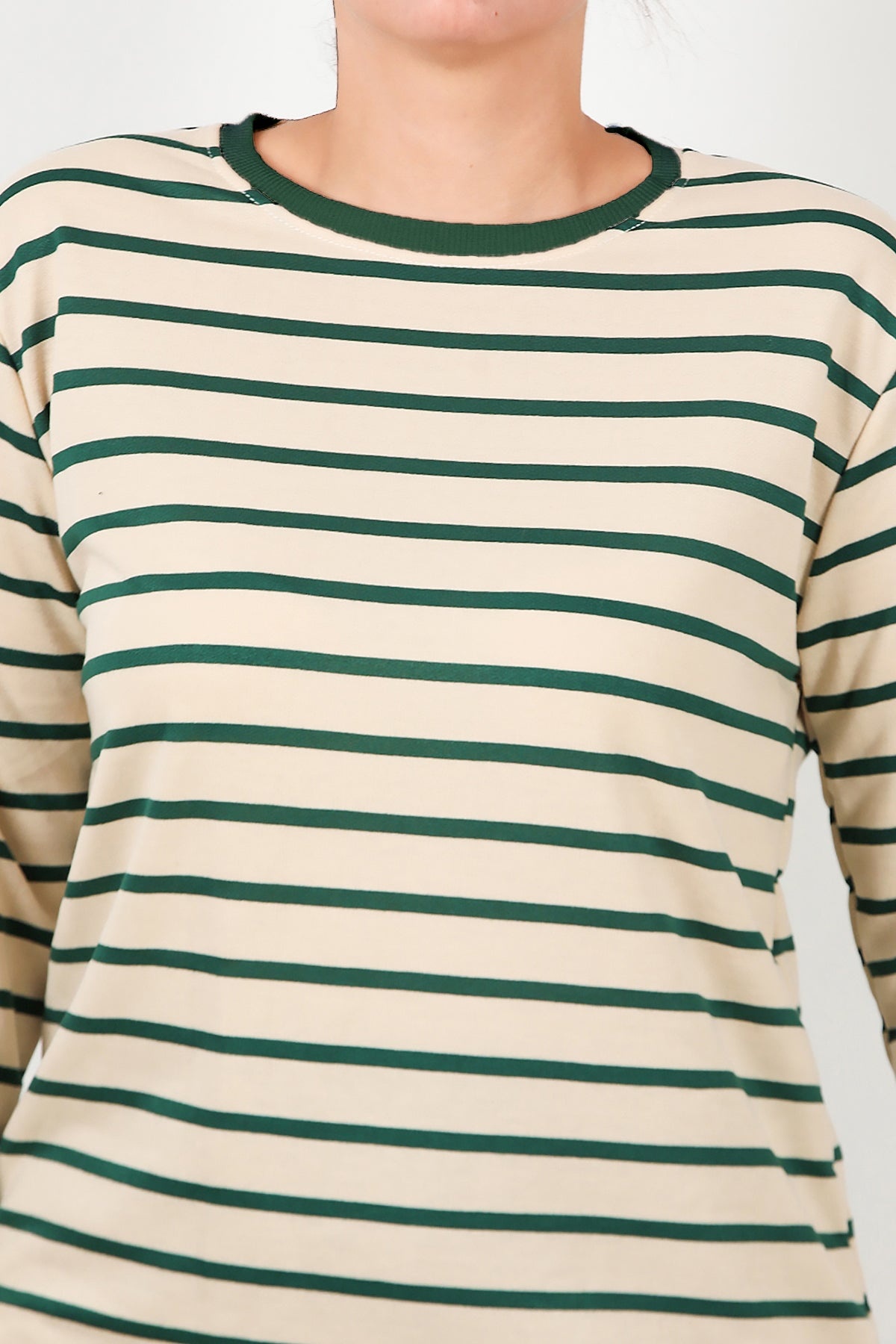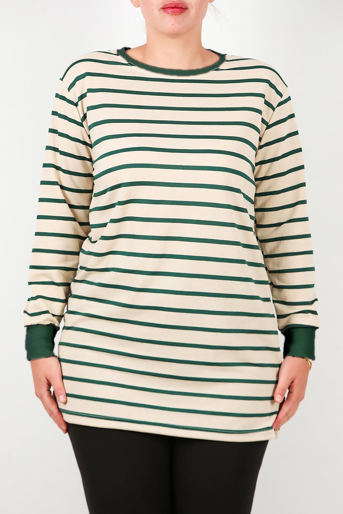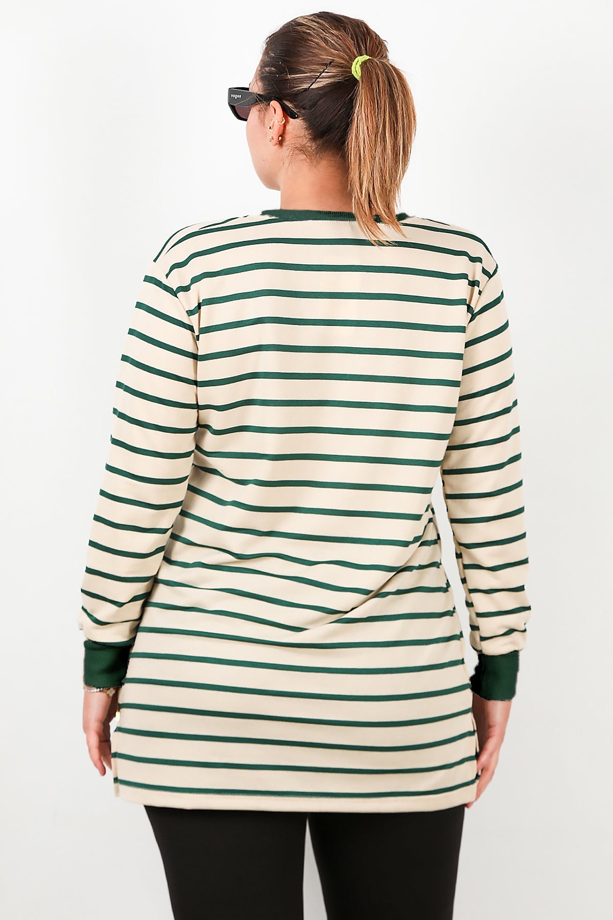 Büyük Beden Yan Yırtmaçlı Bisiklet Yaka Çizgili Tunik Yeşil