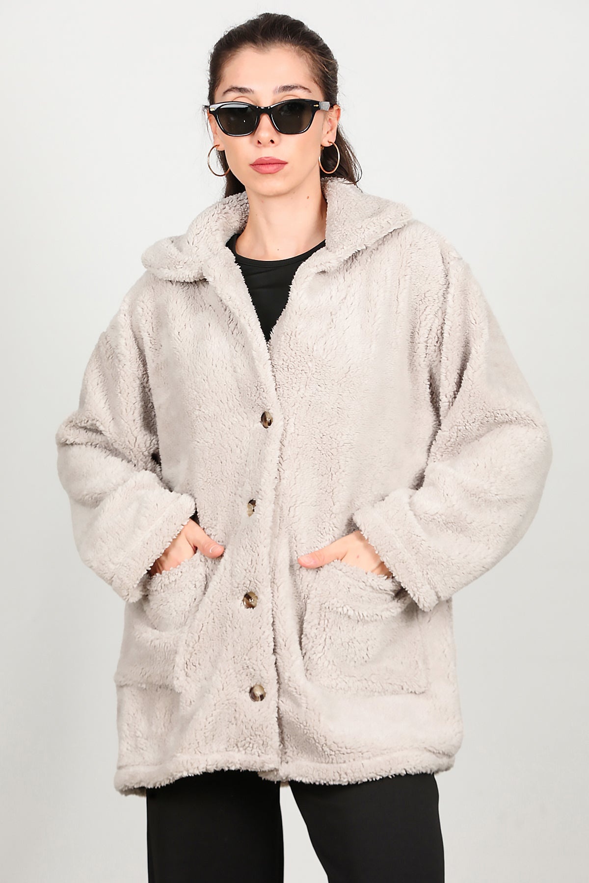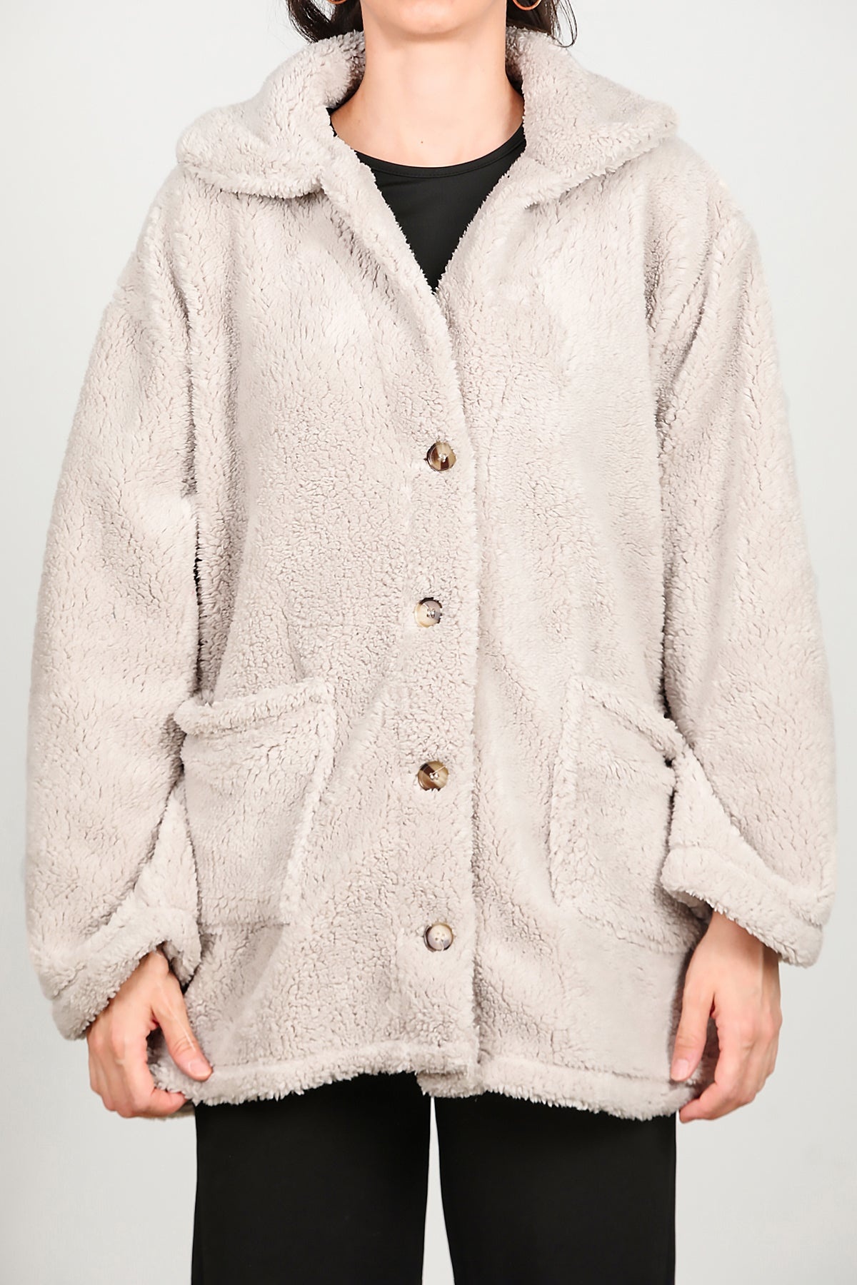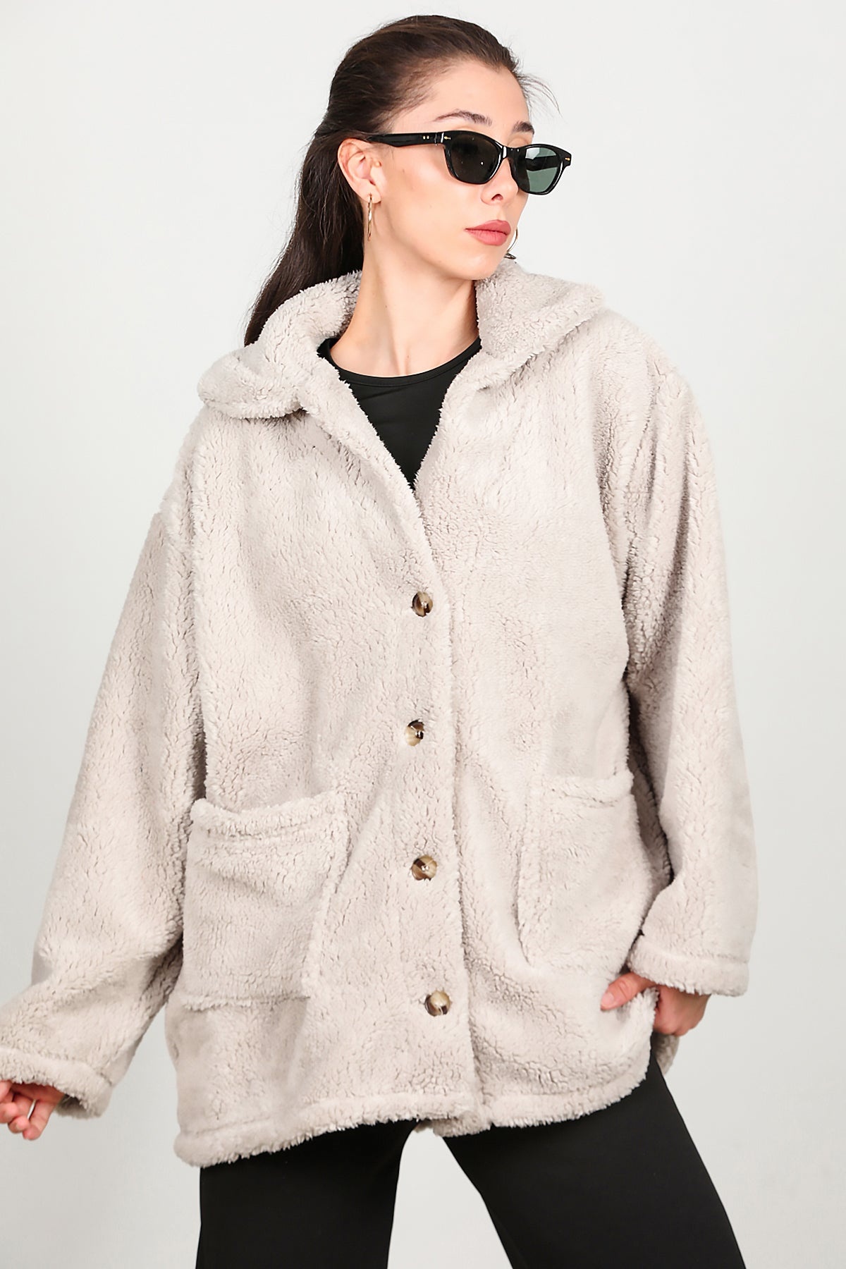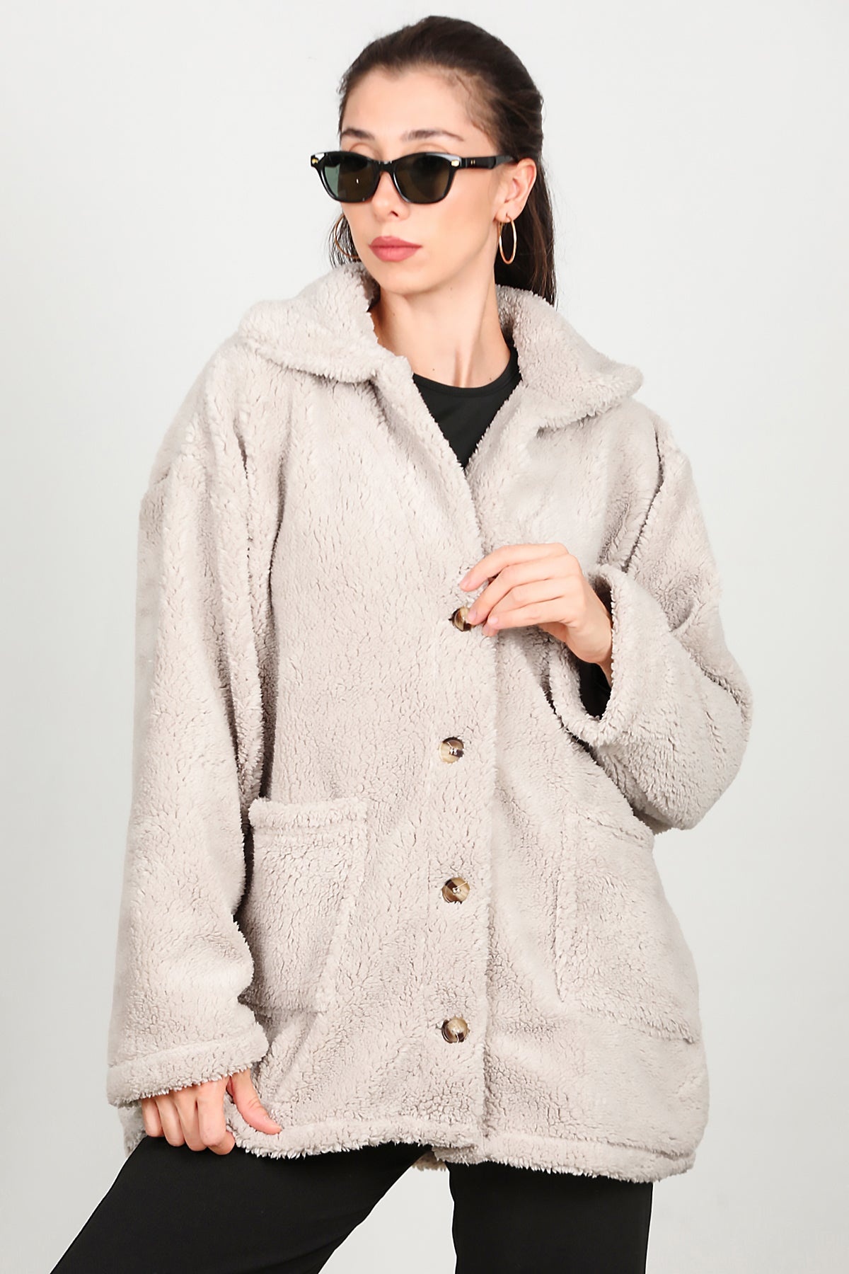 Kadın Önü Düğmeli Peluş Ceket Taş