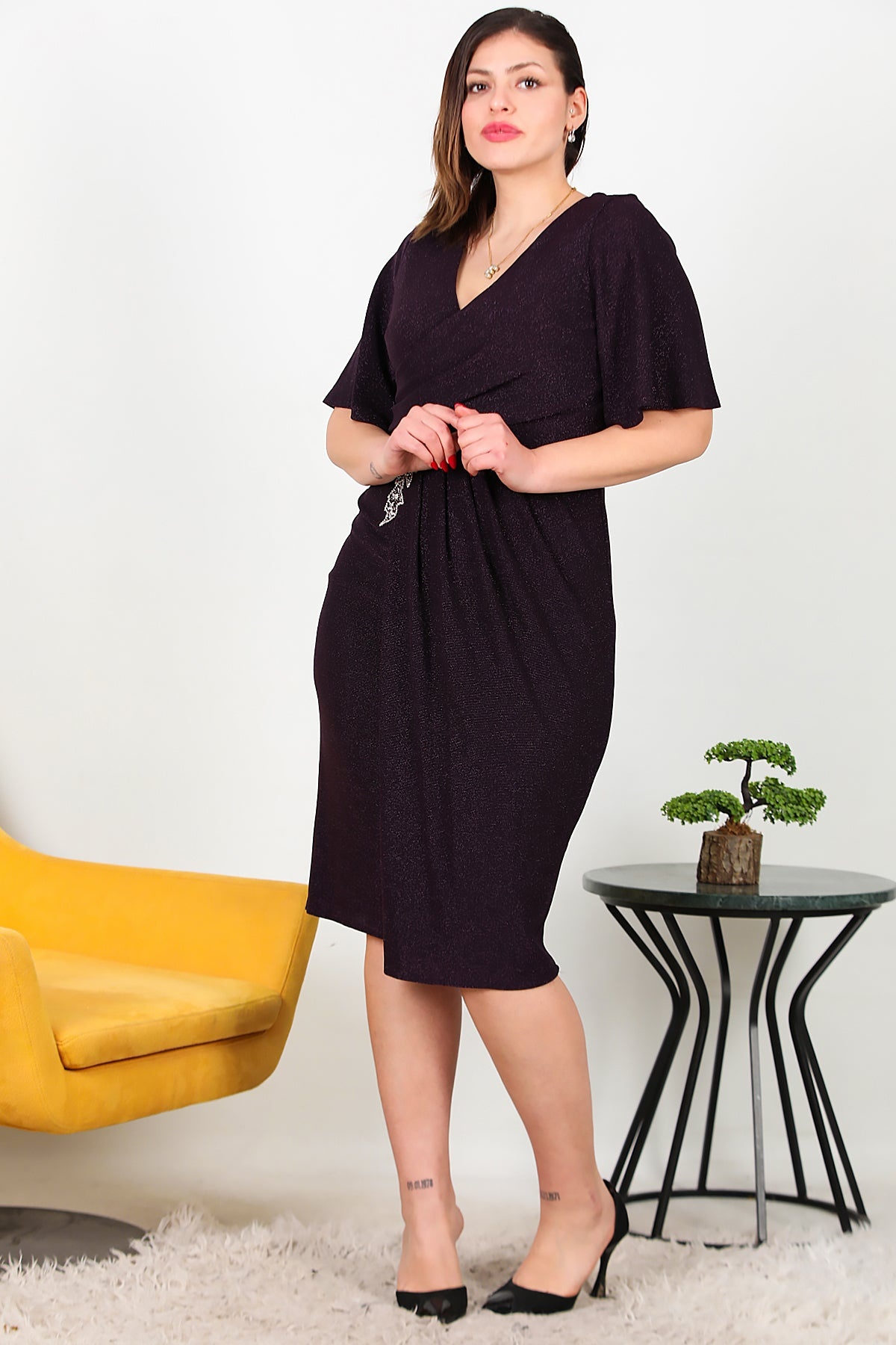 Büyük Beden Bel Aksesuarlı Midi Abiye Mor