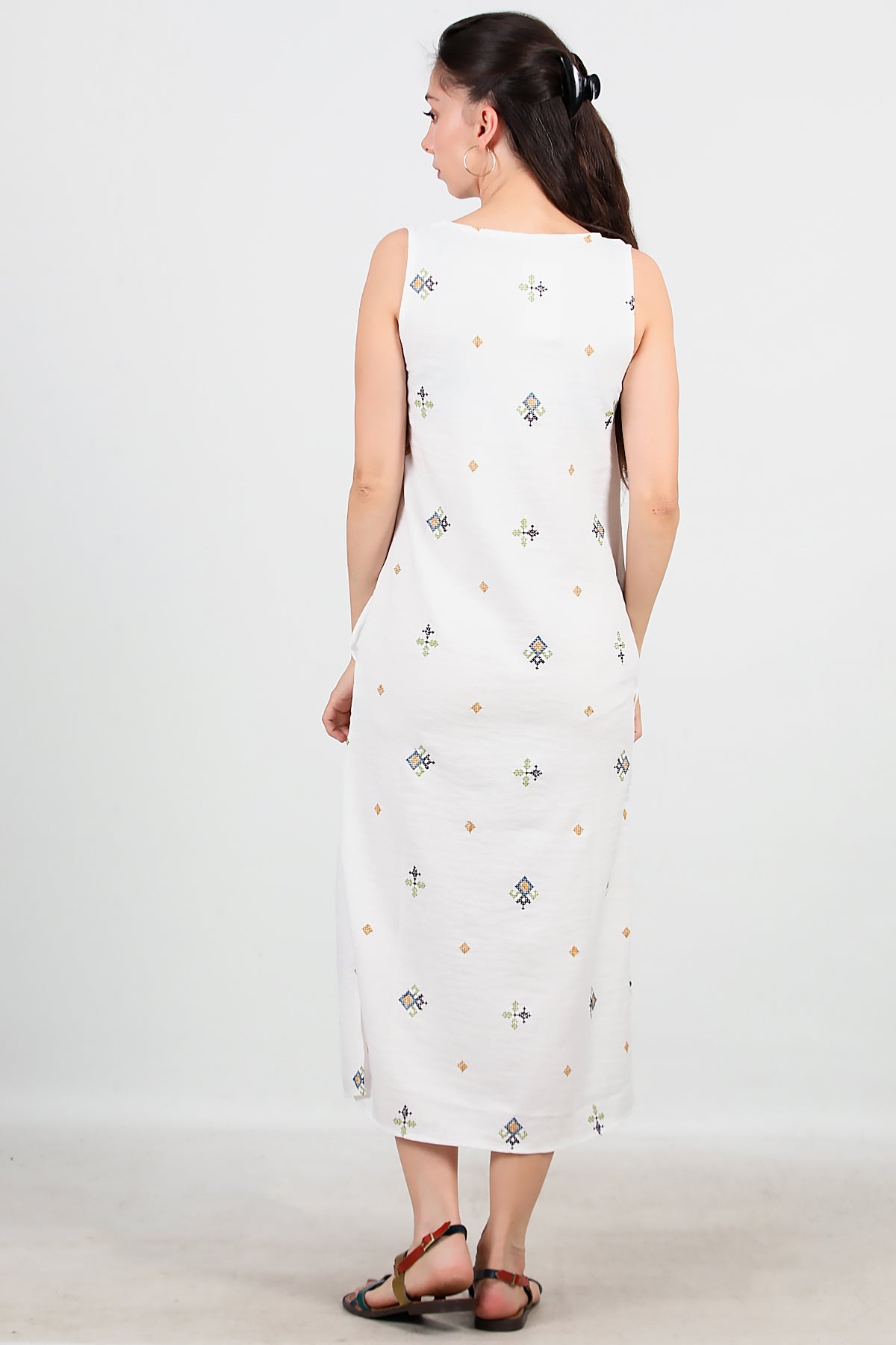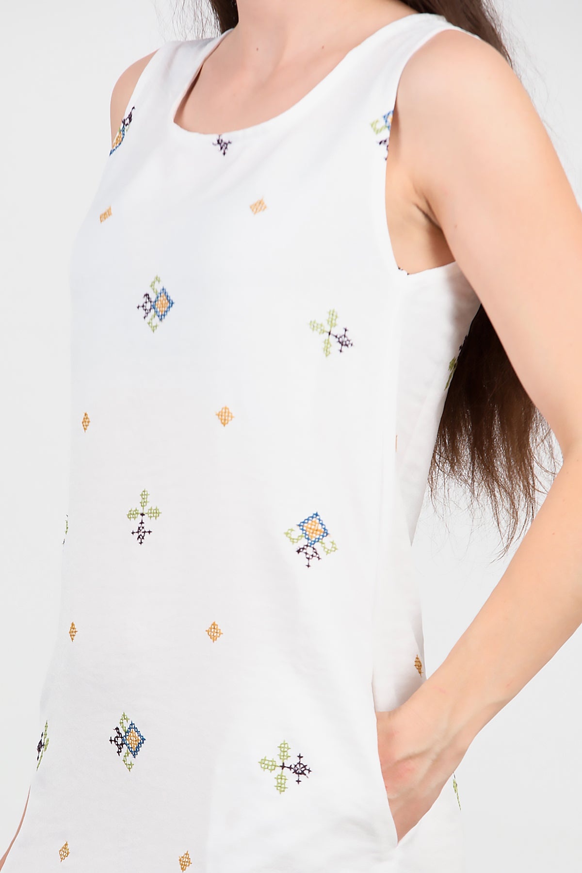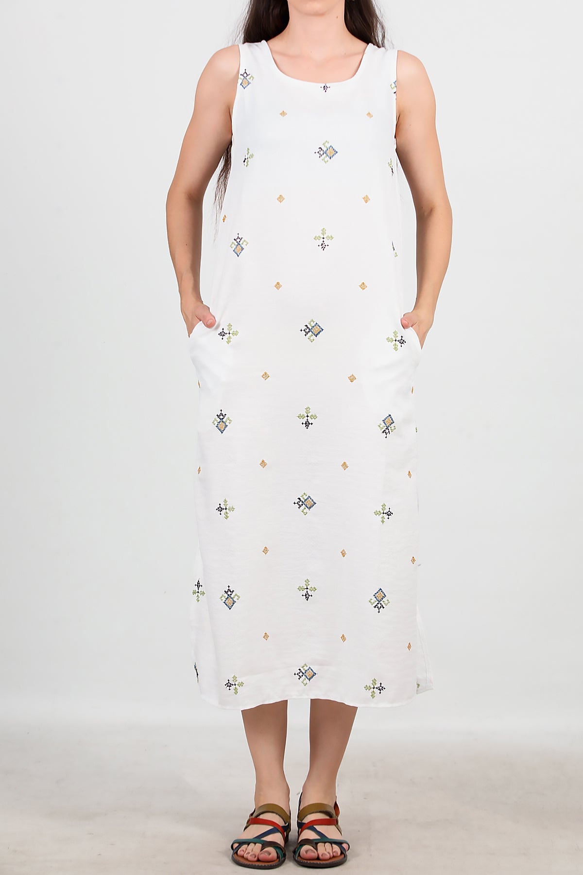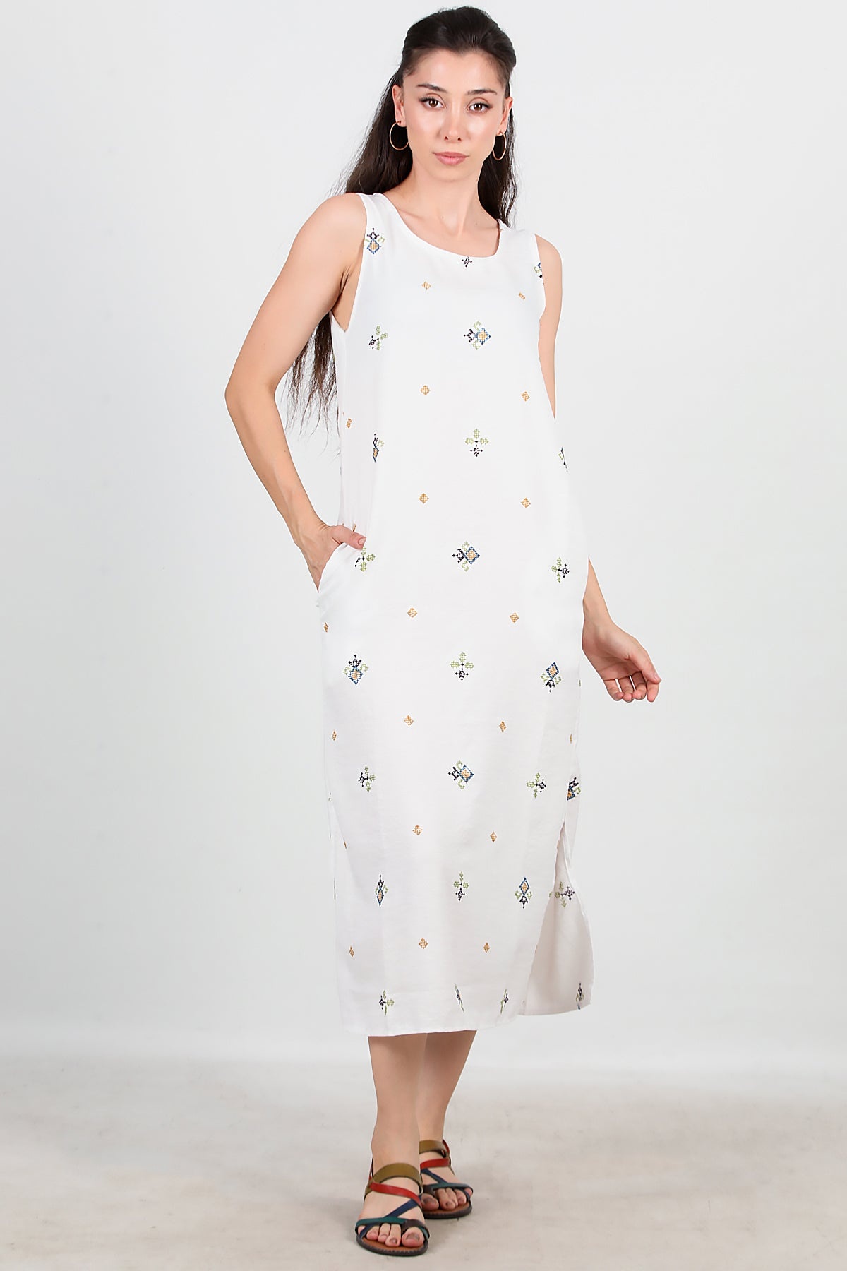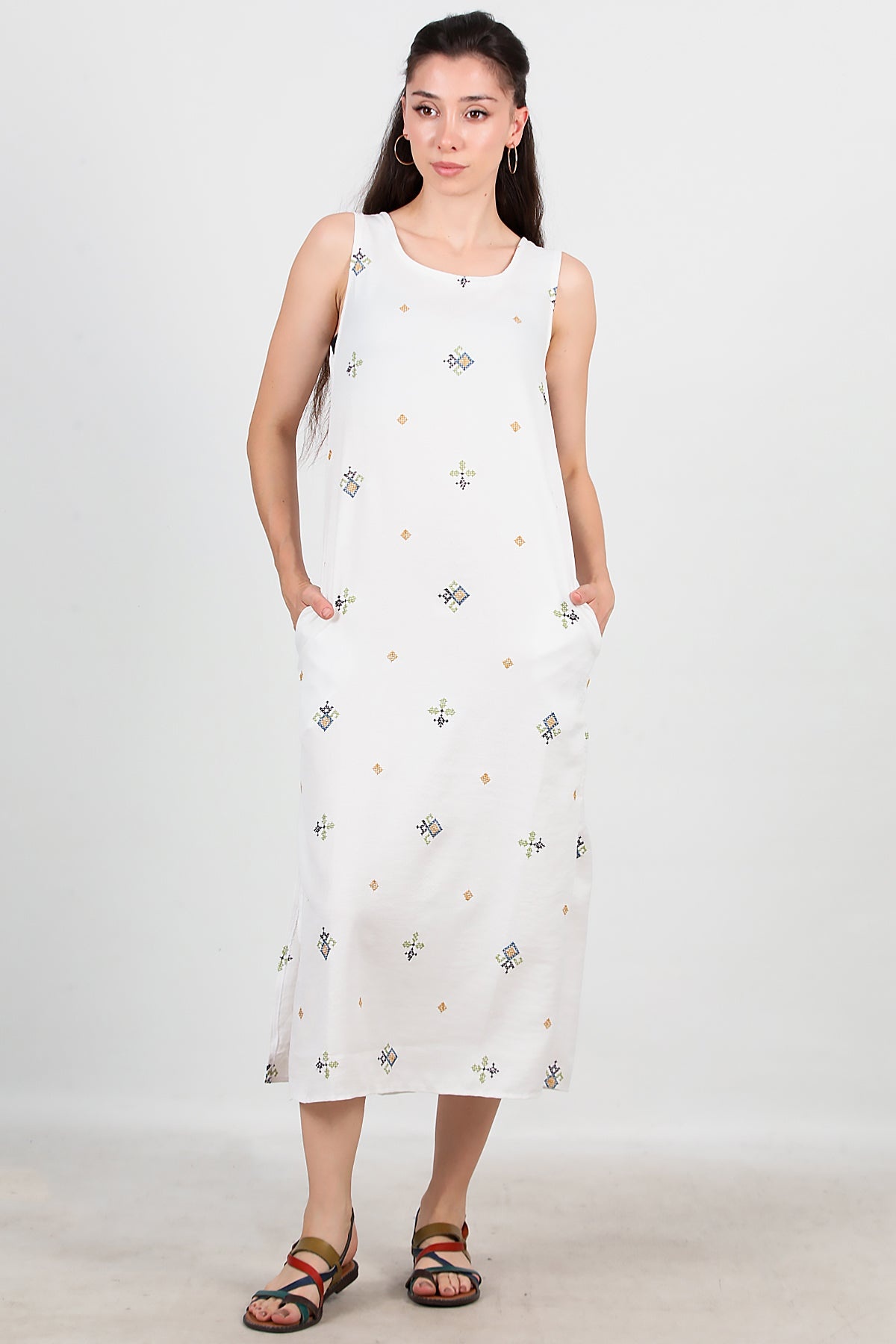 Kadın Kalın Askılı Nakışlı Elbise Ekru