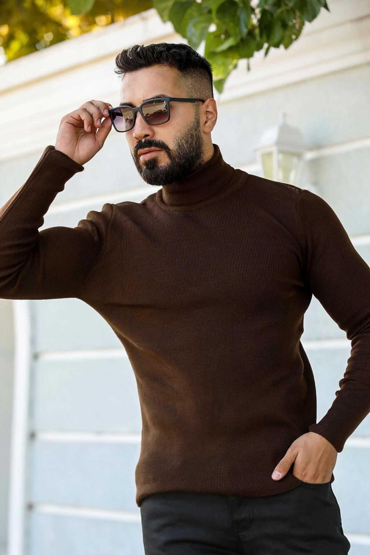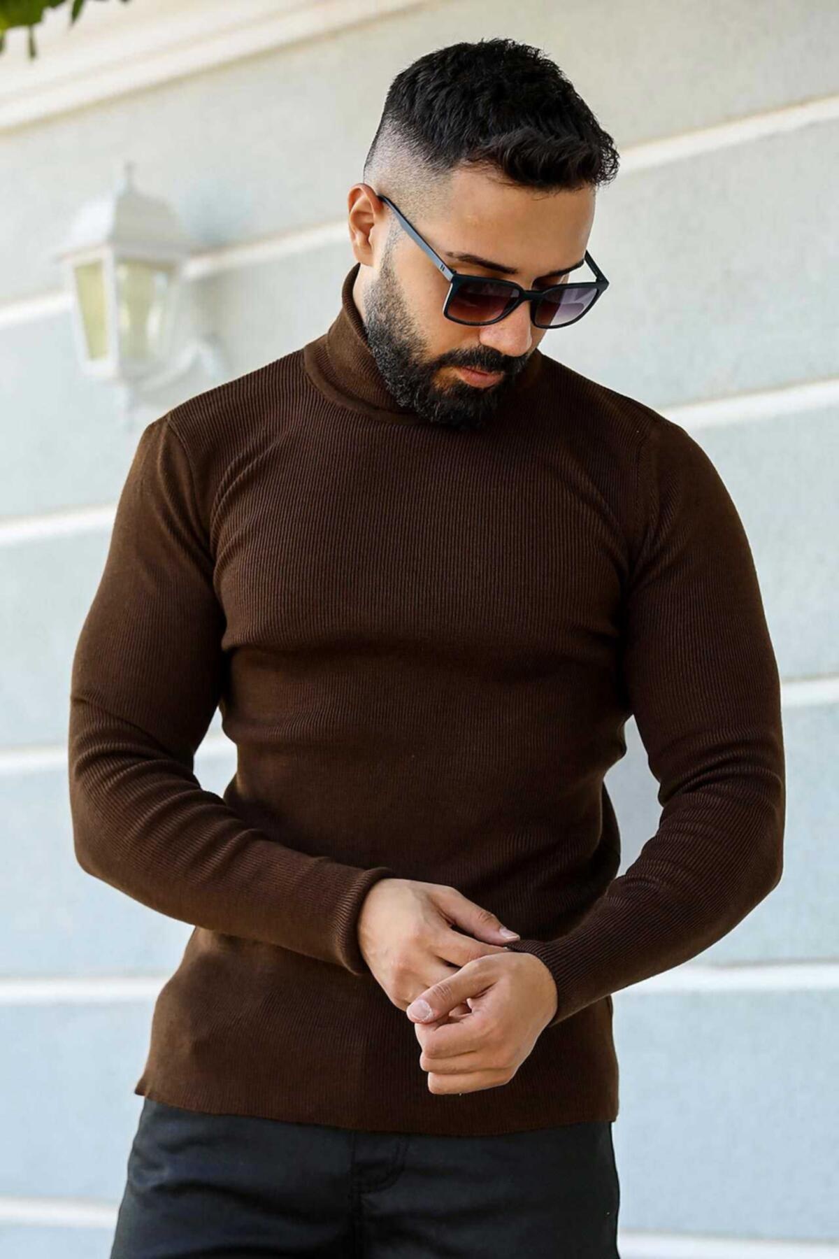 Erkek Balıkçı Yaka Fitilli Triko Kazak Kahverengi