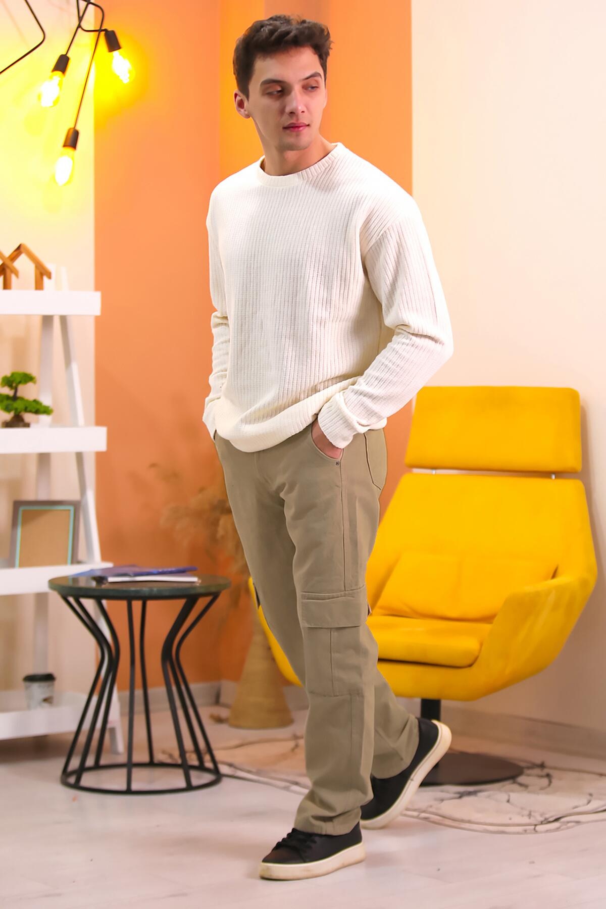 Erkek Kargo Cepli Boru Paça Kot Pantolon Bej