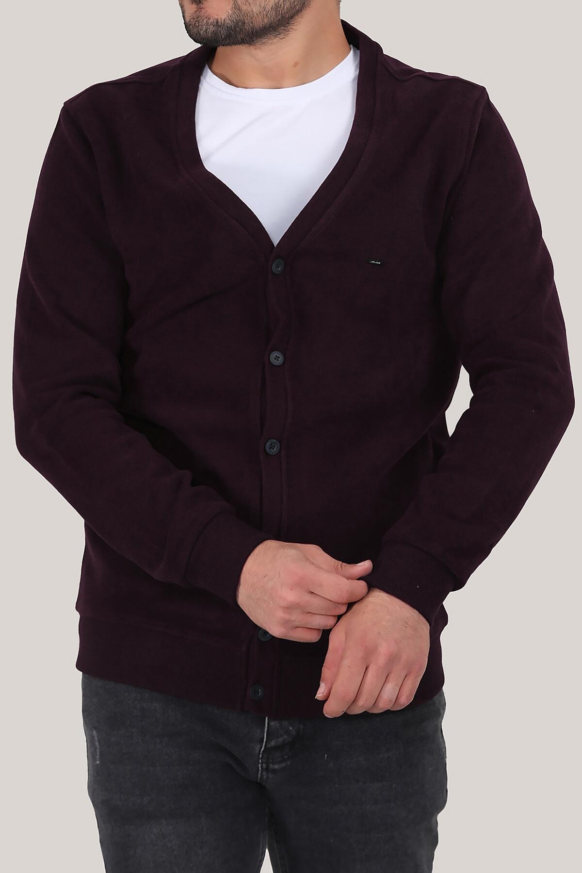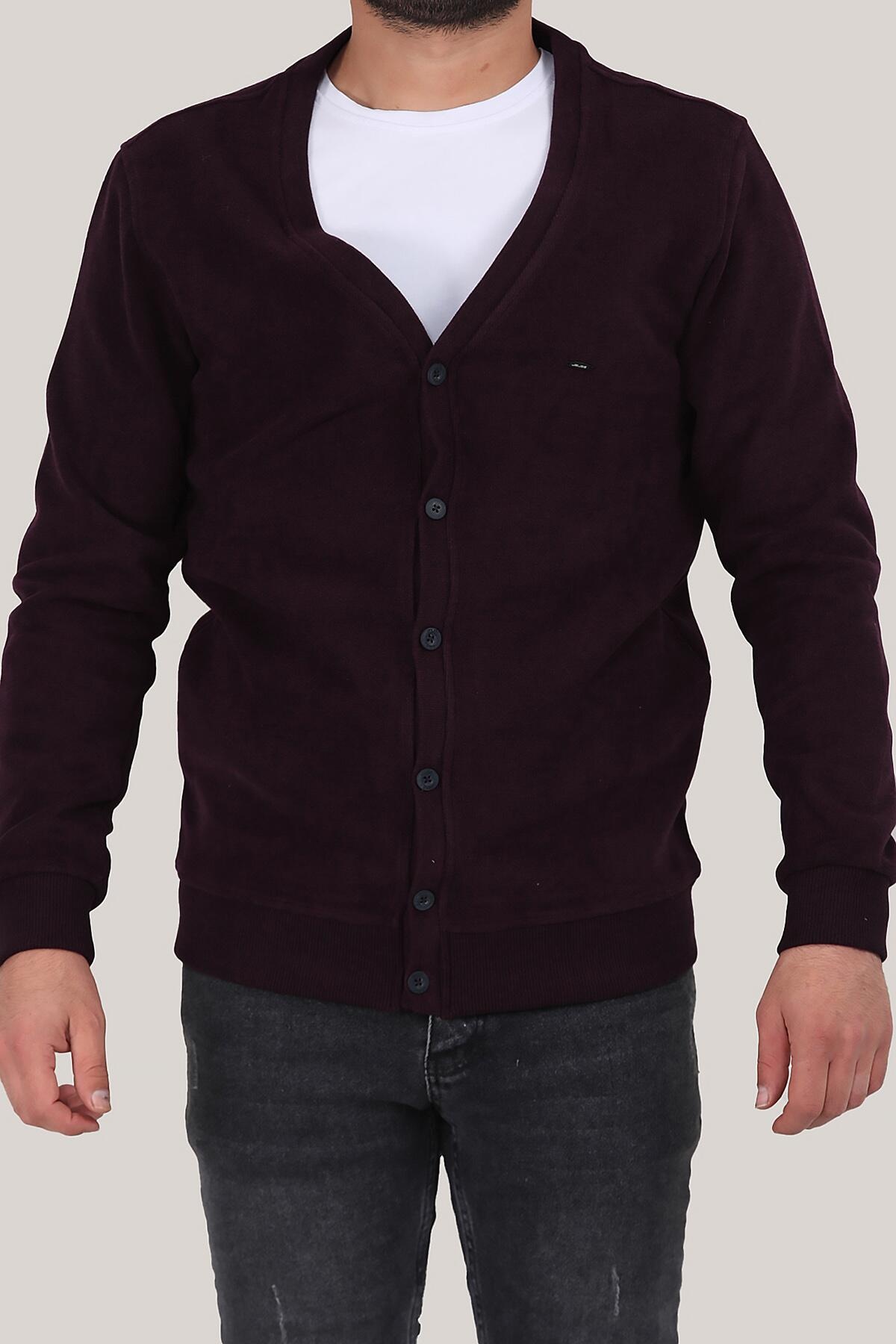 Erkek V Yaka Düğmeli Kadife Hırka Mürdüm