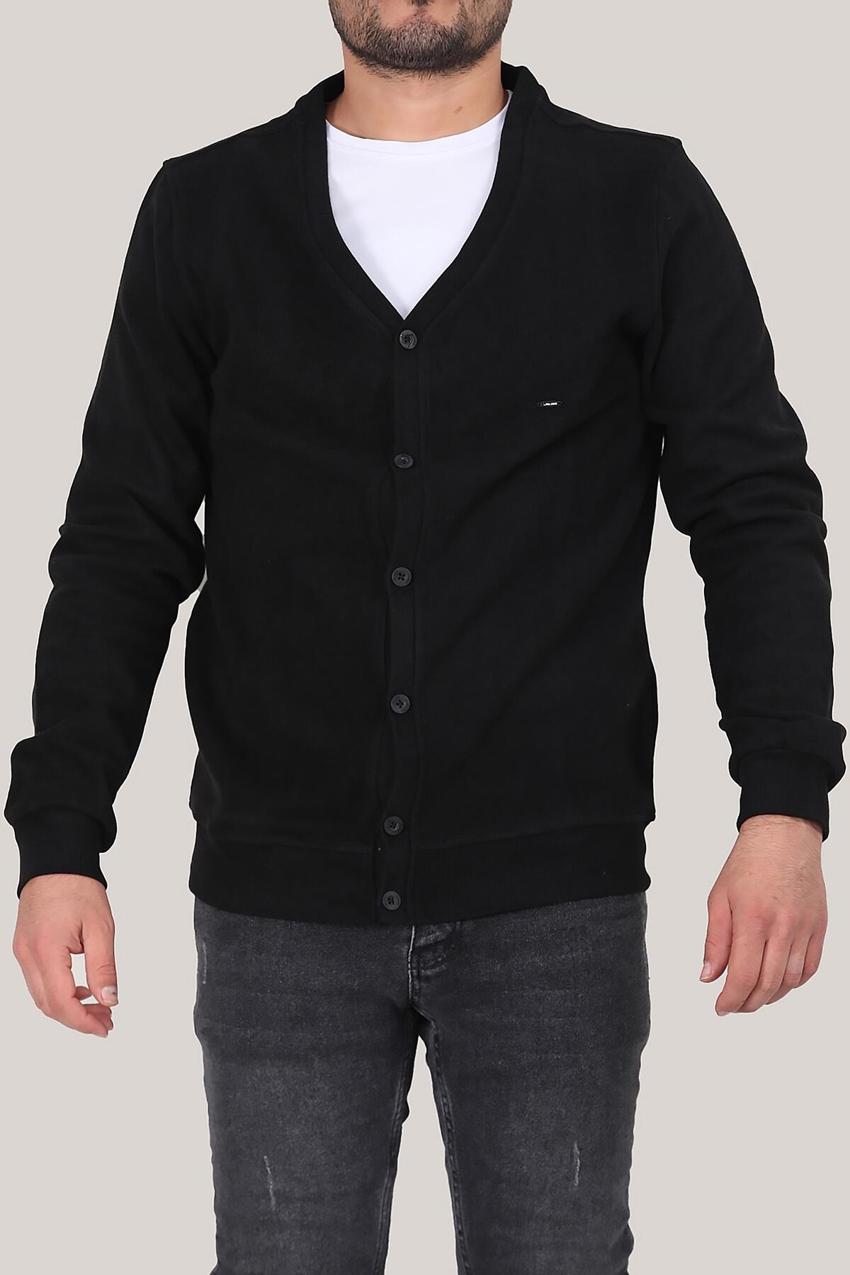 Erkek V Yaka Düğmeli Kadife Hırka Siyah