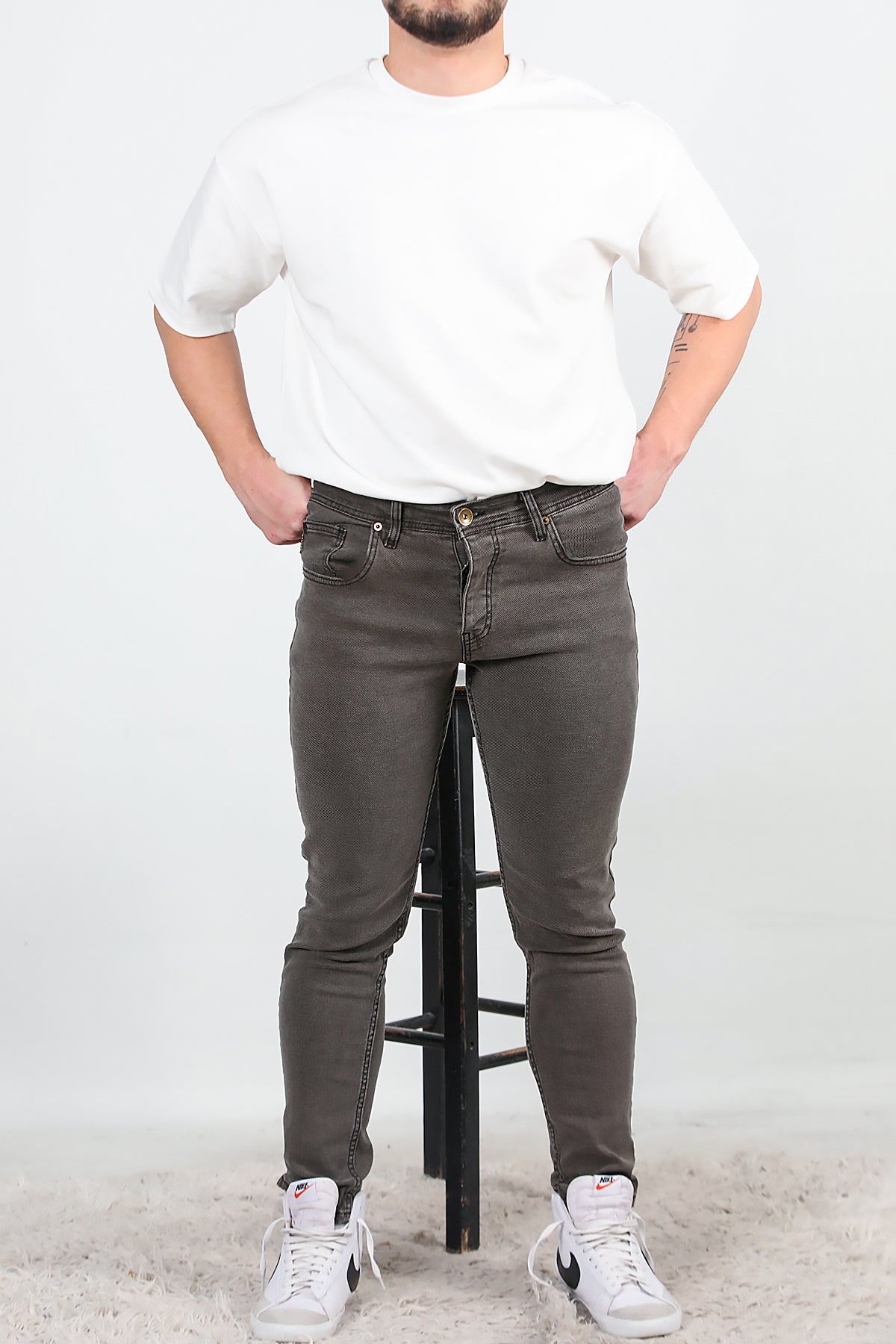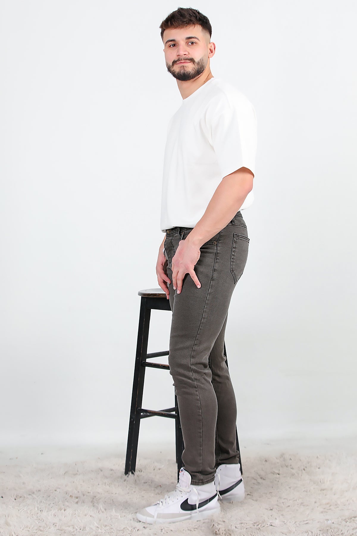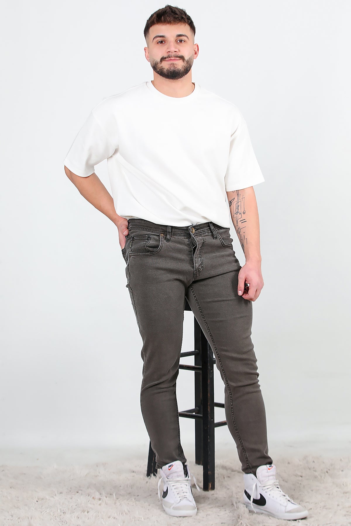 MODEL BİLGİLERİ Boy: 181 cm Omuz: 128 cm Göğüs: 114 cm Bel: 98 cm Kalça: 116 cm