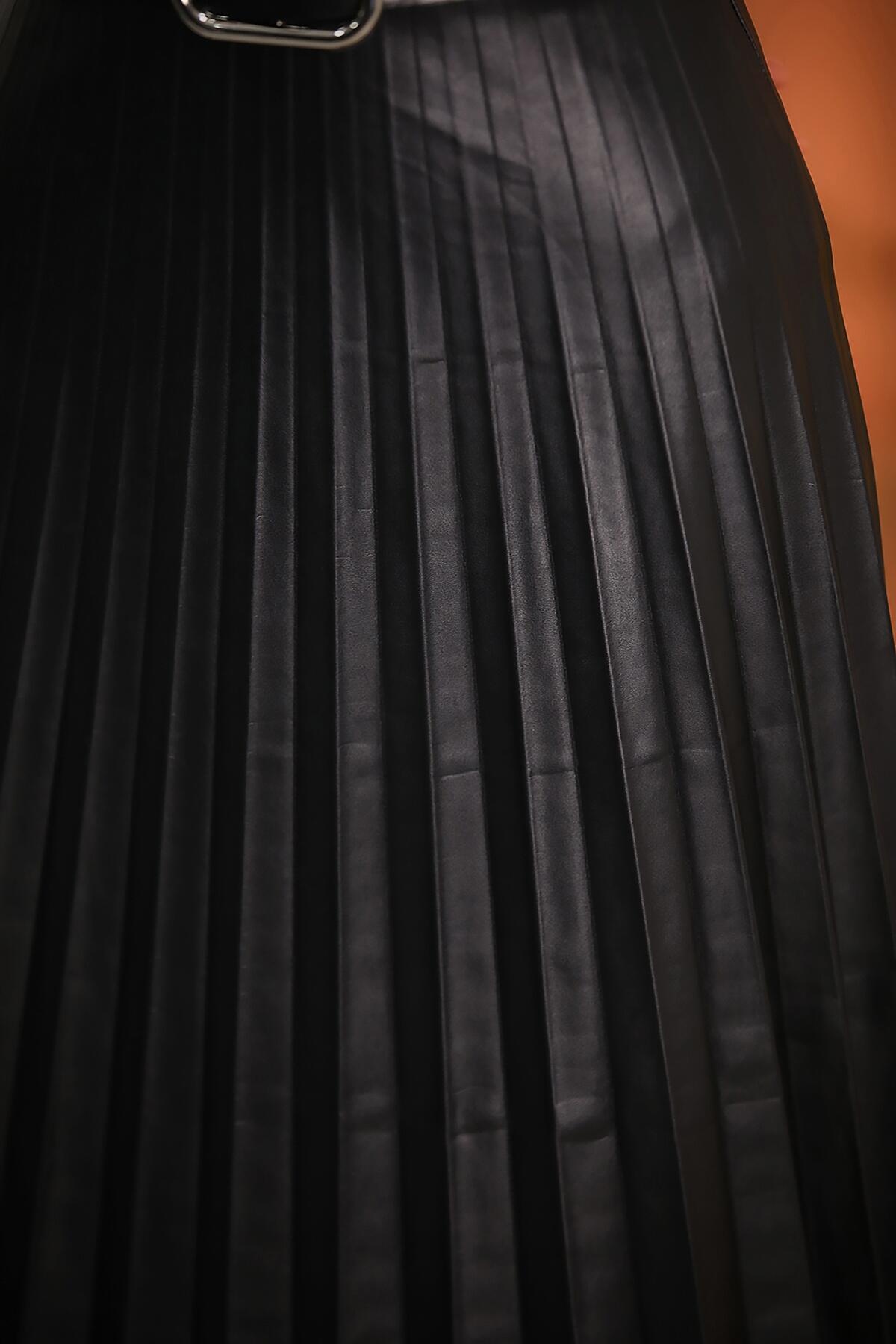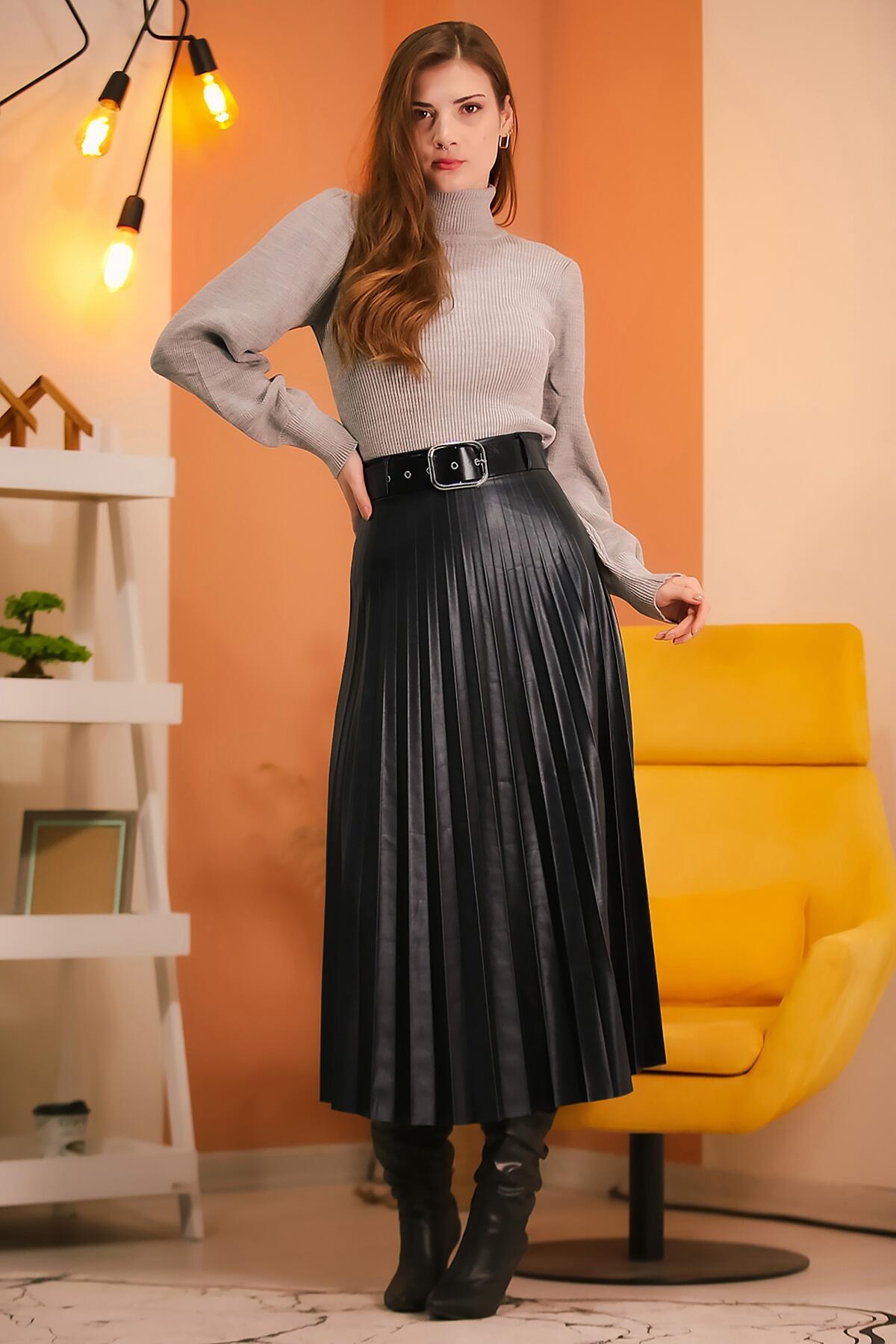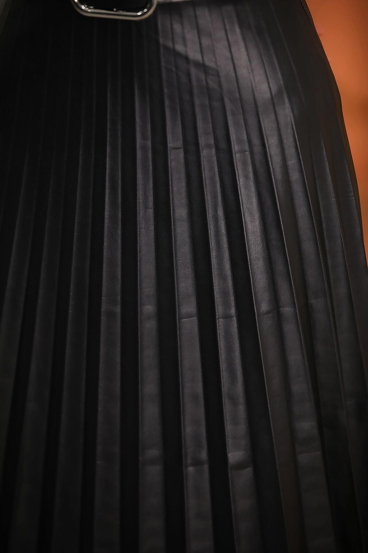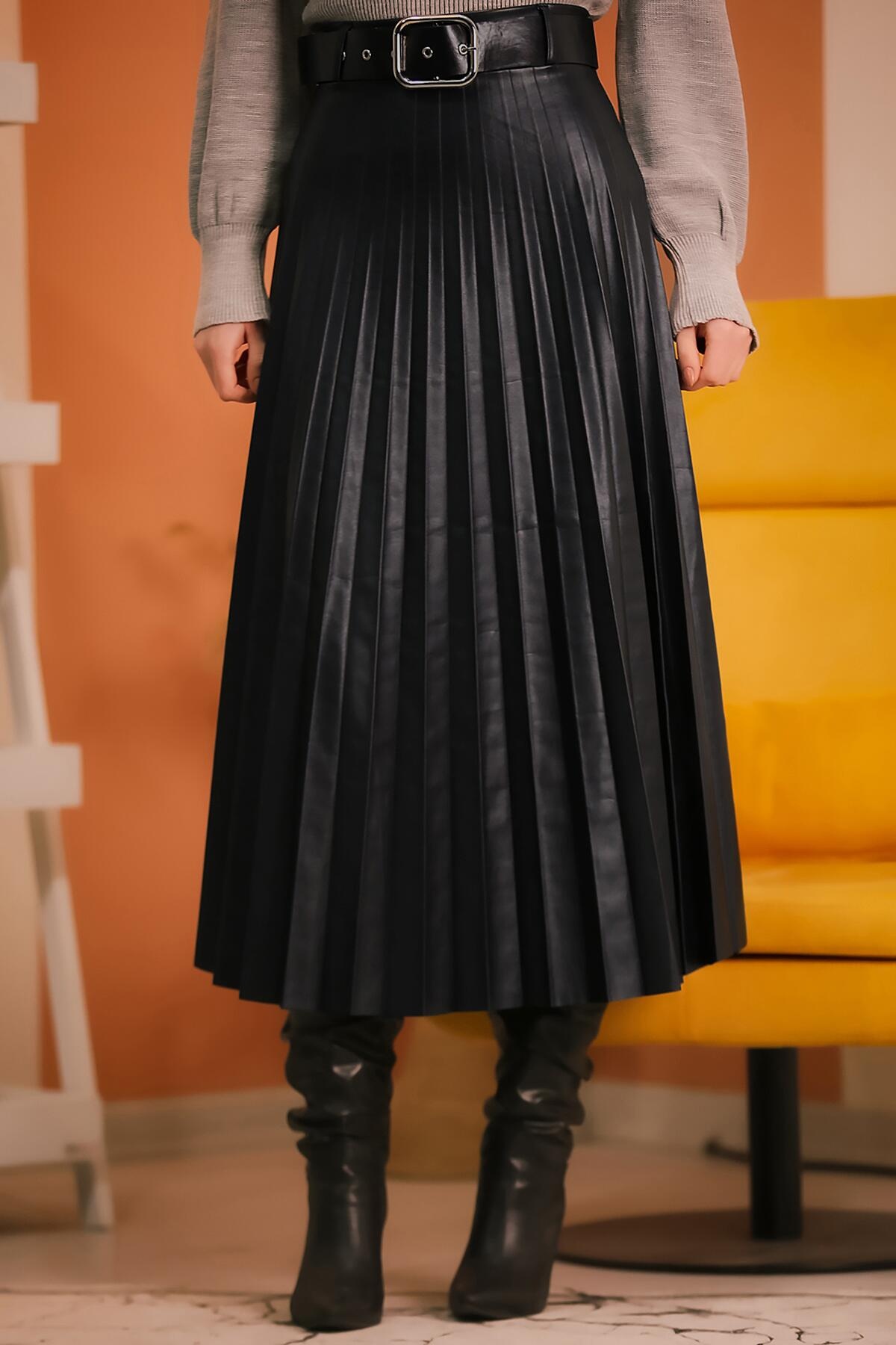 Kadın Midi Boy Kemerli Piliseli Deri Etek Siyah