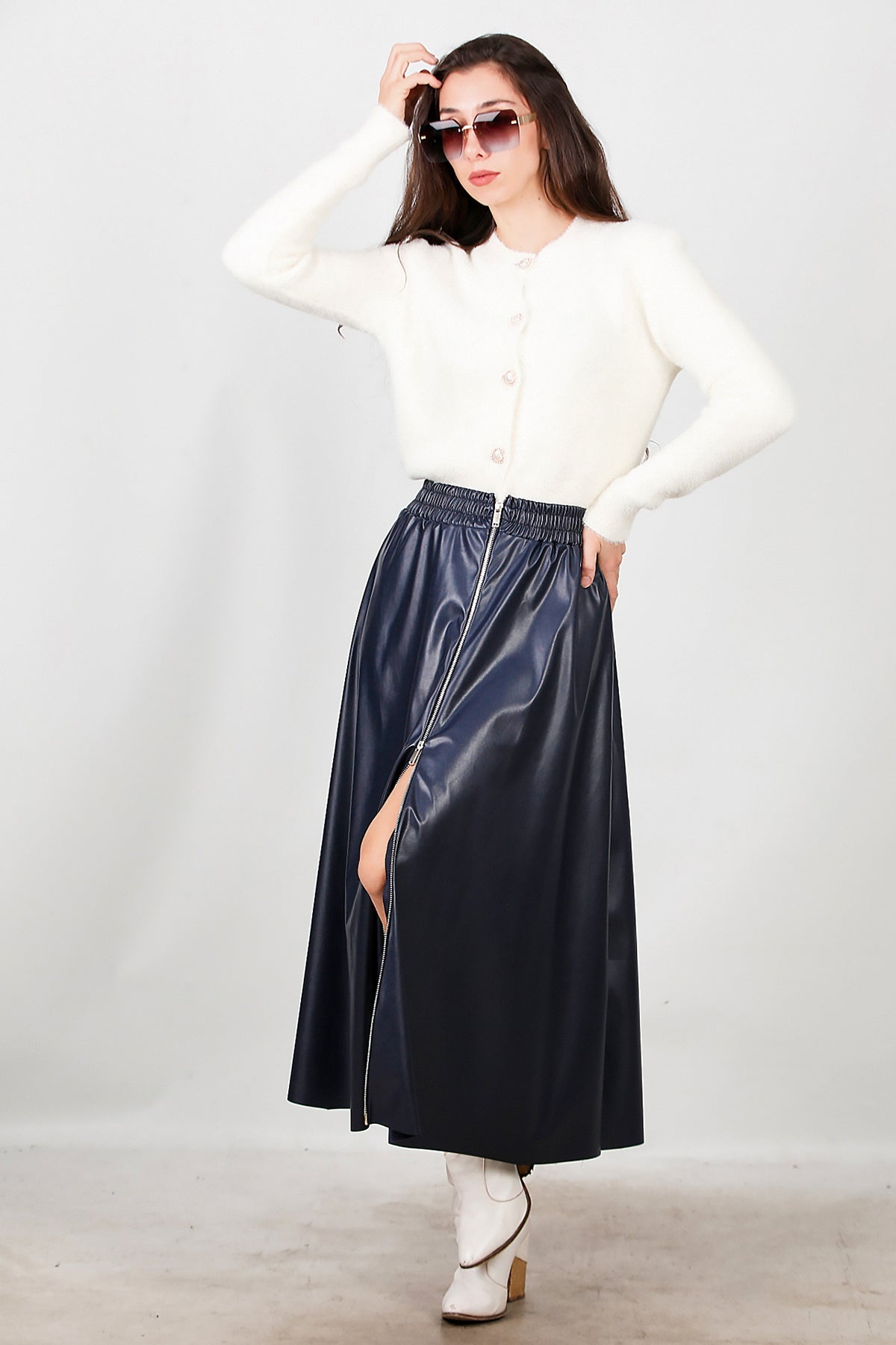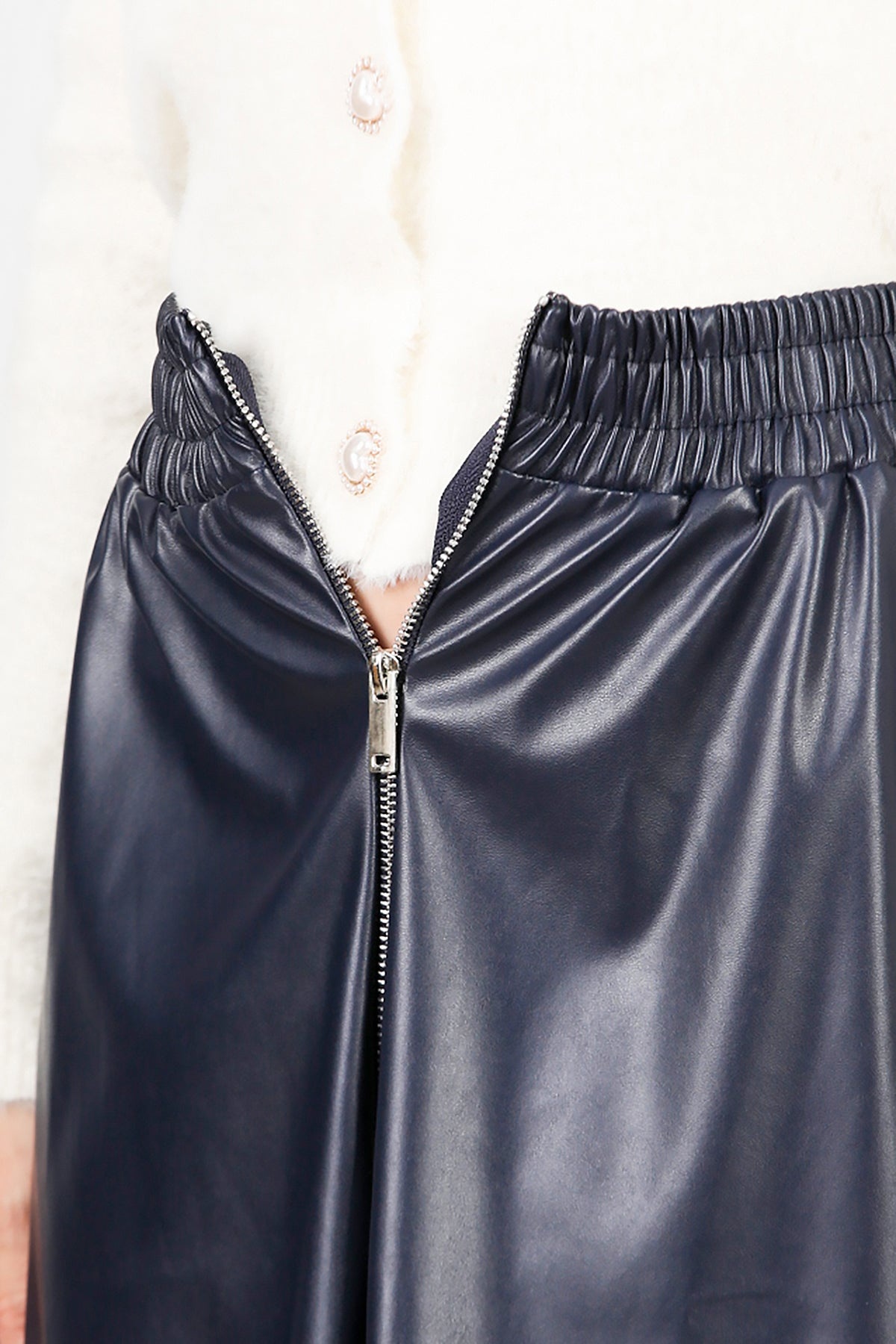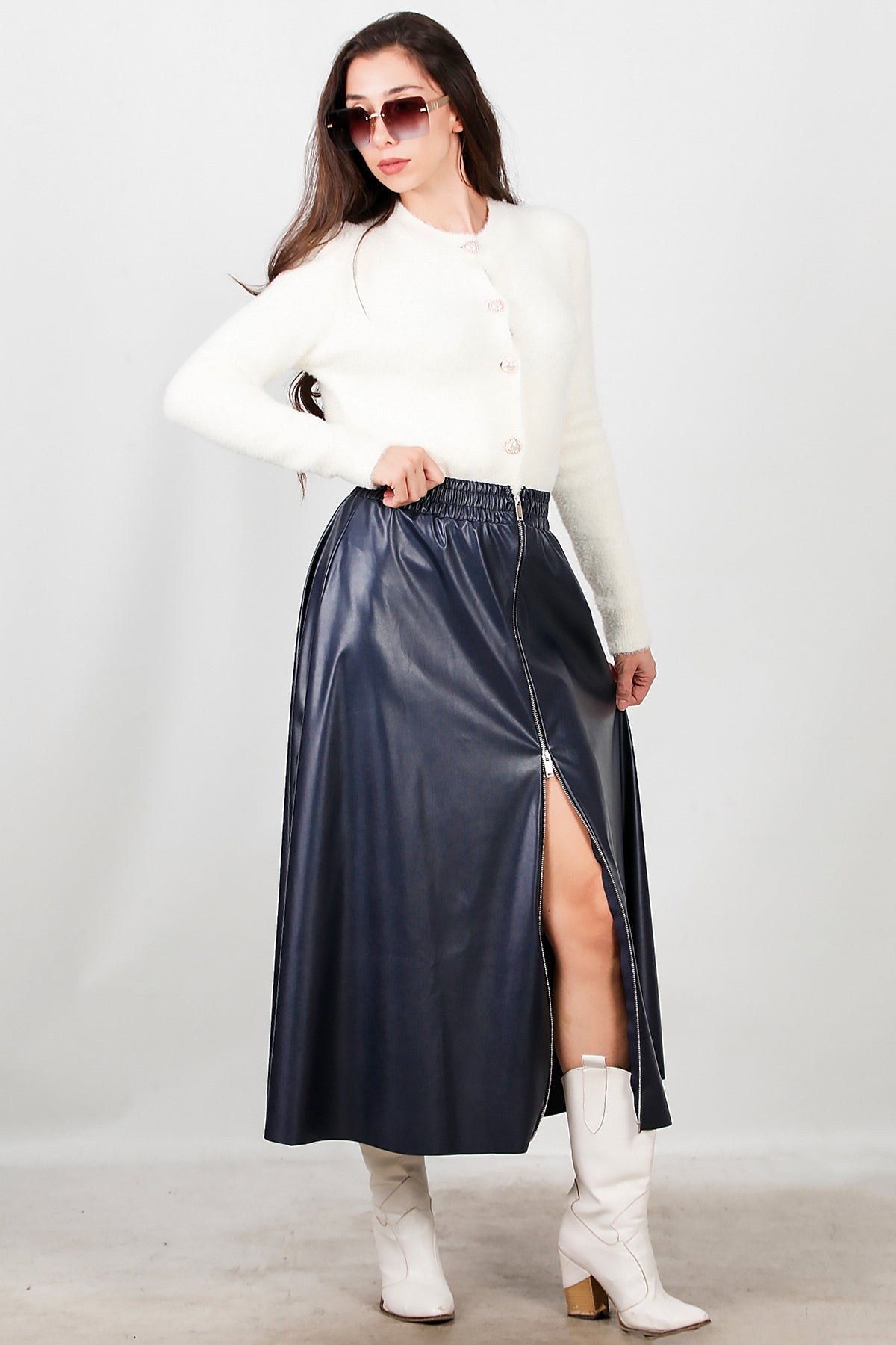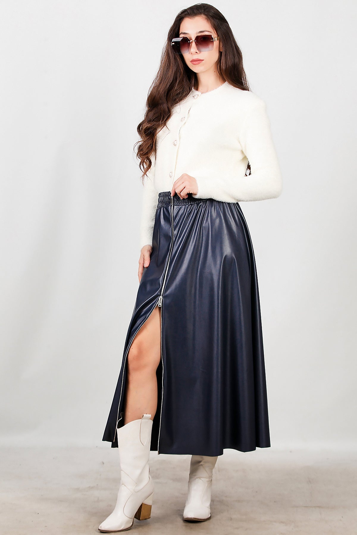 Kadın Önü Fermuarlı Deri Etek Lacivert