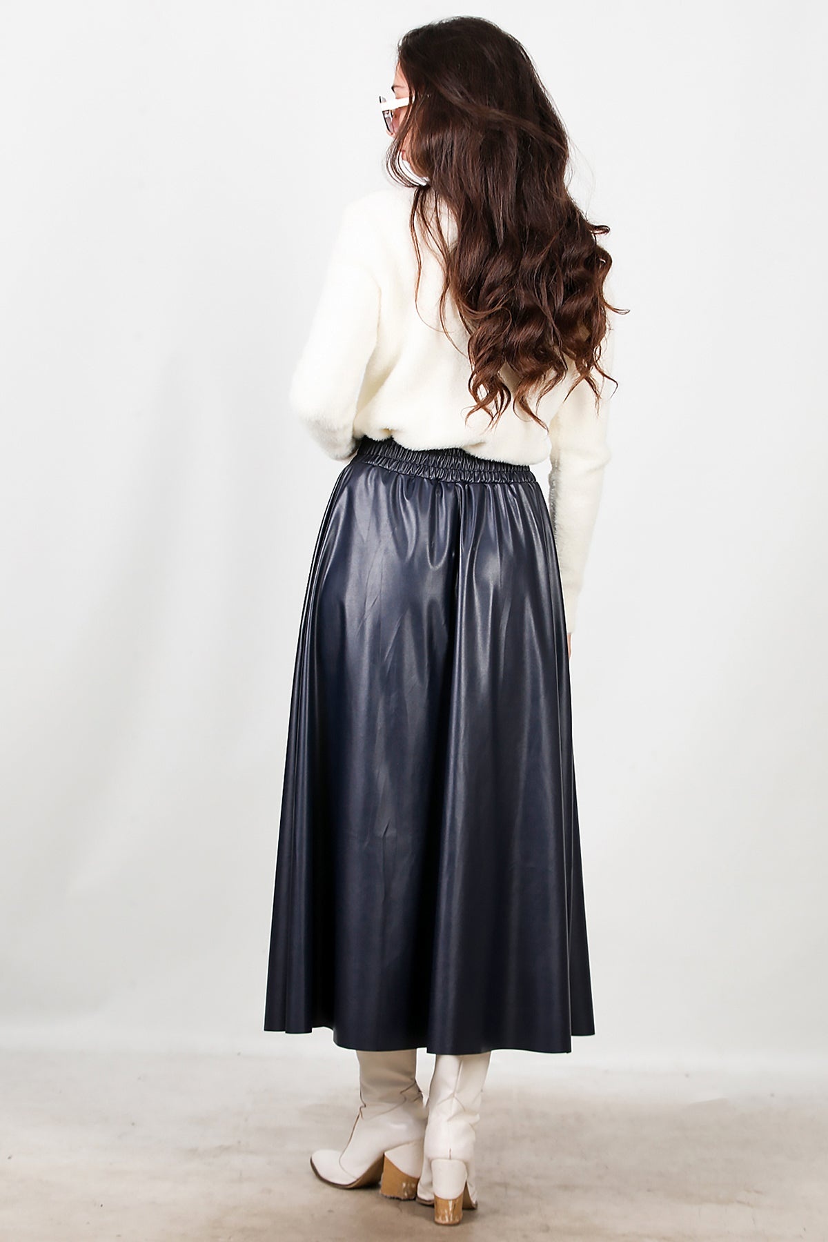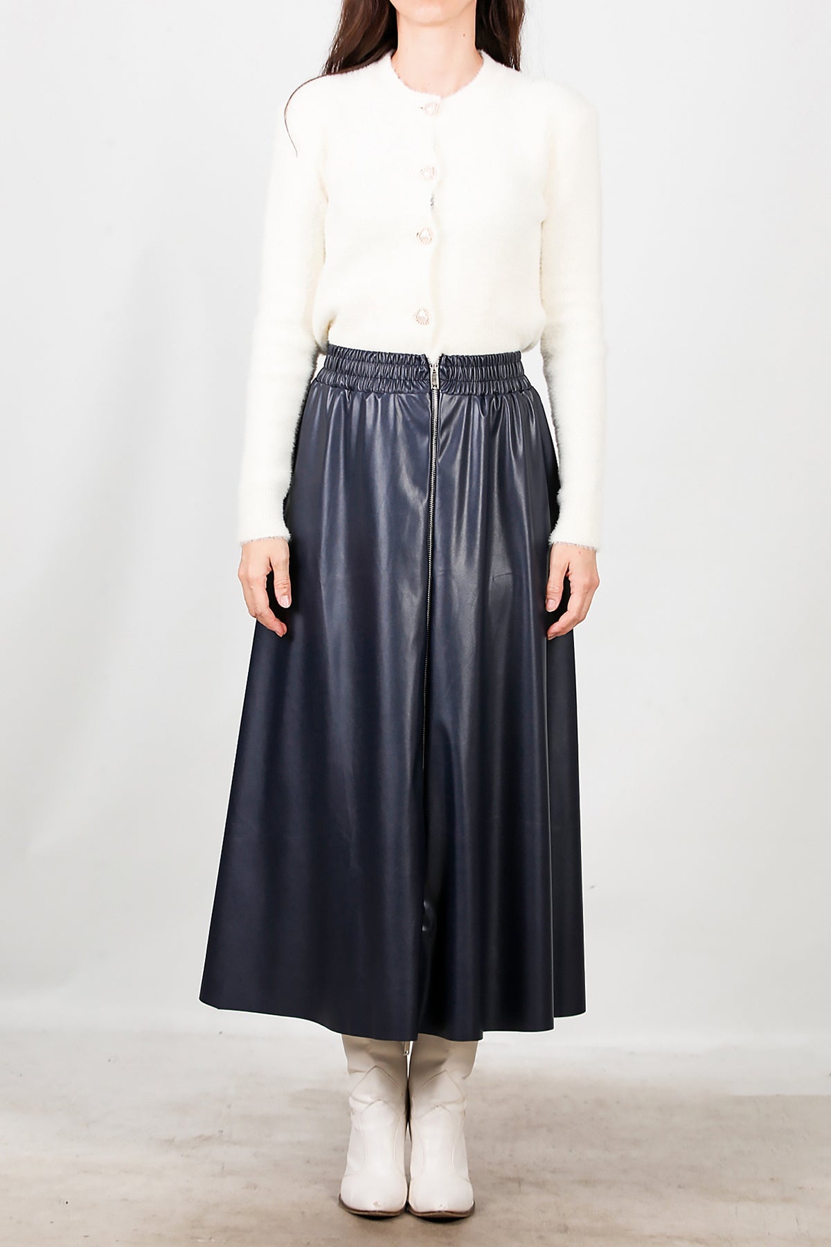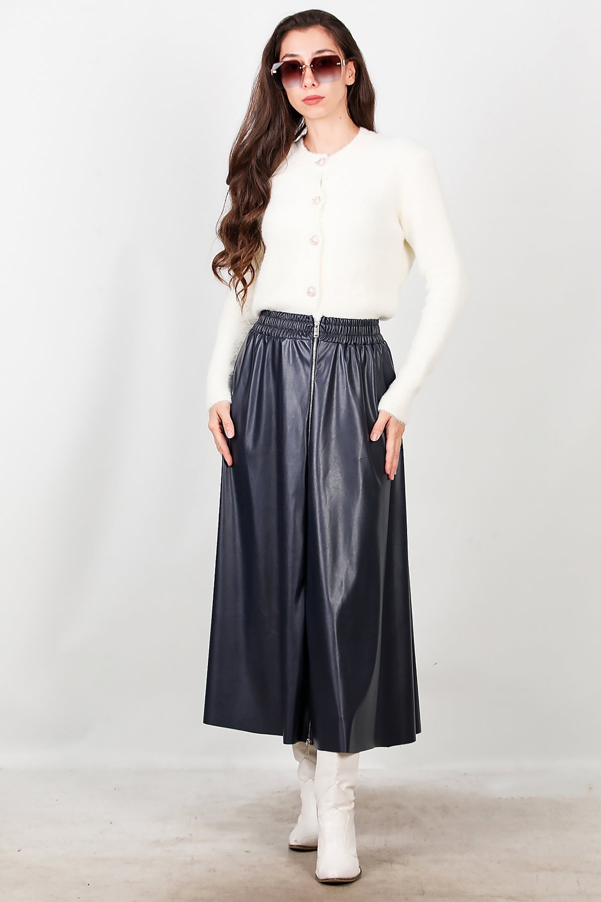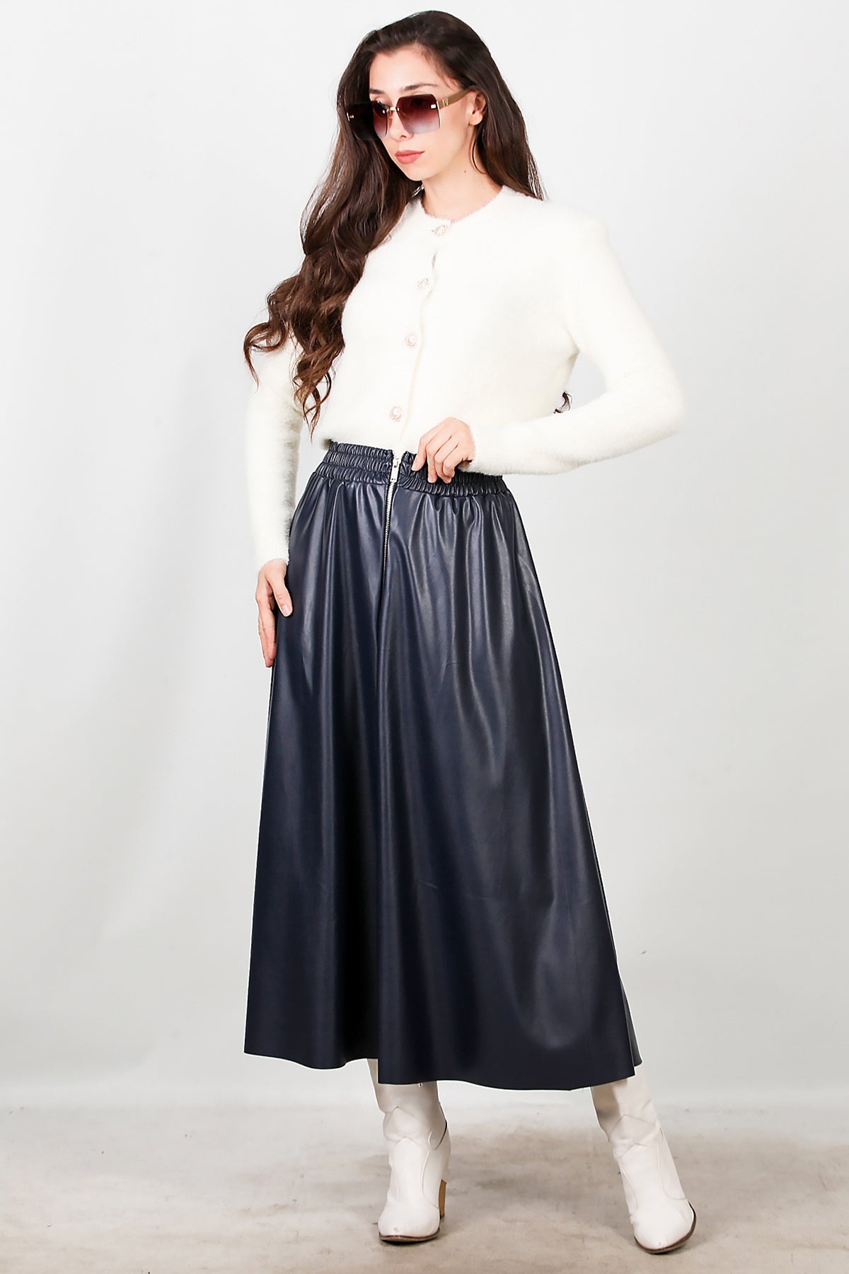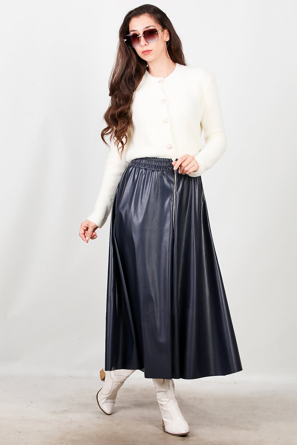 Kadın Önü Fermuarlı Deri Etek Lacivert