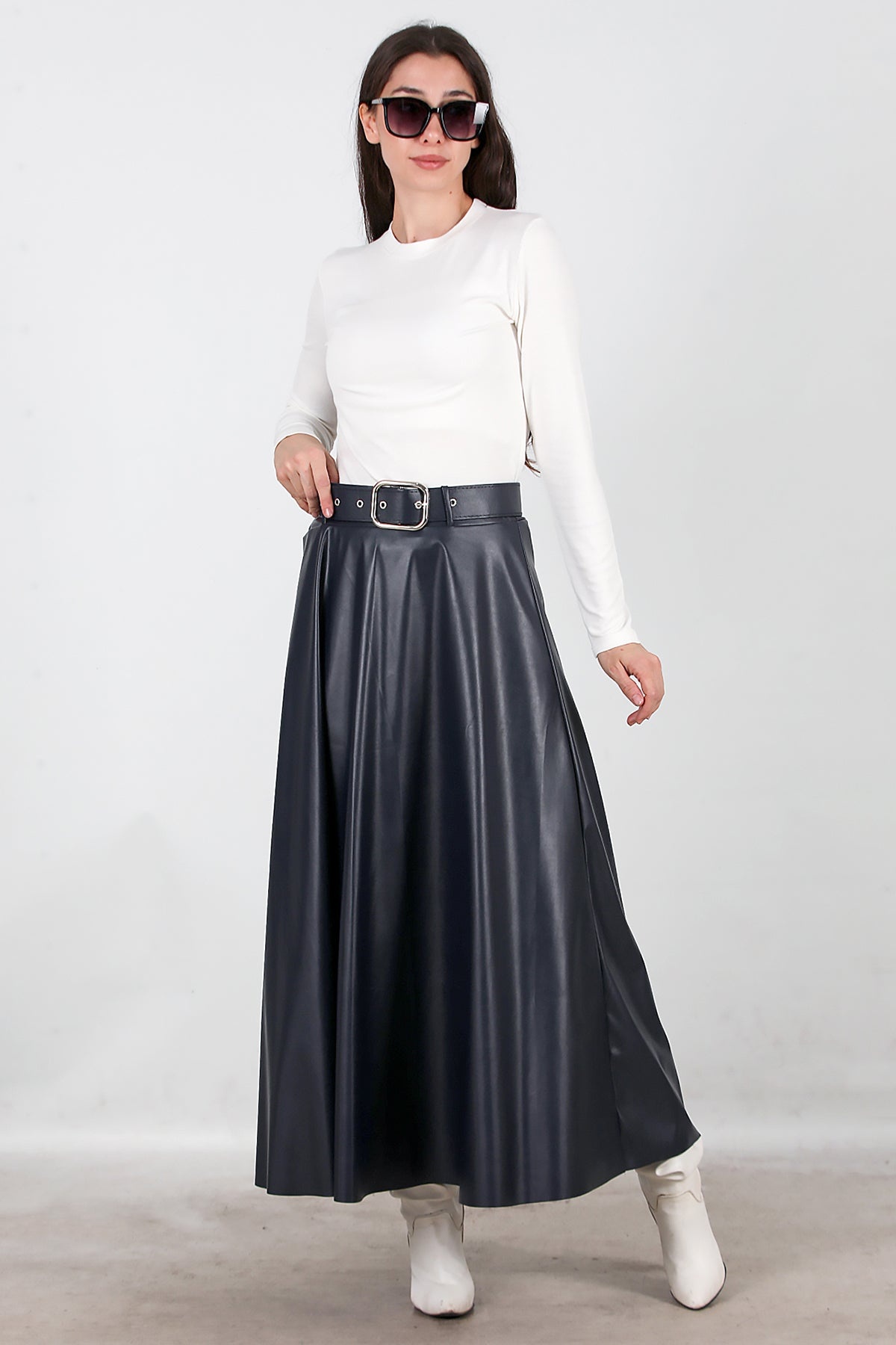Kadın Uzun Kemerli Deri Etek Lacivert
