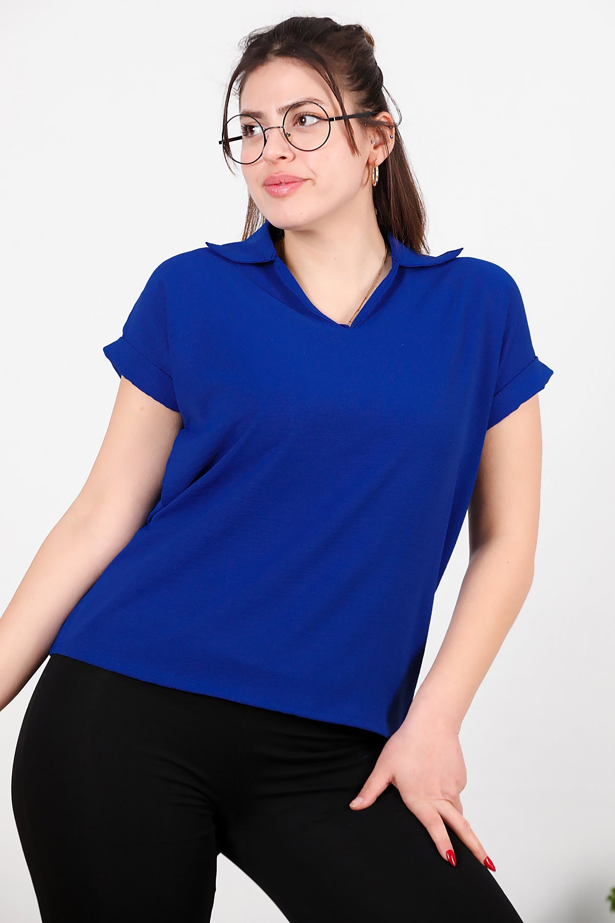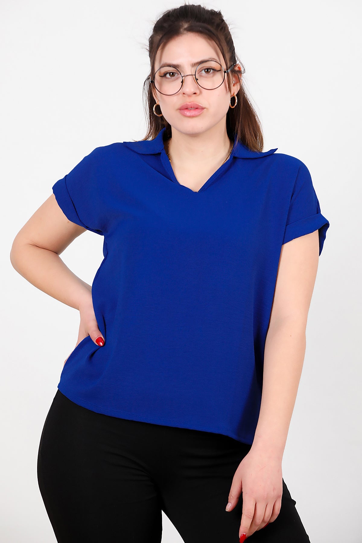 Büyük Beden Ayrobin V Yaka Yakalı Bluz Saks