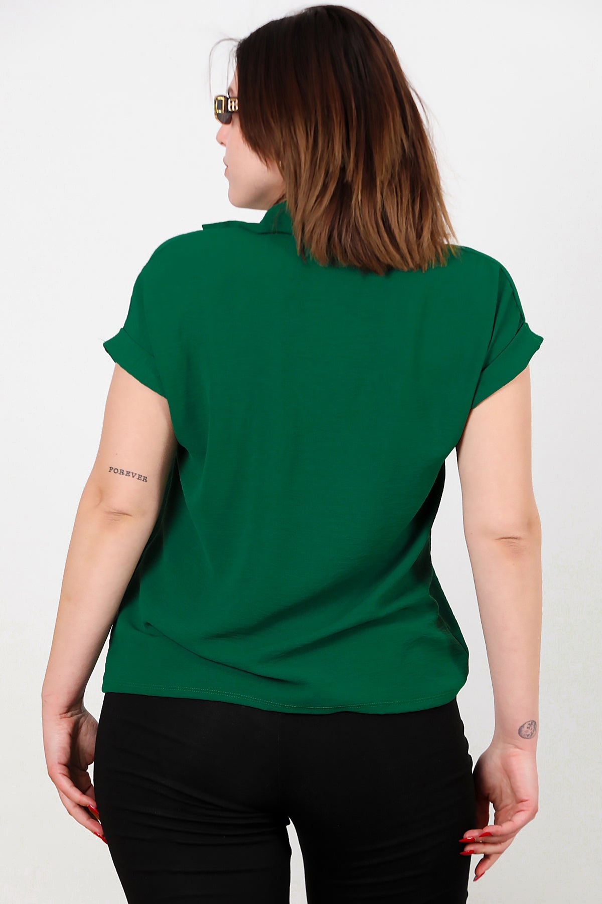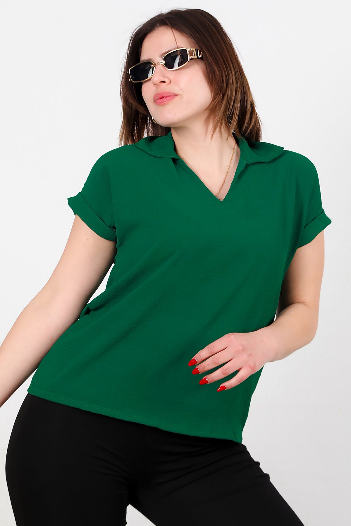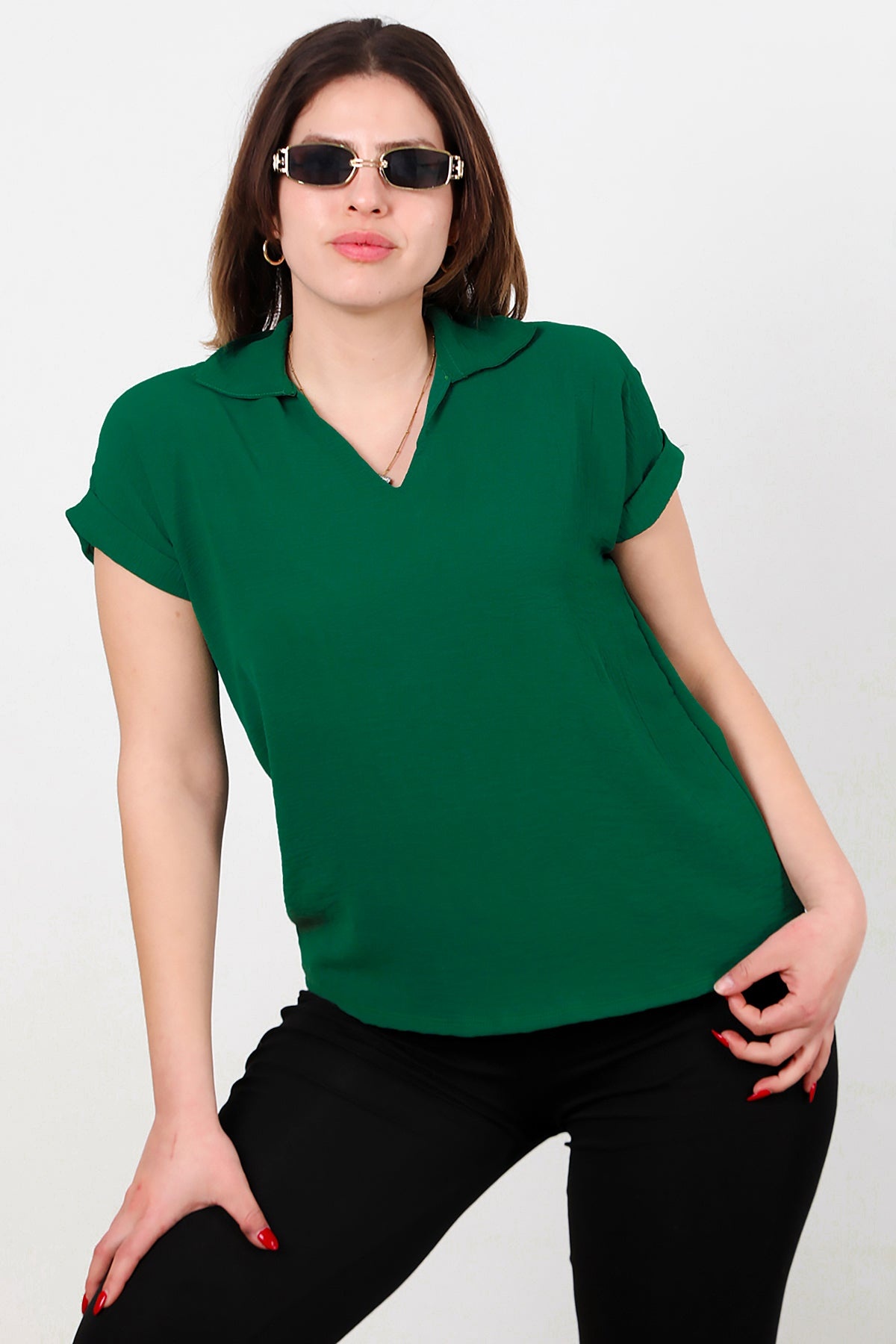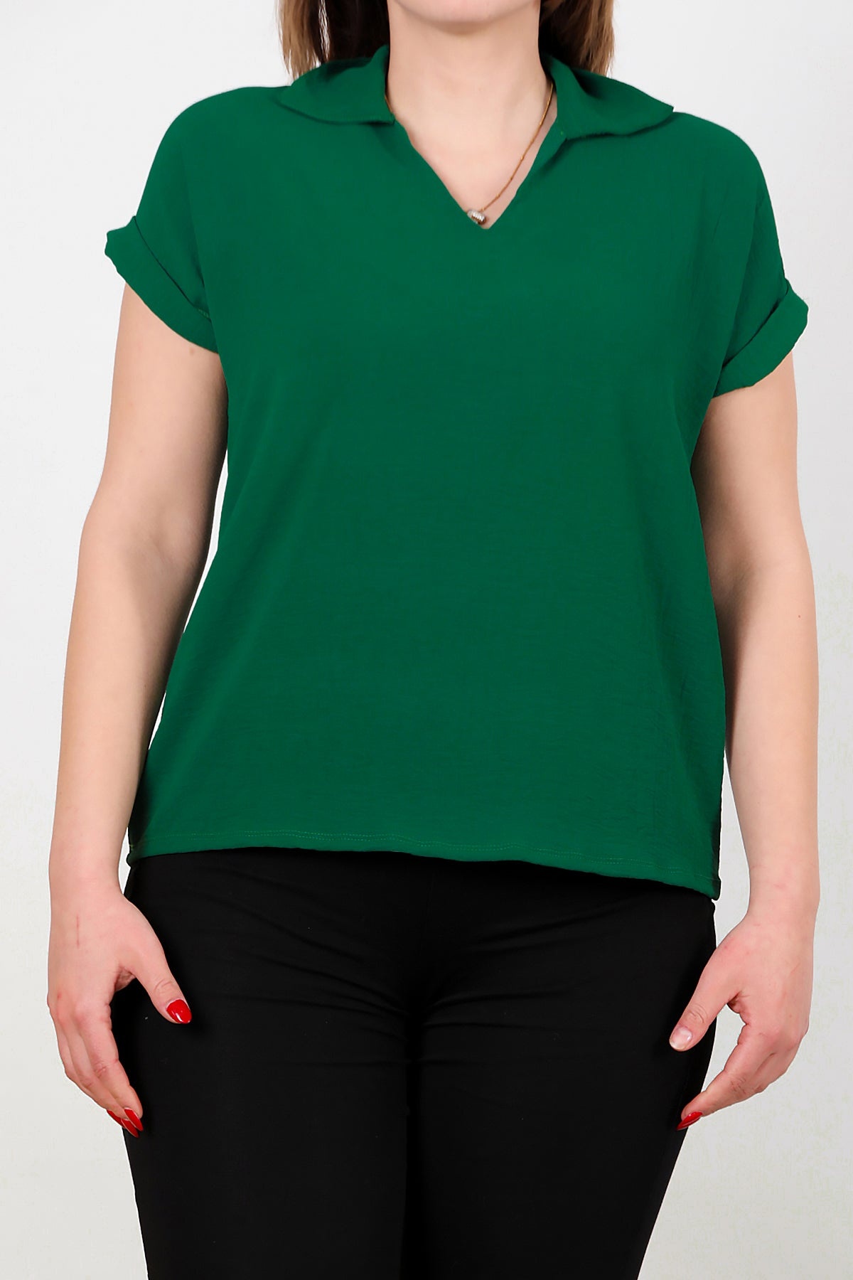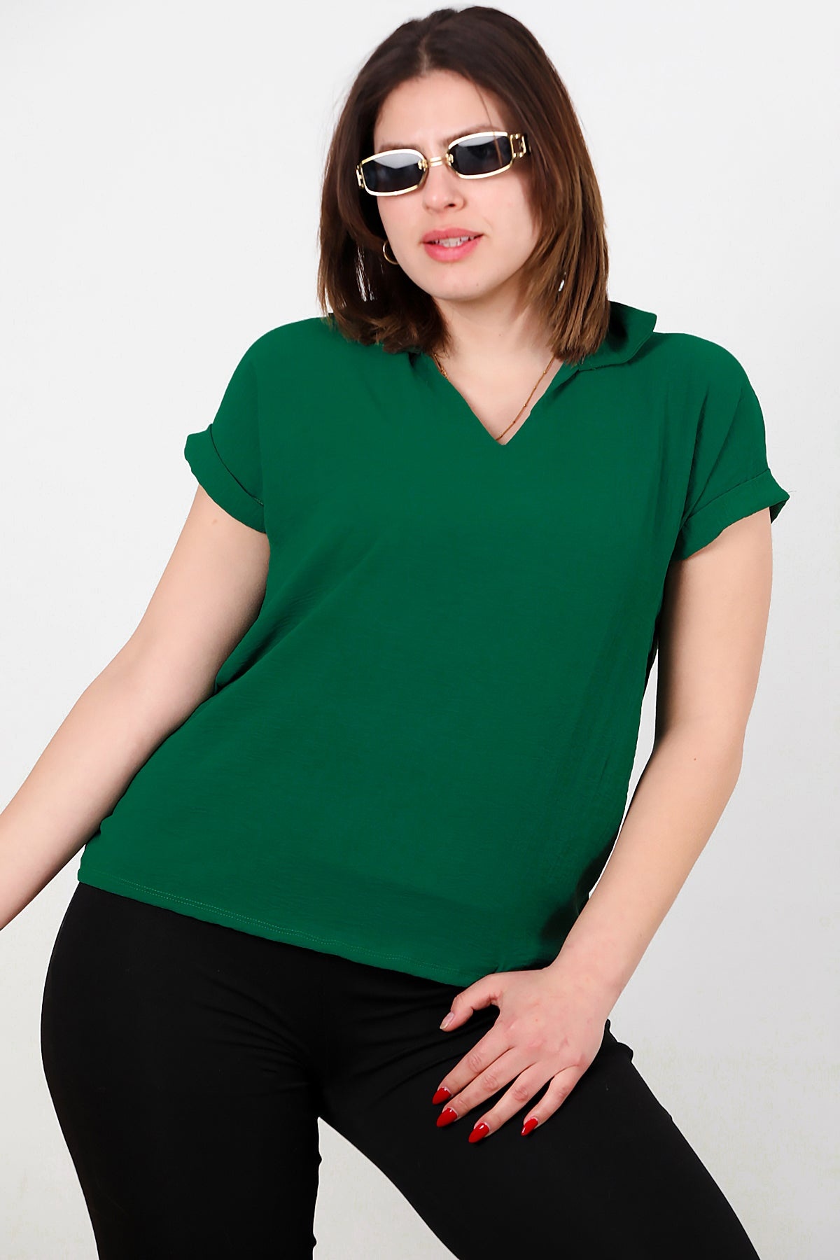 Büyük Beden Ayrobin V Yaka Yakalı Bluz Zümrüt