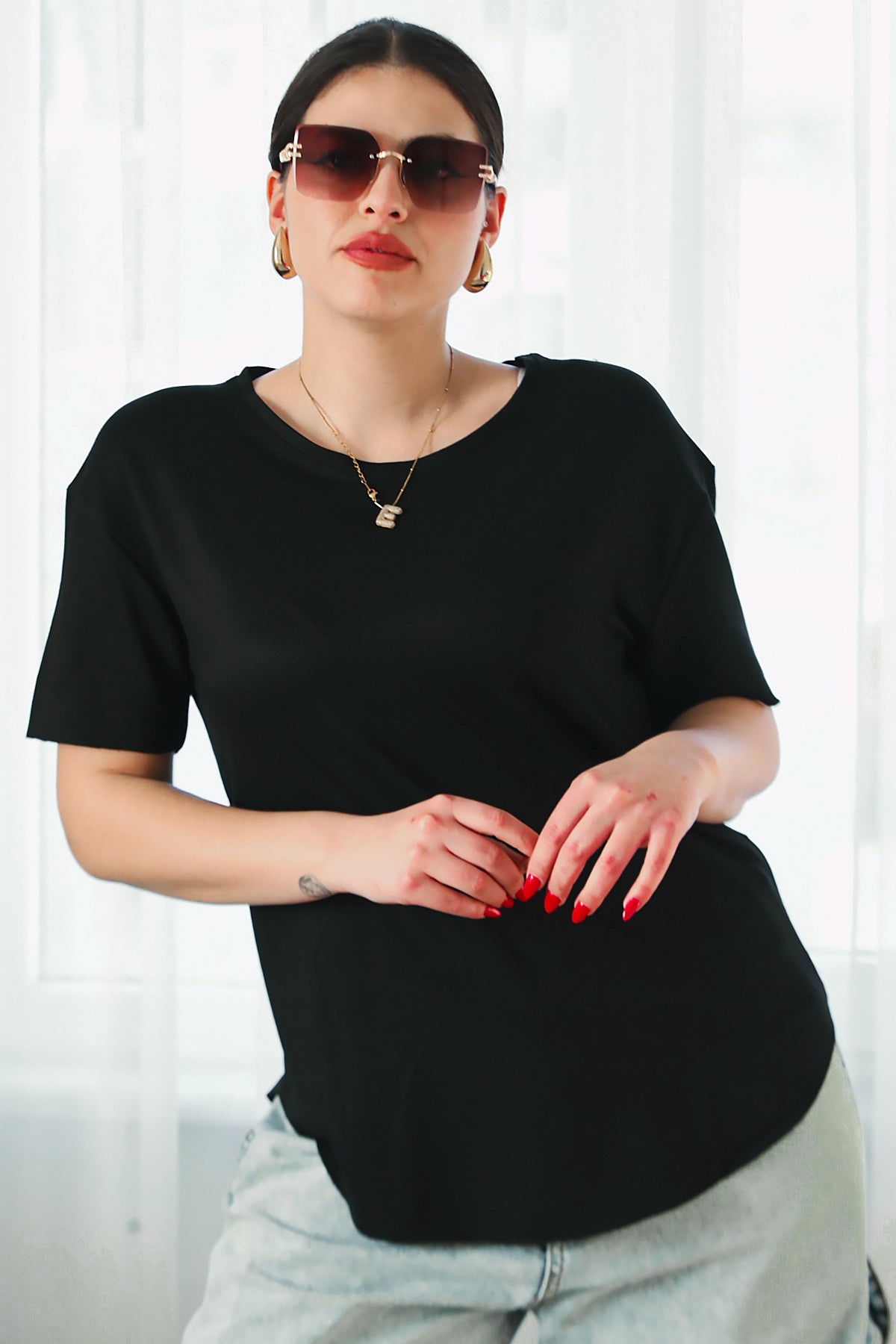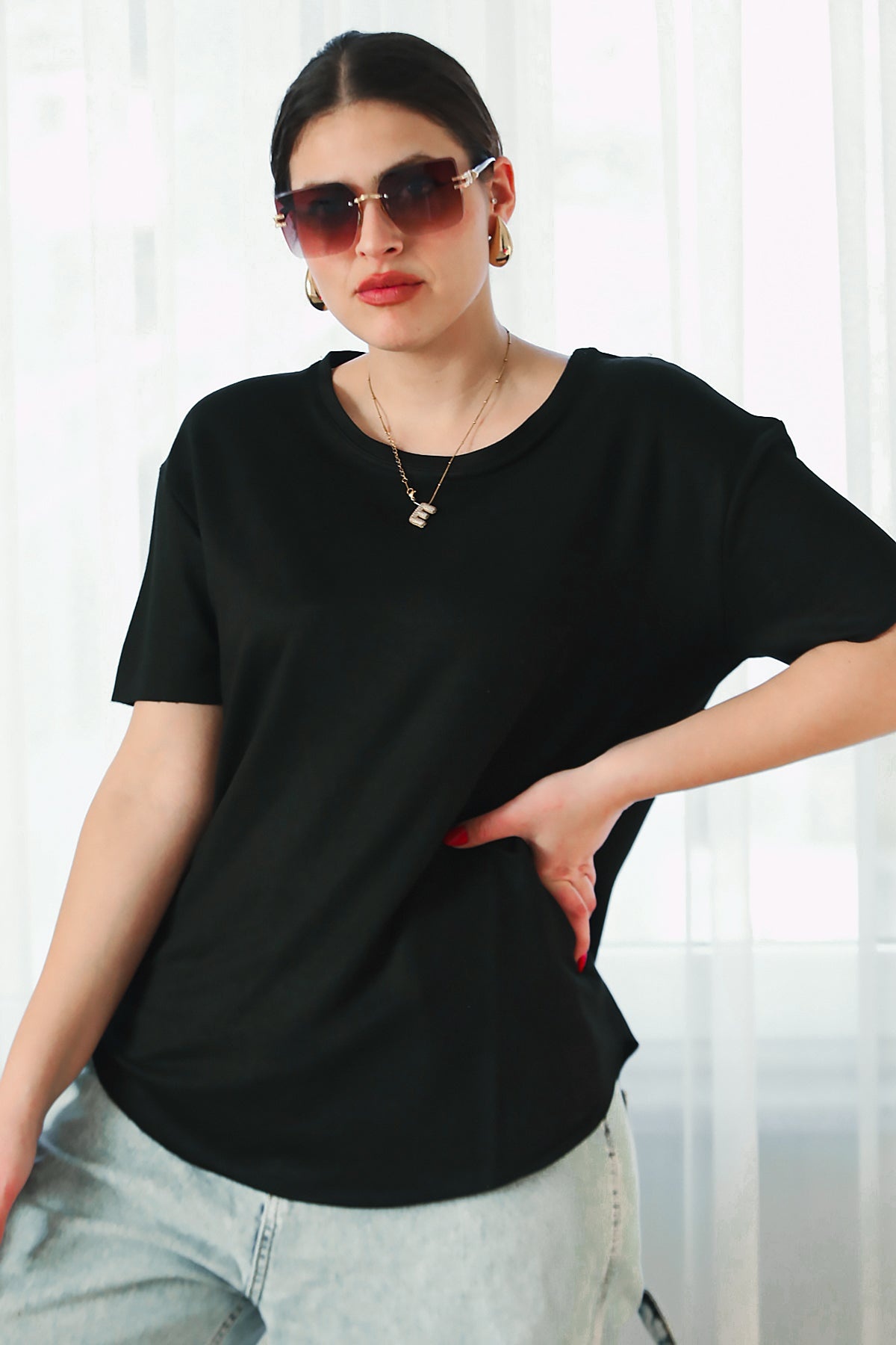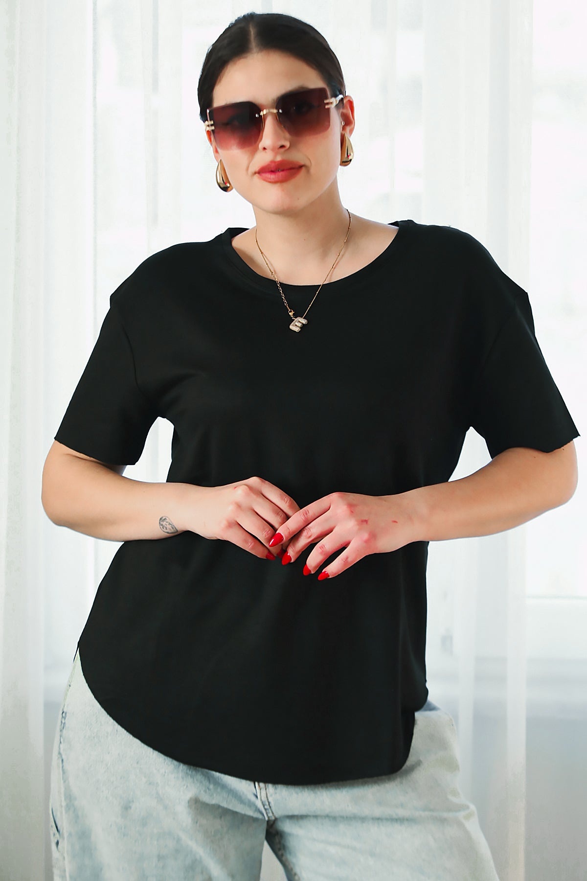 Büyük Beden Eteği Oval Bisiklet Yaka Tshırt Siyah